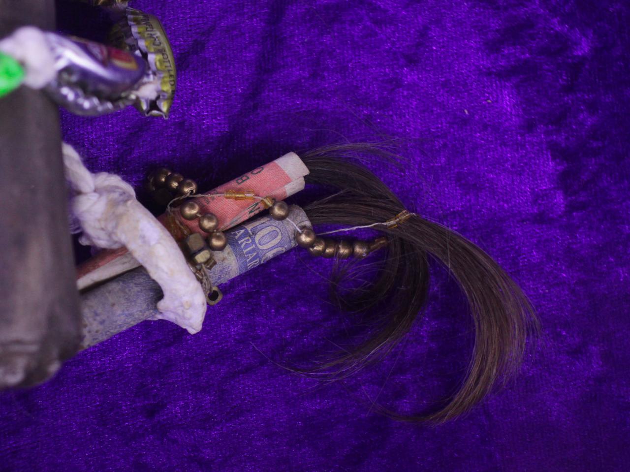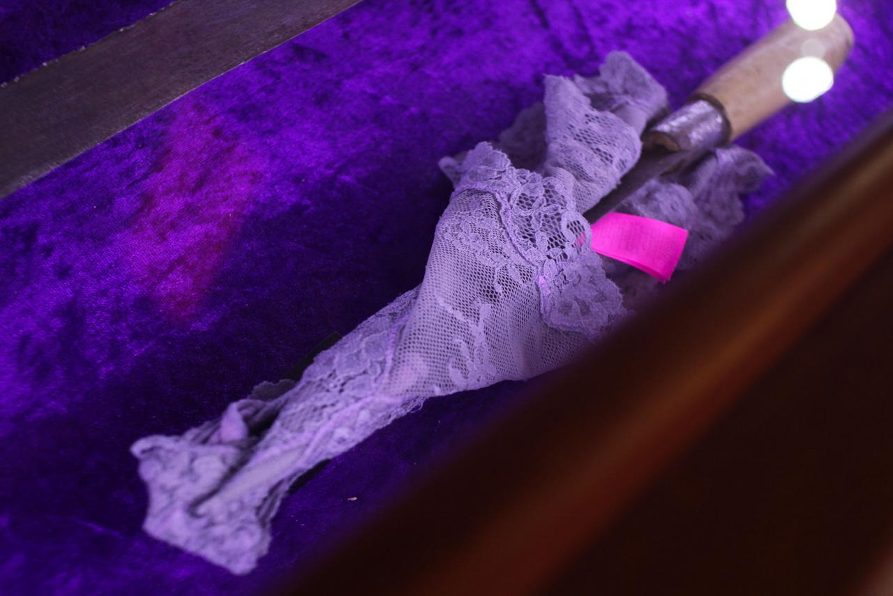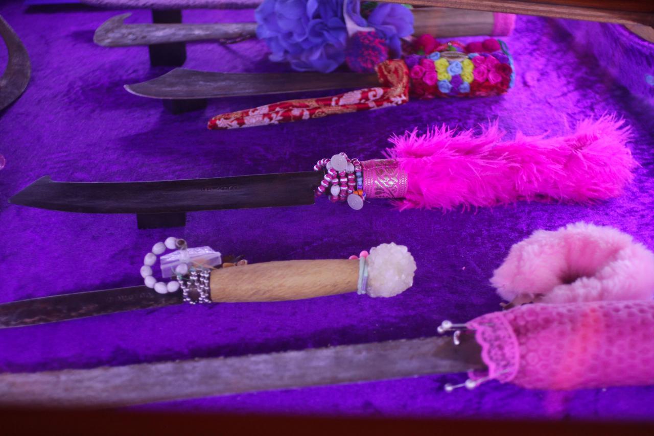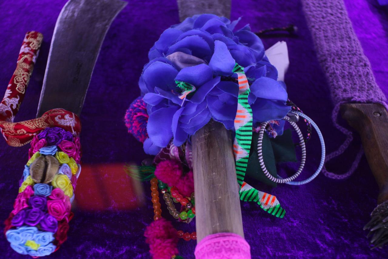 Installation de sculptures sous vitrine, machettes, tissu, latex, cire, graines, coquillages, 80 x 120 cm.