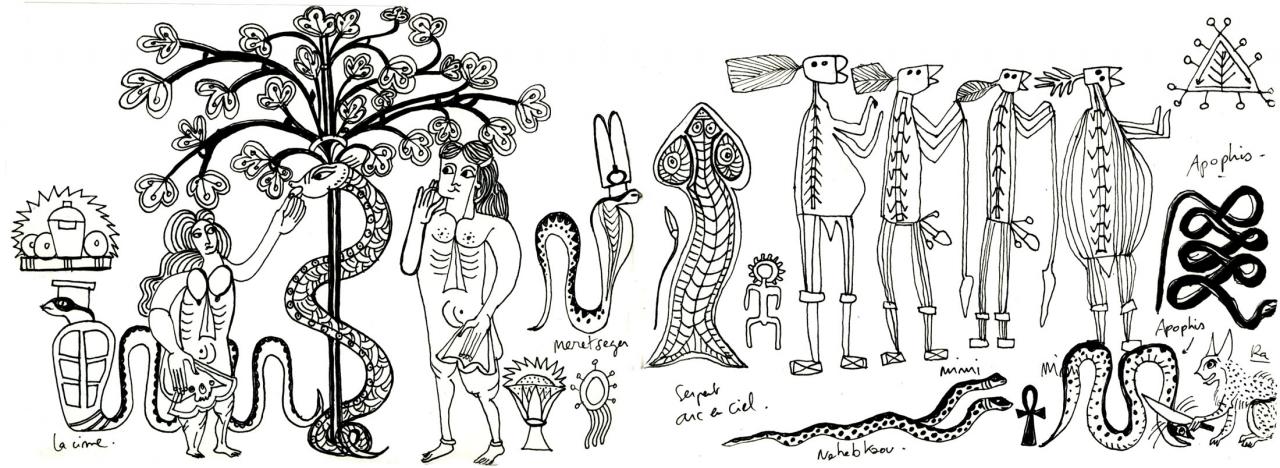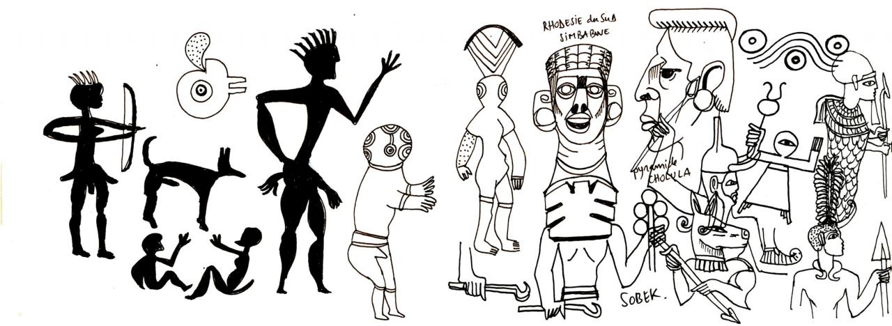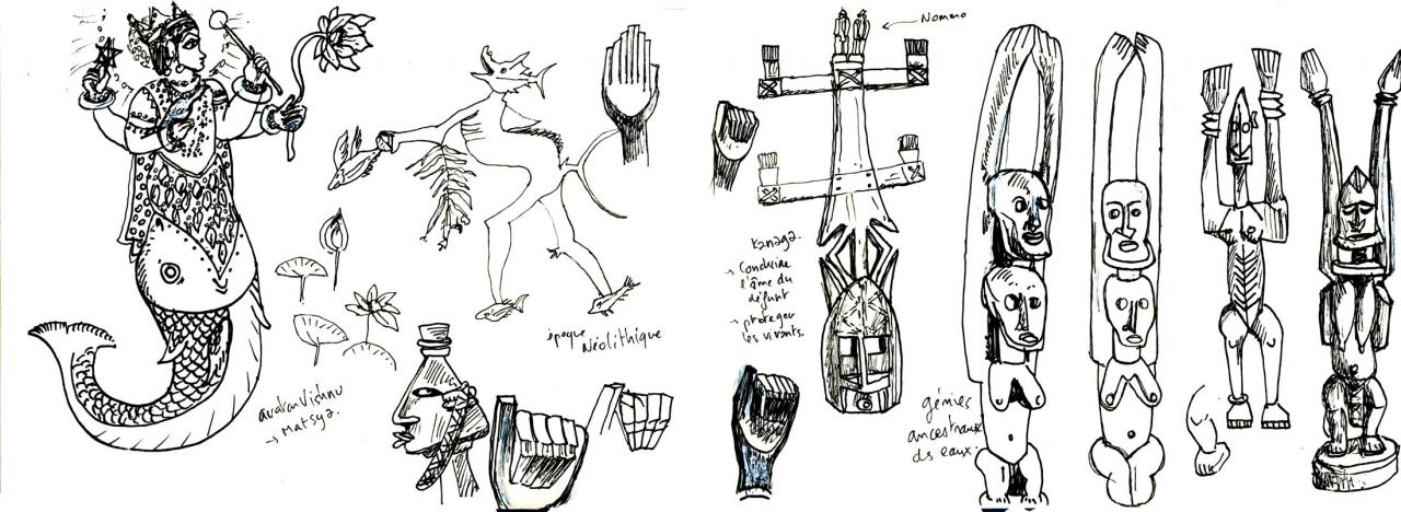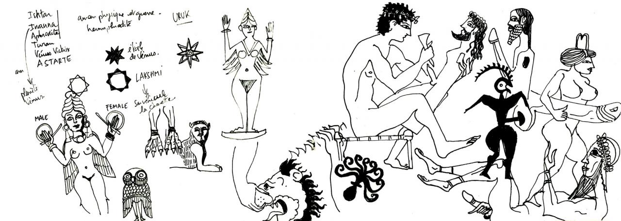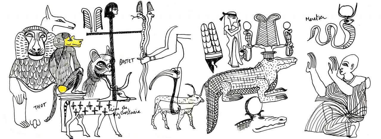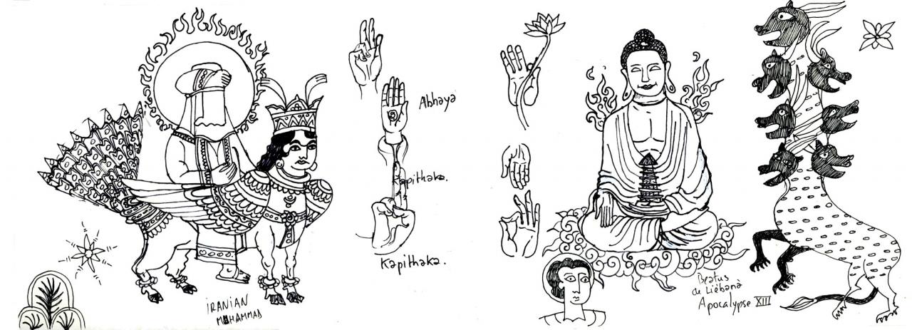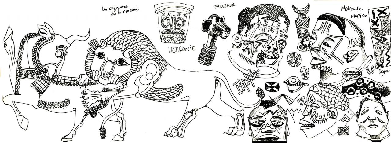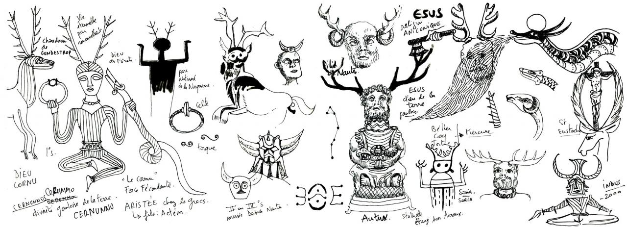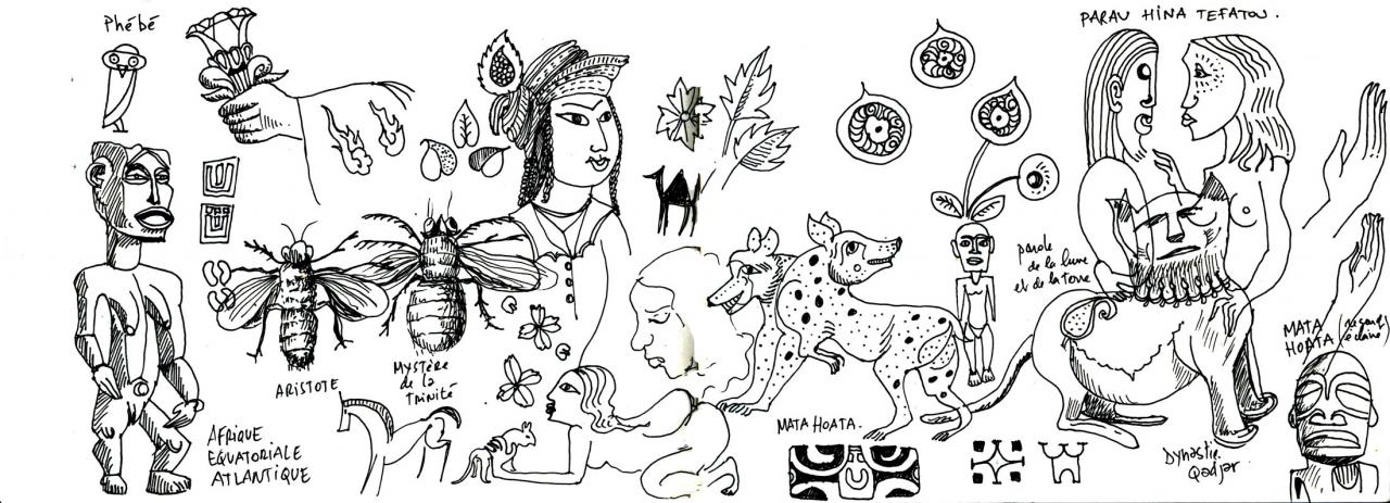 « Le mythe est-il un mensonge ? Le Mythomane est dit menteur avéré et d’une grande imagination. La mythomanie est censée, quant à elle, relever de la folie. Une mythomanie serait le recours systématique aux mythes. Il y a là un glissement de sens, pour définir une pathologie. Dans une recherche d’universalisme entre époque, culture et géographie, cherchant des archétypes, ce travail de dessin entre prise de notes et travail de copiste, permet un télescopage de figurations et de symbolismes divers, créant ainsi des passerelles de lectures plurielles. Le graphisme par le biais du trait spontané d’une même main mais mêlant différentes influences, joue à brouiller les pistes, comme s’il s’agissait d’un seul auteur, d’une seule époque, d’un seul lieu. Raconter des histoires, des mythes, c’est accepter les variations et les différentes versions d’une réalité lointaine et si proche. »