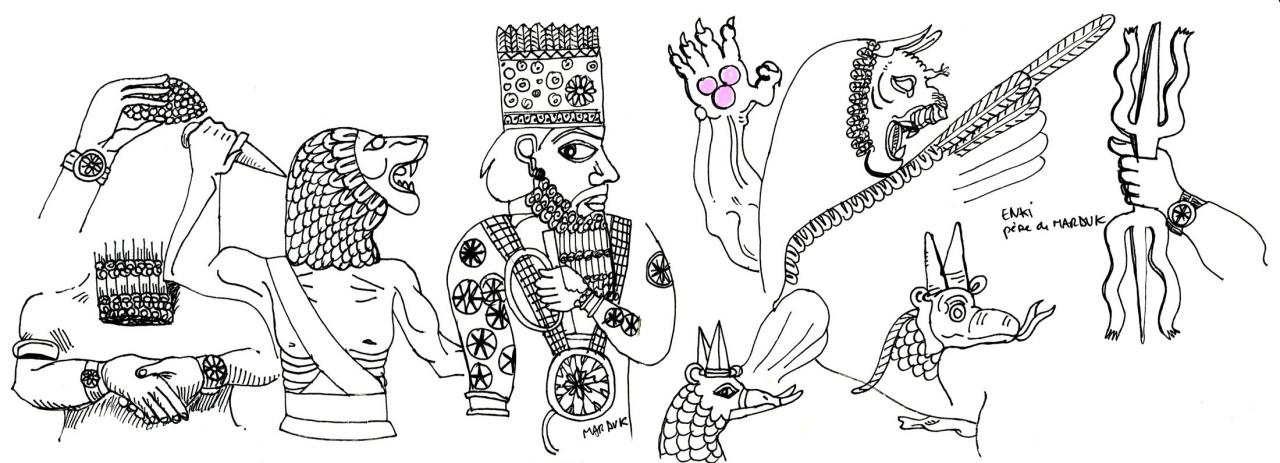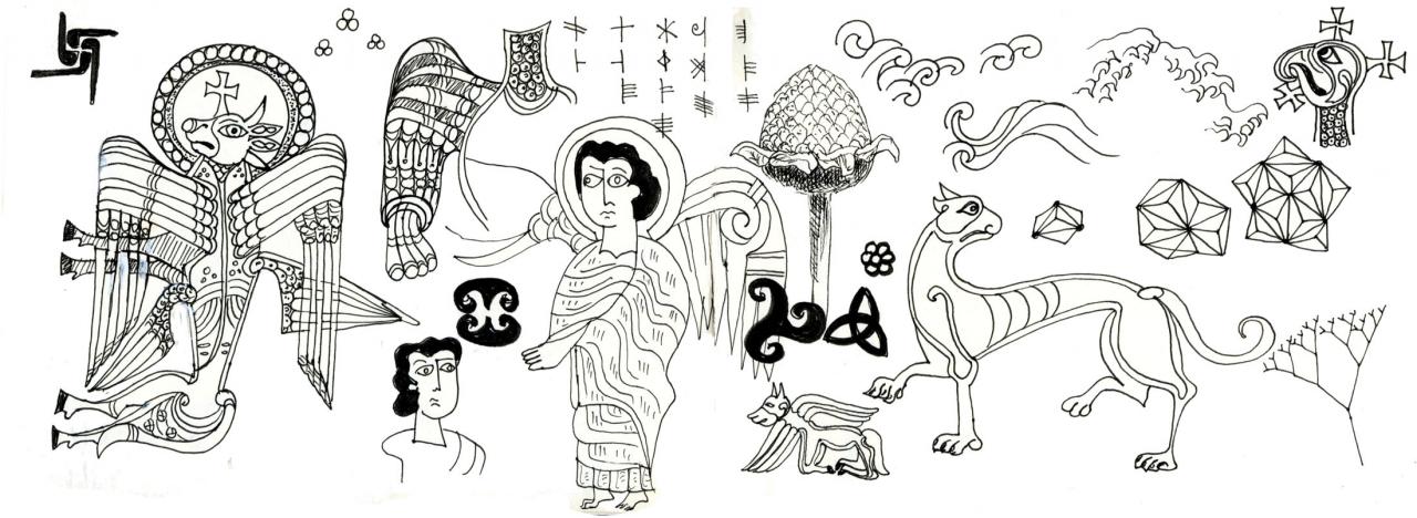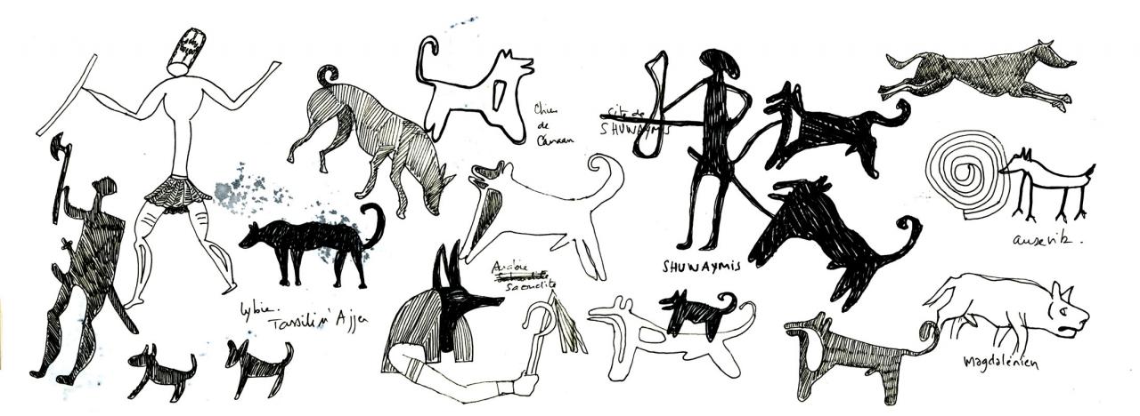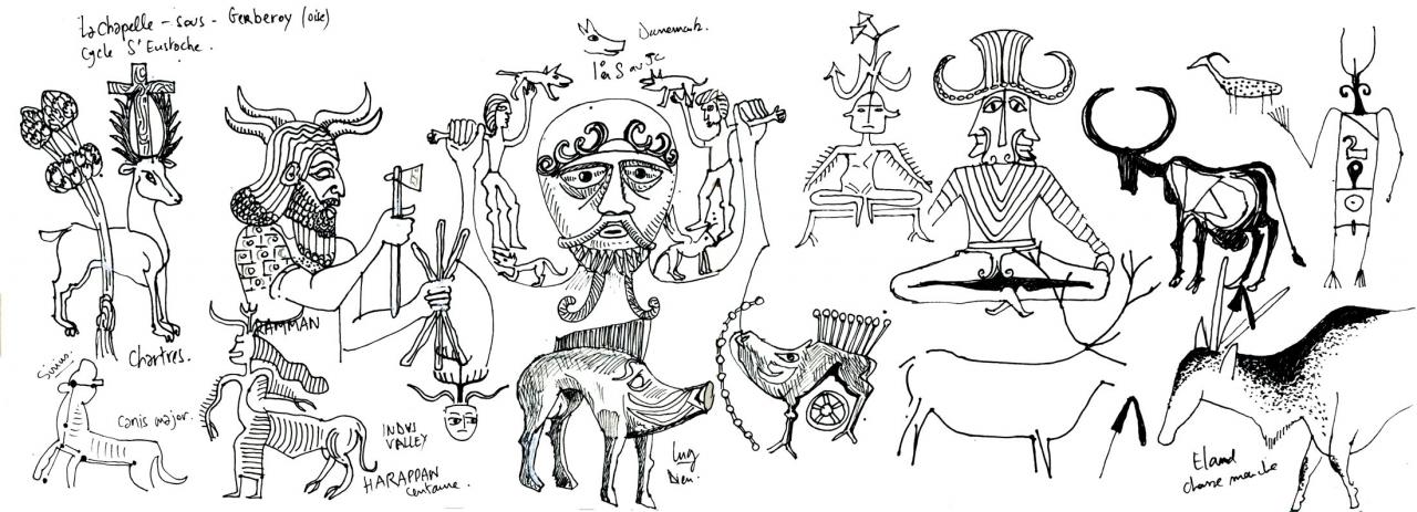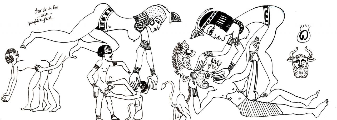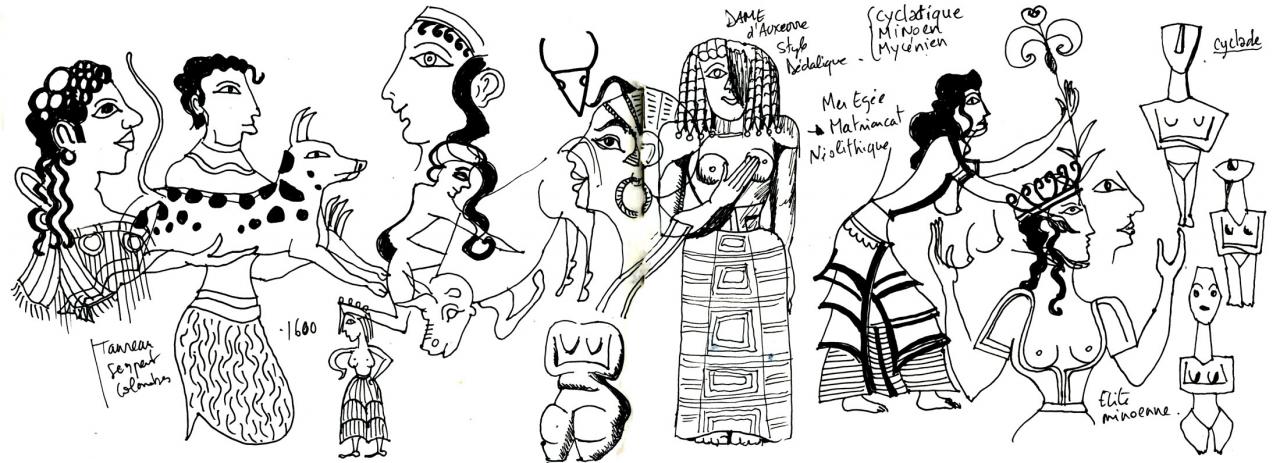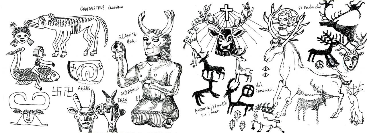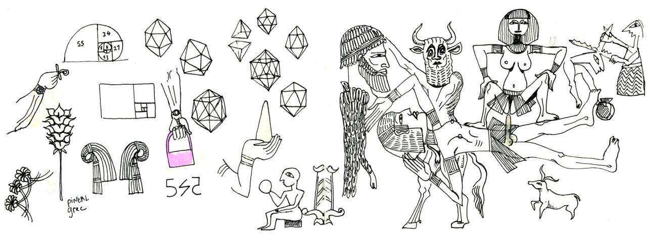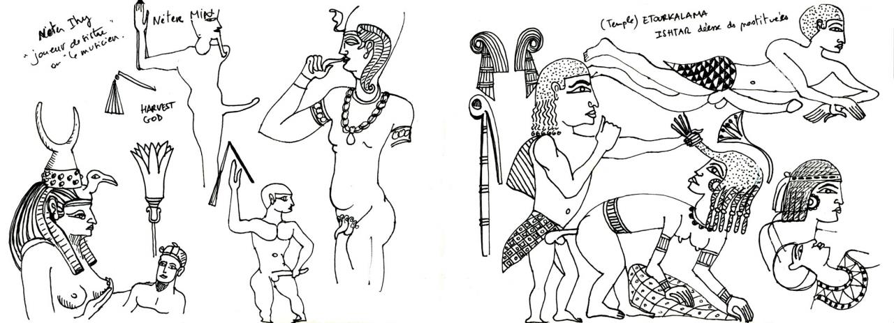 « Le mythe est-il un mensonge ? Le Mythomane est dit menteur avéré et d’une grande imagination. La mythomanie est censée, quant à elle, relever de la folie. Une mythomanie serait le recours systématique aux mythes. Il y a là un glissement de sens, pour définir une pathologie. Dans une recherche d’universalisme entre époque, culture et géographie, cherchant des archétypes, ce travail de dessin entre prise de notes et travail de copiste, permet un télescopage de figurations et de symbolismes divers, créant ainsi des passerelles de lectures plurielles. Le graphisme par le biais du trait spontané d’une même main mais mêlant différentes influences, joue à brouiller les pistes, comme s’il s’agissait d’un seul auteur, d’une seule époque, d’un seul lieu. Raconter des histoires, des mythes, c’est accepter les variations et les différentes versions d’une réalité lointaine et si proche. »