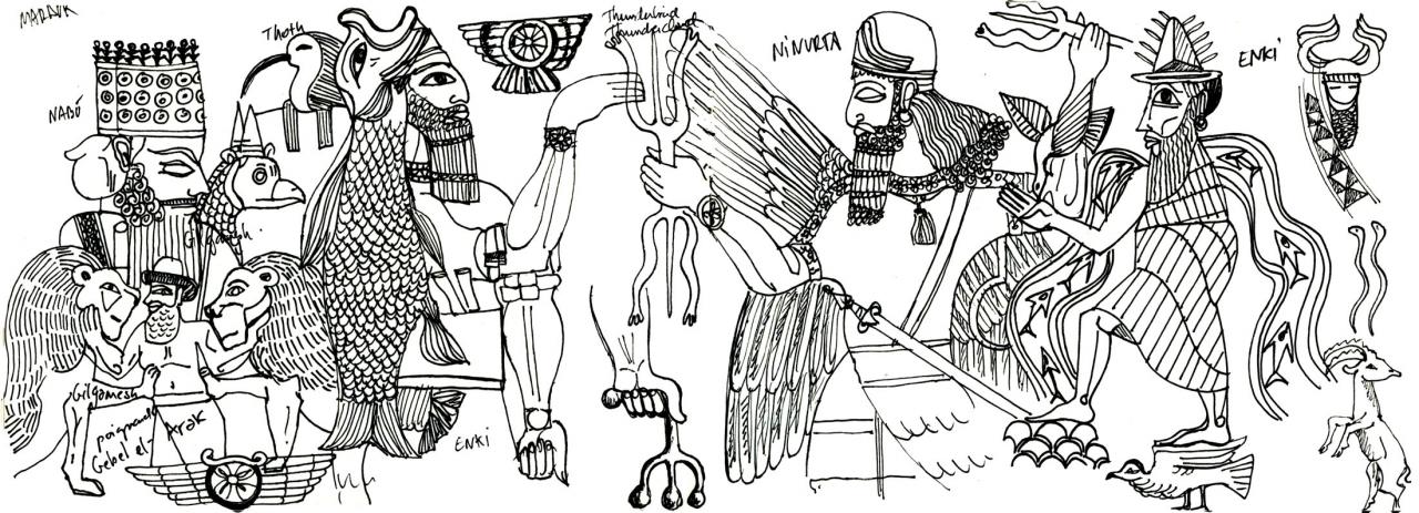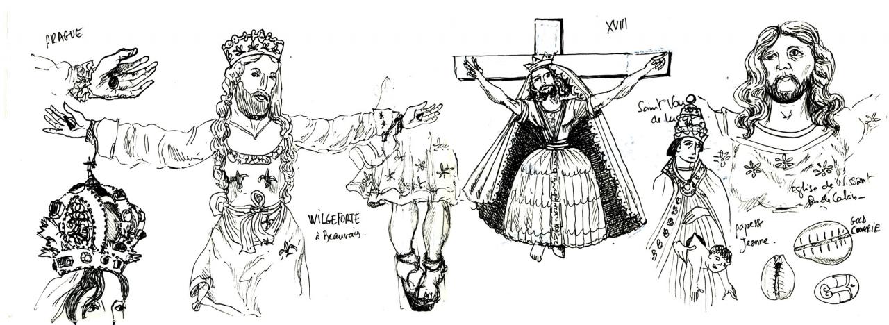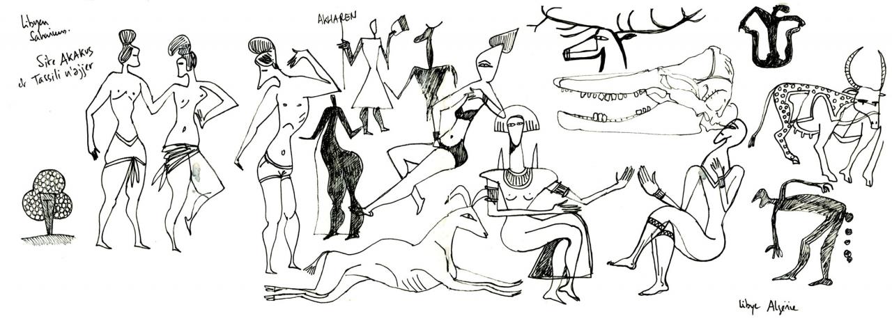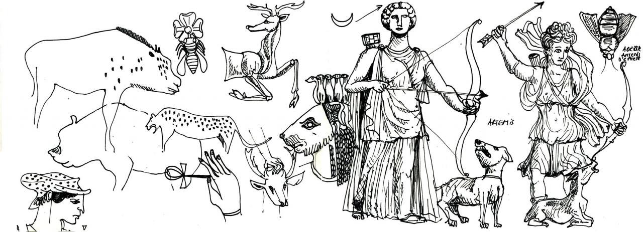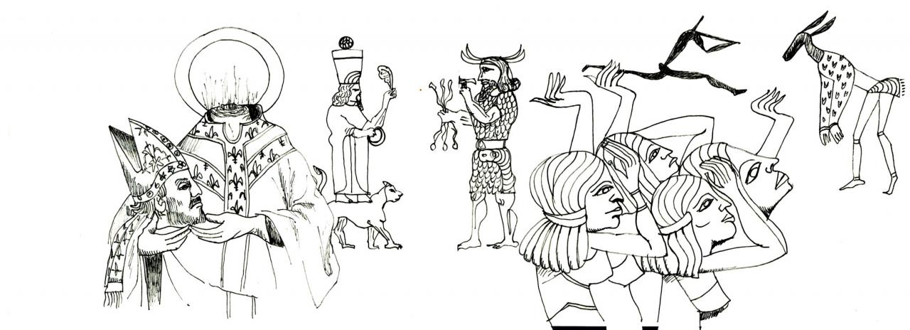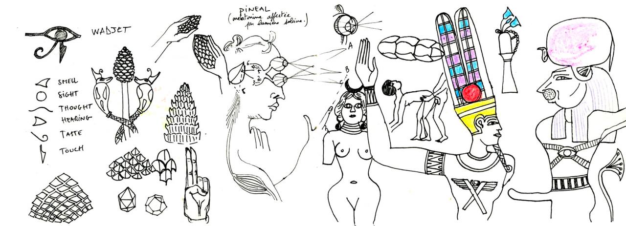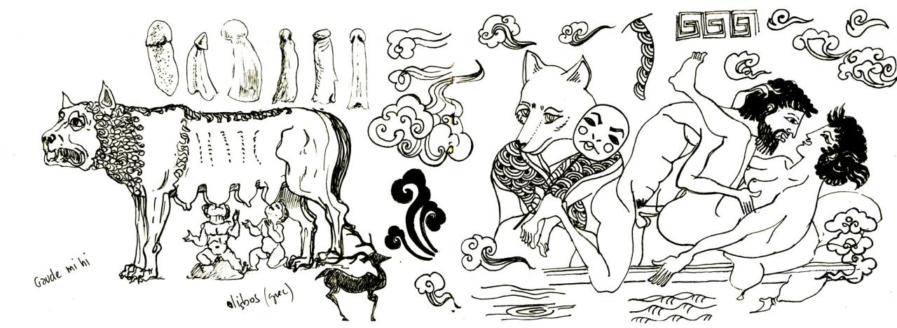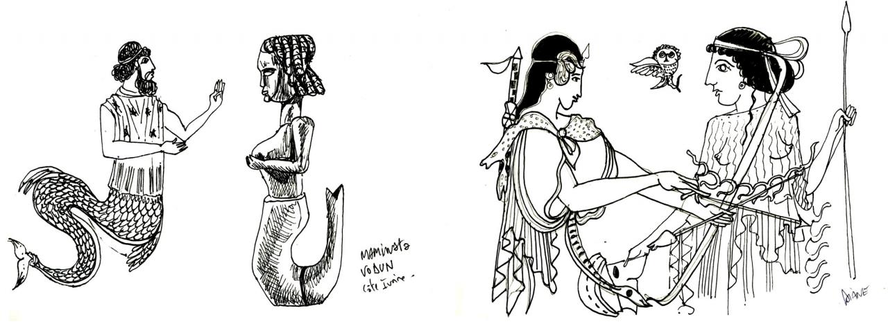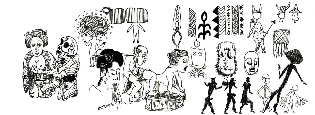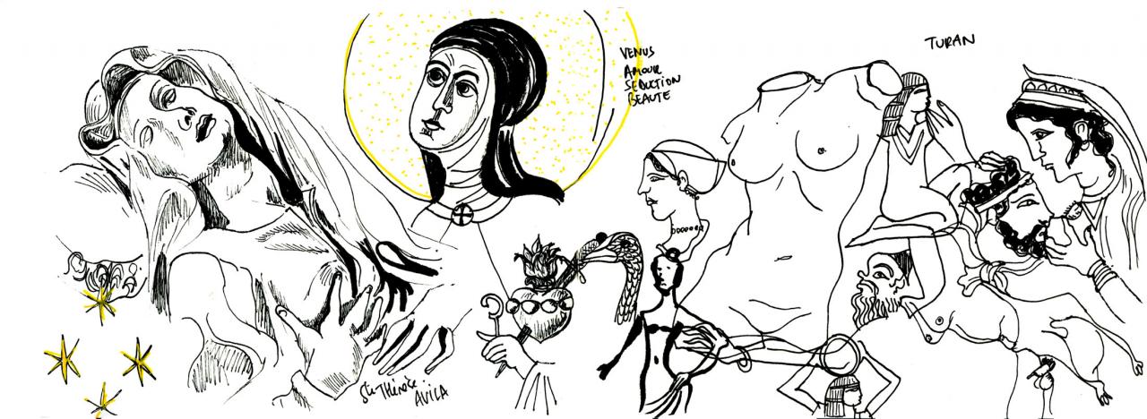 « Le mythe est-il un mensonge ? Le Mythomane est dit menteur avéré et d’une grande imagination. La mythomanie est censée, quant à elle, relever de la folie. Une mythomanie serait le recours systématique aux mythes. Il y a là un glissement de sens, pour définir une pathologie. Dans une recherche d’universalisme entre époque, culture et géographie, cherchant des archétypes, ce travail de dessin entre prise de notes et travail de copiste, permet un télescopage de figurations et de symbolismes divers, créant ainsi des passerelles de lectures plurielles. Le graphisme par le biais du trait spontané d’une même main mais mêlant différentes influences, joue à brouiller les pistes, comme s’il s’agissait d’un seul auteur, d’une seule époque, d’un seul lieu. Raconter des histoires, des mythes, c’est accepter les variations et les différentes versions d’une réalité lointaine et si proche. »