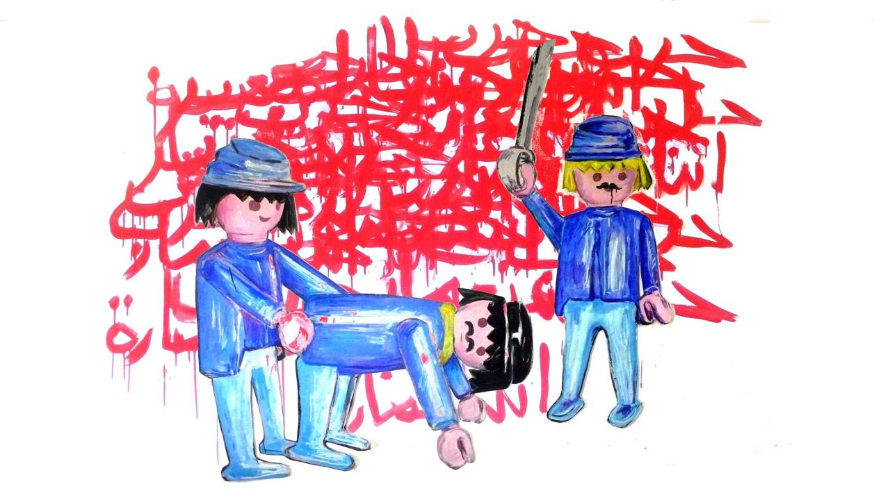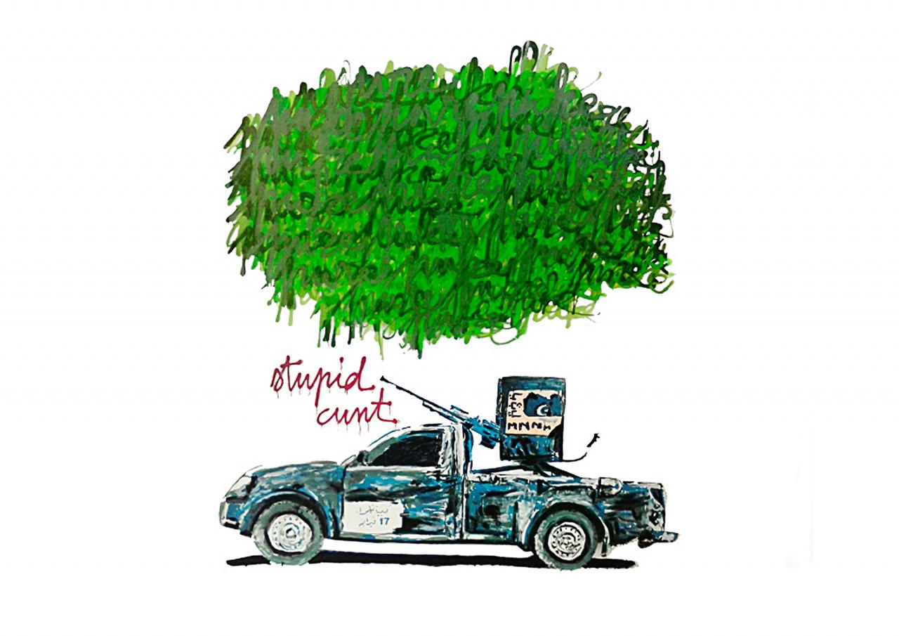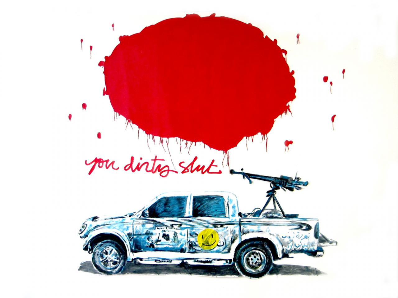 « À l’occasion d’une résidence en 2012 à Lerka (L’Espace de Recherche et de (K)réation en Arts Actuels), Soleïman Badat et Jean-Marc Lacaze réalisent à quatre mains une série de peintures de grand format nommée War is peace. Ils y évoquent avec dérision le traitement médiatique des nombreux conflits qui ont eu lieu au Moyen-Orient depuis la guerre du Golf en 1991. Dans War is peace + supernatural cloud 88, ils associent un élément menaçant, un pick up muni d’une arme à l’arrière à un nuage rouge porteur de message. Le nuage surplombe le véhicule et la mitraillette semble avoir lâché l’invective “ You dirty slut ”. À qui s’adresse ce message ? Et qui est désigné sous le pronom personnel “ you ” ? Est-ce la grande puissance mondiale qui dirige le monde, les pays orientaux où se déroulent les guerres ou la guerre elle-même ? Ces peintures au style libre mixent la peinture au dessin, l’univers graphique de l’illustration. Elles résonnent comme des réactions sur le vif à l’état du monde contemporain. »
