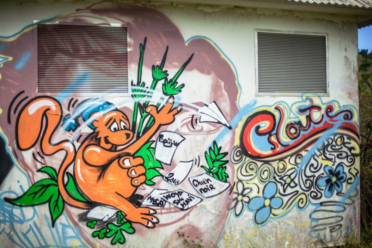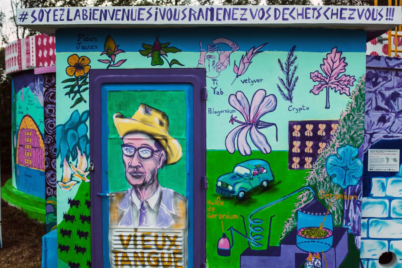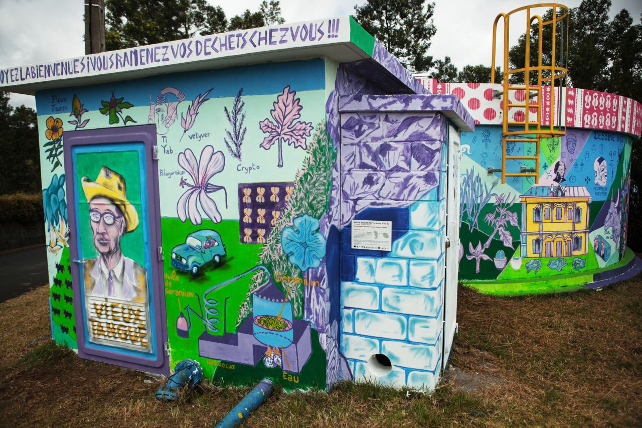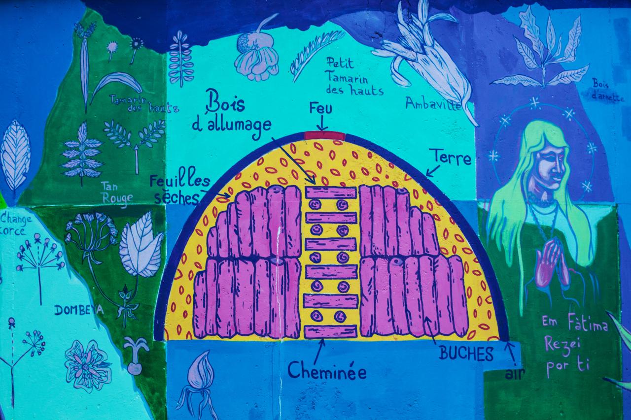« La continuité de ce travail sur La Réunion consiste avant tout en un échange avec un artiste mahorais, Papajan. C’est signifier une présence de la culture comorienne dans la diversité réunionnaise. Woya Shi Havi Mayotte nous ayant permis de trouver un mode d’écriture plastique à 6 mains, la fresque du Maïdo à La Réunion prolonge cette mise en forme, avec un fond historique et culturel propre au lieu. De la forêt primaire, lieu de dissimulation pour les Marons et espèces endémiques, à la colonisation de cette forêt pour une survie économique, le Maïdo représente cette route entre le domaine Desbassayns jusqu’à l’entrée du cirque de Mafate. Appréhender la citerne, support circulaire, avec une