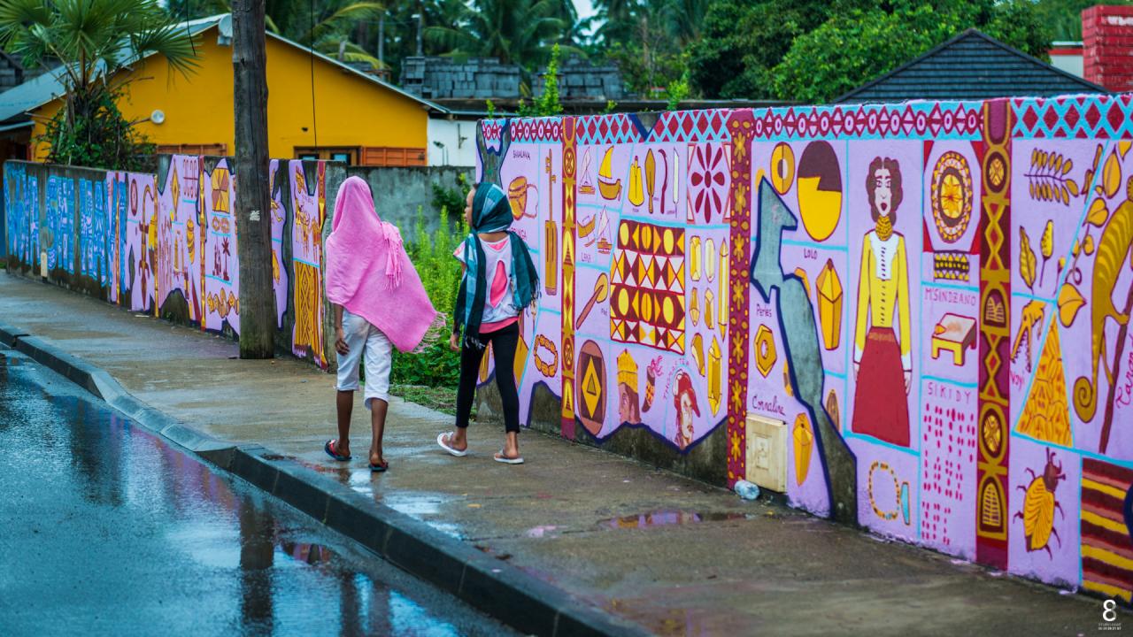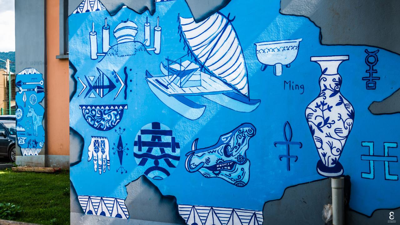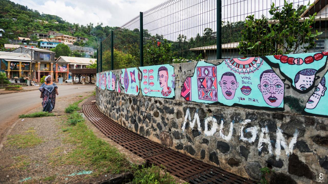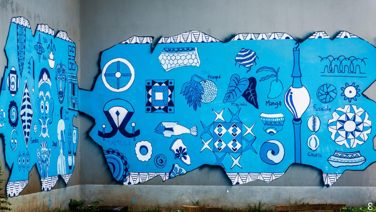 « Les fresques de Mayotte s’inspirent des différentes cultures et populations ayant occupé le sol de l’archipel des Comores sur une fourchette historique d’environ 500 ans de notre ère, du 9ème au 17ème siècle. Une palette large, l’objectif étant de voir le panel d’influences venues, schématiquement, des 4 points cardinaux. Même si l’histoire et les flux migratoires sont plus complexes que cela, l’approche artistique a souhaité « simplifier » et s’exposer sur les murs de manière à rendre accessible les informations récoltées. Les artistes nous offrent là un panel non exhaustif et non hiérarchique, une sorte d’ « éparpillement » d’informations dans un cadre de fouilles virtuelles choisi. Sur les murs, cela se traduit par un morcellement dessiné de la fresque, comme des restes d’enduit intégrant des inscriptions, des dessins, des notes, des observations ayant résisté au temps, alors que d’autres ne sont plus visibles. Ces choix de compositions plastiques entendent montrer l’aspect parcellaire de leur humble contribution à témoigner de la richesse culturelle dont est issue la population comorienne d’aujourd’hui. »