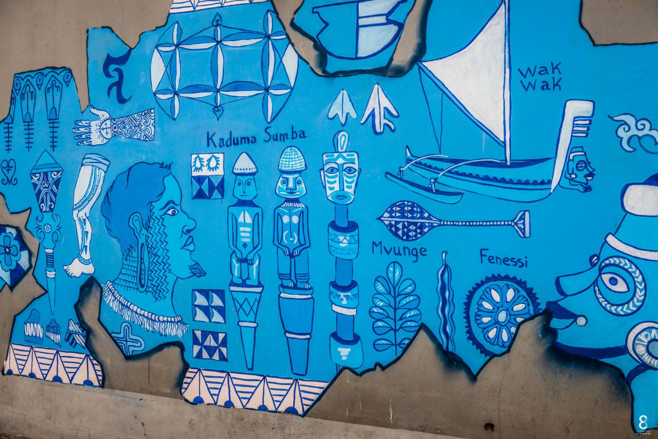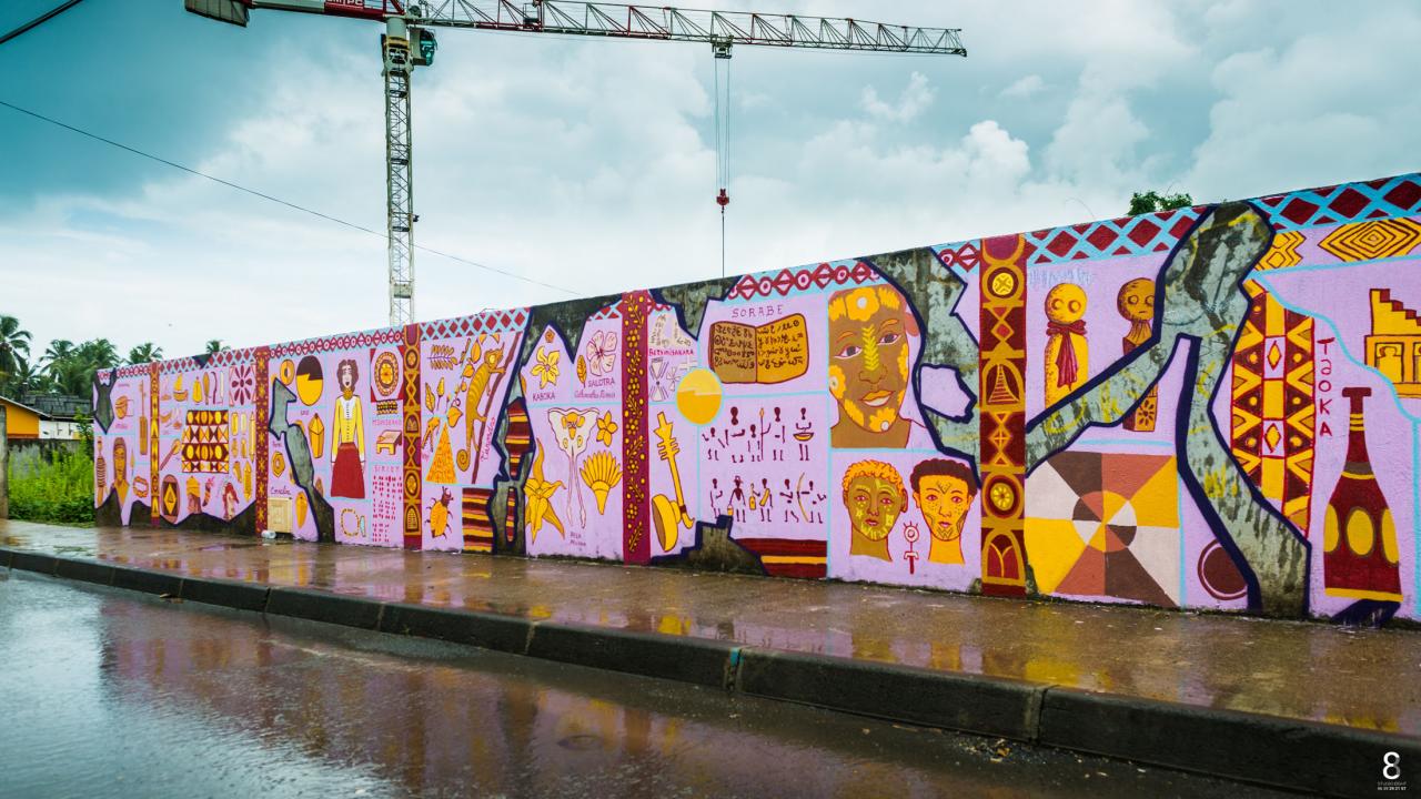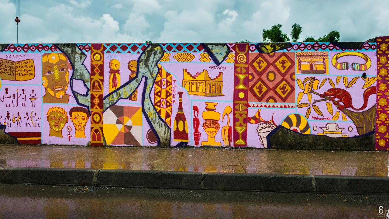 « Les fresques de Mayotte s’inspirent des différentes cultures et populations ayant occupé le sol de l’archipel des Comores sur une fourchette historique d’environ 500 ans de notre ère, du 9ème au 17ème siècle. Une palette large, l’objectif étant de voir le panel d’influences venues, schématiquement, des 4 points cardinaux. Même si l’histoire et les flux migratoires sont plus complexes que cela, l’approche artistique a souhaité « simplifier » et s’exposer sur les murs de manière à rendre accessible les informations récoltées. Les artistes nous offrent là un panel non exhaustif et non hiérarchique, une sorte d’ « éparpillement » d’informations dans un cadre de fouilles virtuelles choisi. Sur les murs, cela se traduit par un morcellement dessiné de la fresque, comme des restes d’enduit intégrant des inscriptions, des dessins, des notes, des observations ayant résisté au temps, alors que d’autres ne sont plus visibles. Ces choix de compositions plastiques entendent montrer l’aspect parcellaire de leur humble contribution à témoigner de la richesse culturelle dont est issue la population comorienne d’aujourd’hui. »