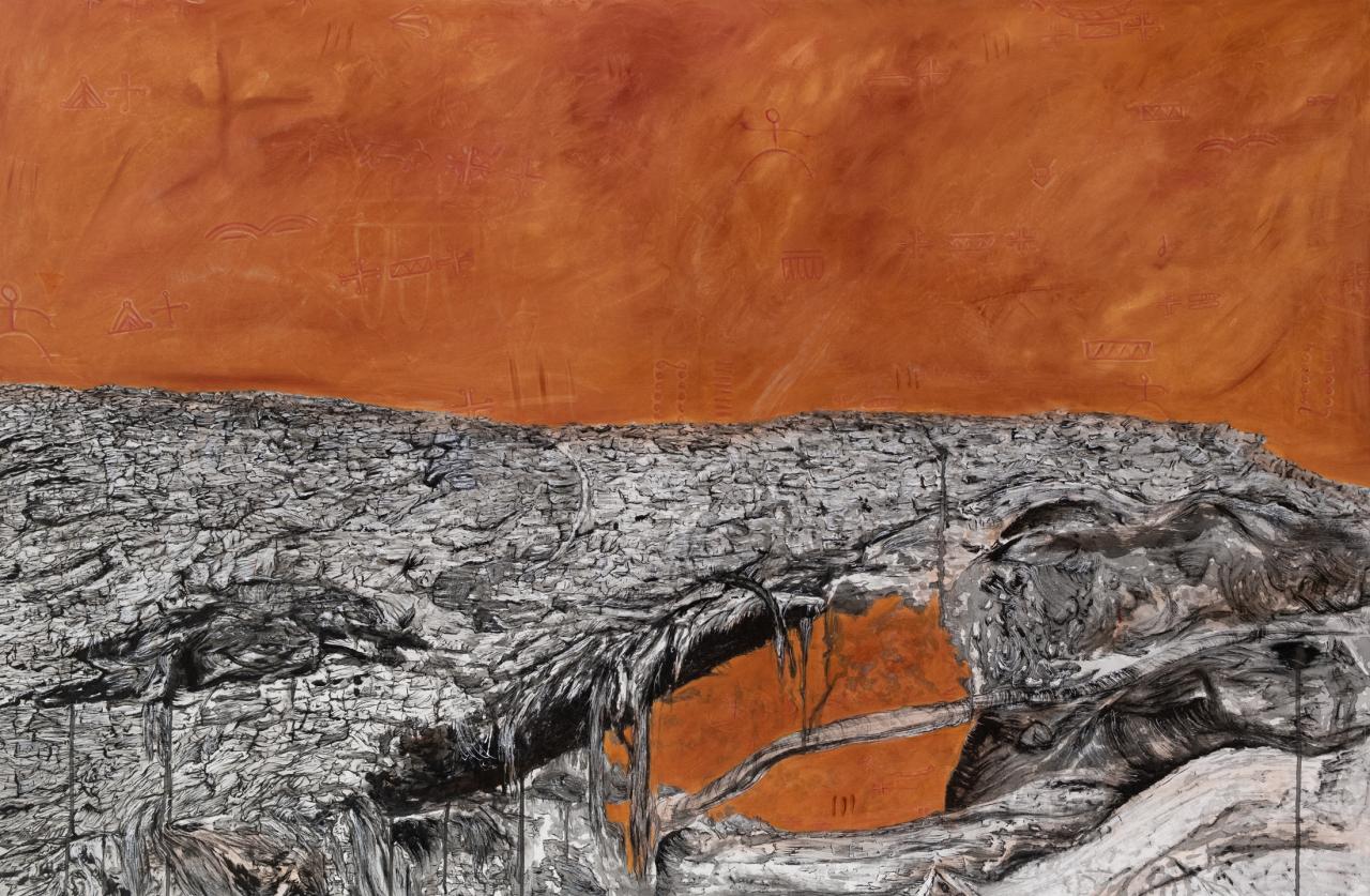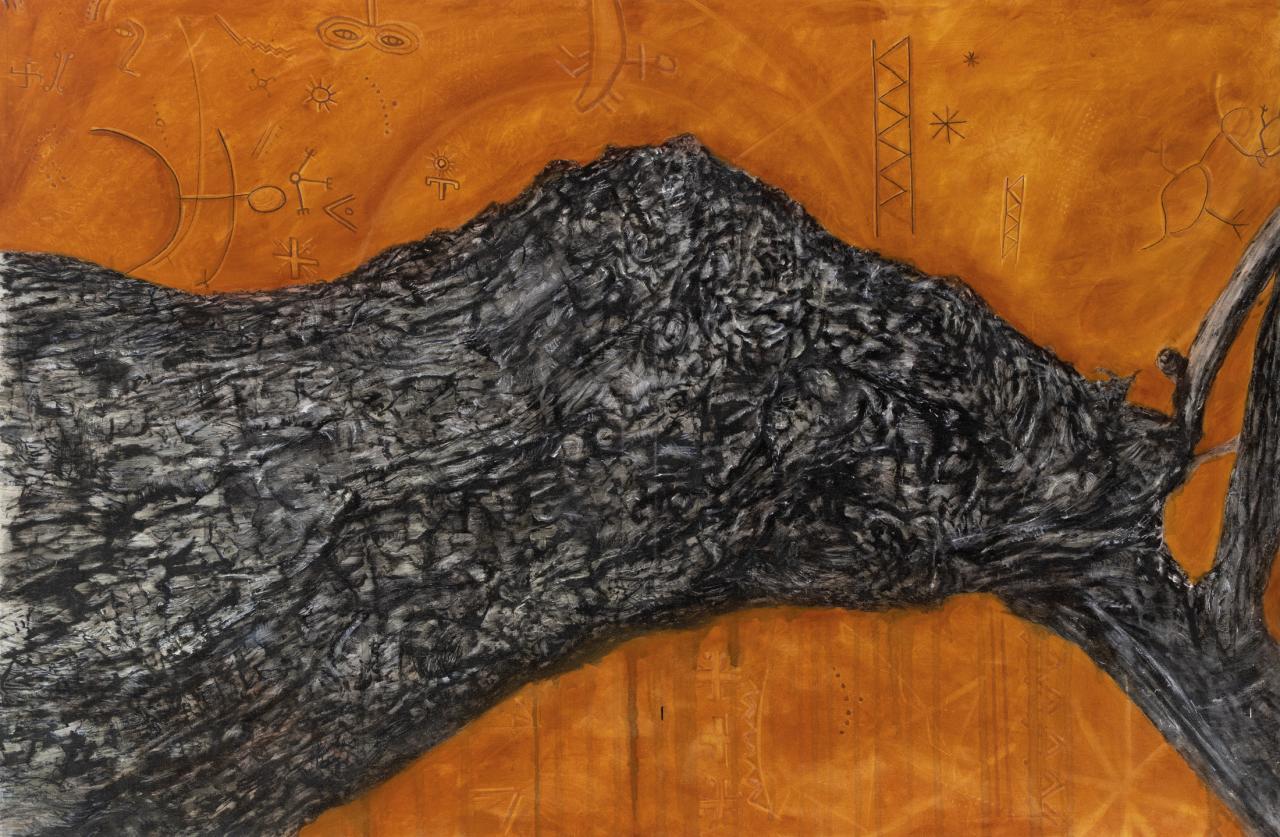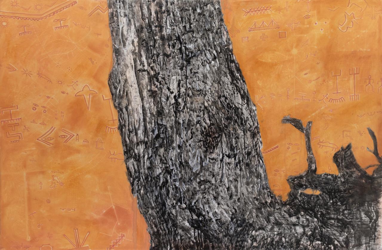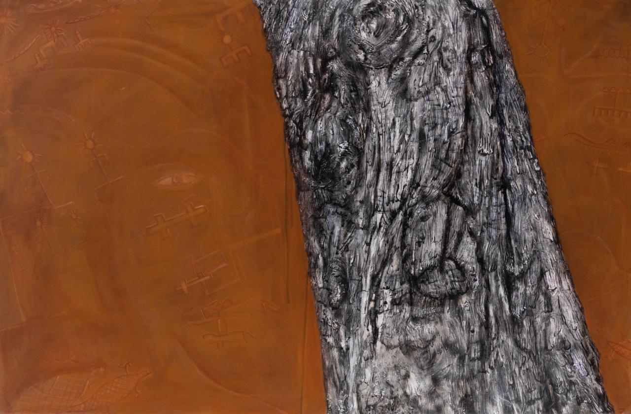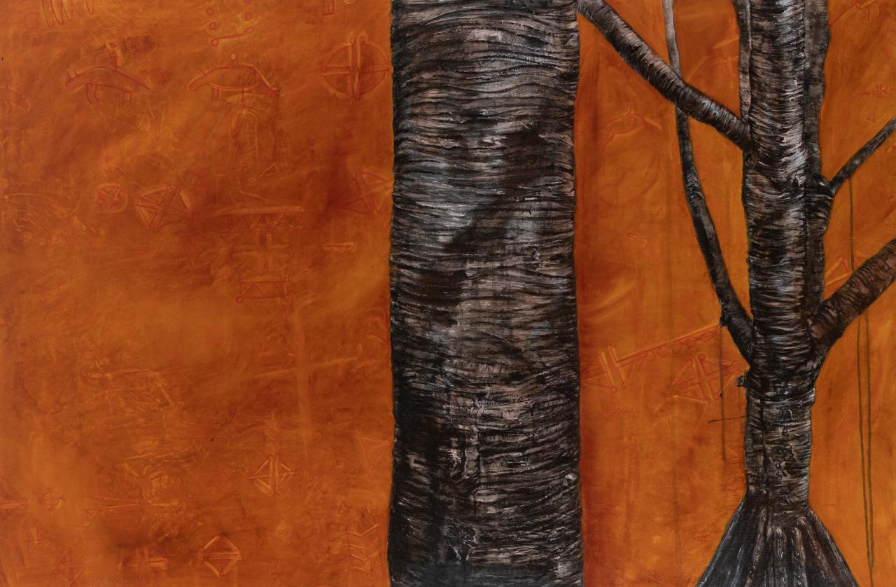 Tracer des signes, les recouvrir, retracer des signes sur le recouvrement et faire réapparaître ceux des dessous dans les dessus. Dans la série Hoditra, les peaux tatouées desquelles se détachent les troncs paysages sont de véritables palimpsestes.