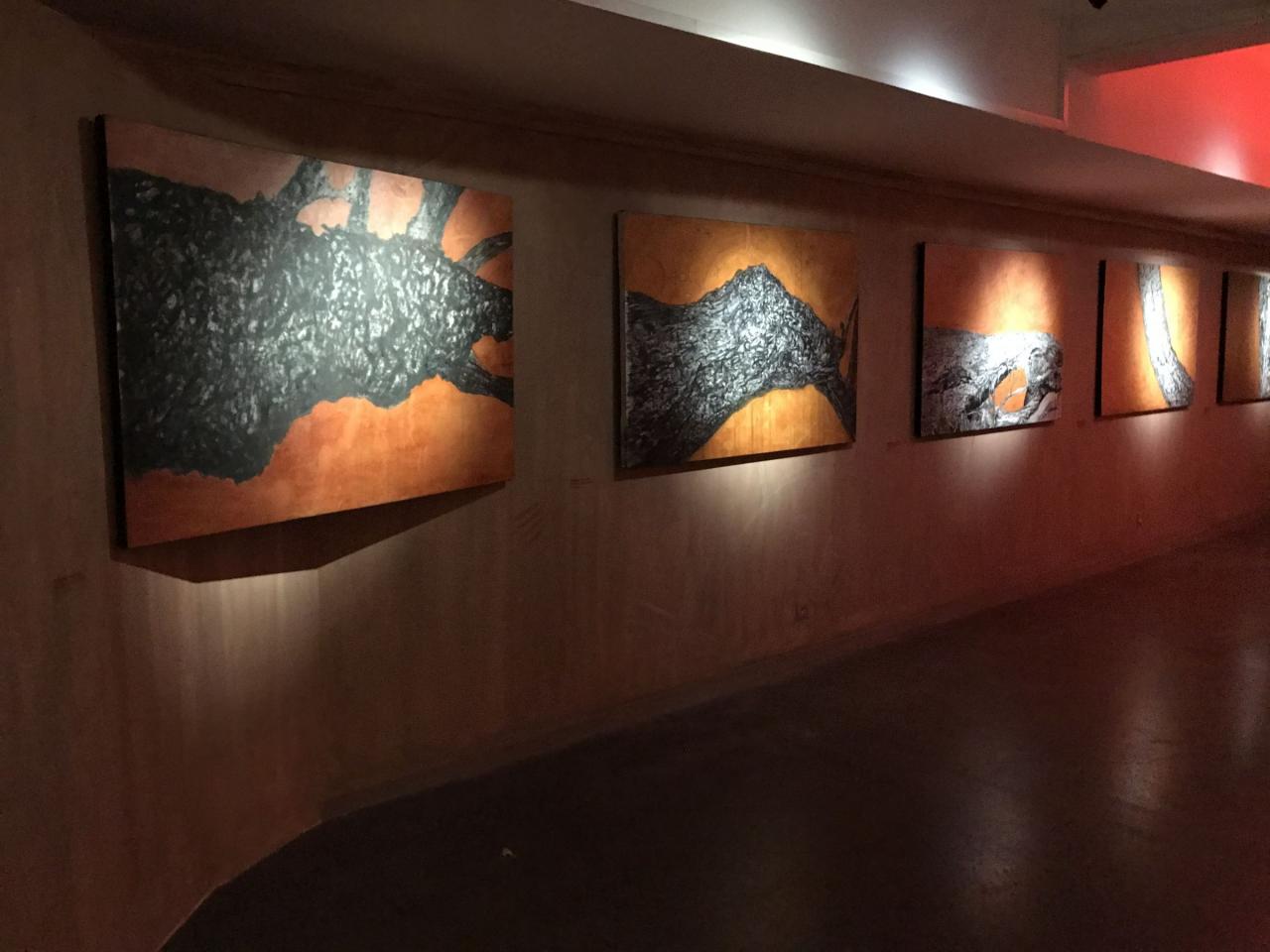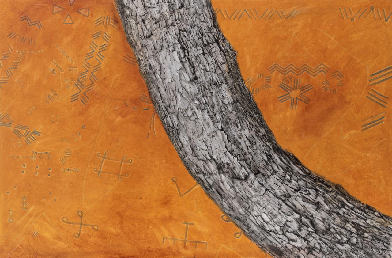 « Le motif du tronc a toujours été là. Mais aujourd’hui avec Madécasse, c’est surtout son écorce, sa texture, son pouvoir scriptural qui sont exhibés. Lorsque Kako peint ses troncs, qu’il les “graphine”, il les sculpte simultanément, à la manière d’un orfèvre. Si bien que dans la série des tableaux paysages, le tronc en lui-même donne à voir un paysage. Intérieur. Si bien que tant de réalisme dans la représentation amène à voir des tableaux abstraits. Prélevés d’un morceau de nature beaucoup plus immense. Encore un écho à l’immensité du pays madécasse1 . Illusion d’optique : points de vue aérienne et frontale semblent se confondre surtout dans les tableaux où les troncs sont peints à l’horizontale ; et font fleuve sur les peaux ou les terres picturales tatouées.