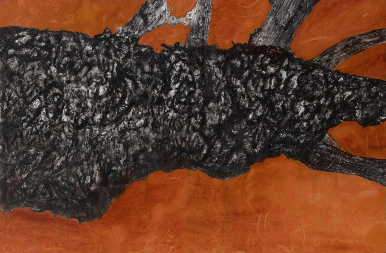 Trait à trait, d’un pinceau à la pointe aussi acérée que les épines des Antandroy2 , l’encre noire, telle la suie des origines, incise la toile virginale dans une quête absolue du secret de la sève. D’abord hésitante, la main va, ose quelques griffures, les prolonge de tracés volatiles, renonce, reprend, se retire, puis recommence – une fois, deux fois – autant de fois que nécessaire, avant que ne s’opère, de l’esprit et du corps, cette fusion aussi attendue que redoutée car synonyme d’une aliénation spiralaire. Et le geste grisé d’impatience se fait plus fécond : fibre après fibre, la toile se remplit ; écaille après écaille, l’écorce se structure, enfle, se soulève, craque, se fissure jusqu’à former ce tronc – pilier tutélaire d’une île au monde, jusqu’à élever ce bouquet de racines – poteaux solidaires d’Atlas. Lorsque tard dans la nuit, le manège s’arrête – ces choses-là se passent toujours la nuit – dans une rumeur bélouvienne, l’arbre s’annonce, tamarin élancé, filao affolé, acacia, araucaria, vacoa pavillonnaire. Bris de troncs, soupçons de corps, membres sexués, parcelles de forêts scalpées s’imposent alors sur le coton jalousé : de l’immensité du possible surgit enfin une possible réalité. »