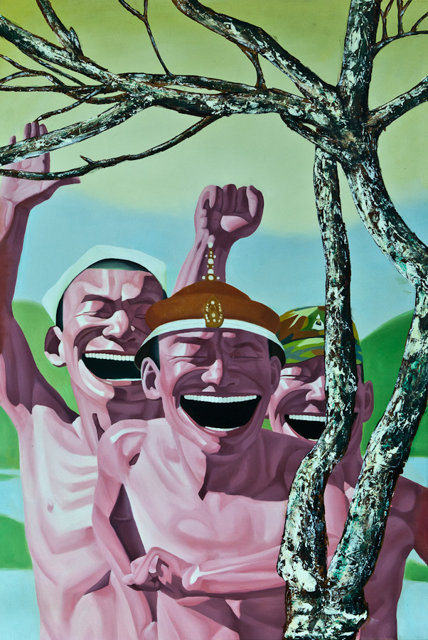 Série de 5 toiles, huile et acrylique sur copies de Yue Minjun acquises en Chine, 60 x 90 cm.
