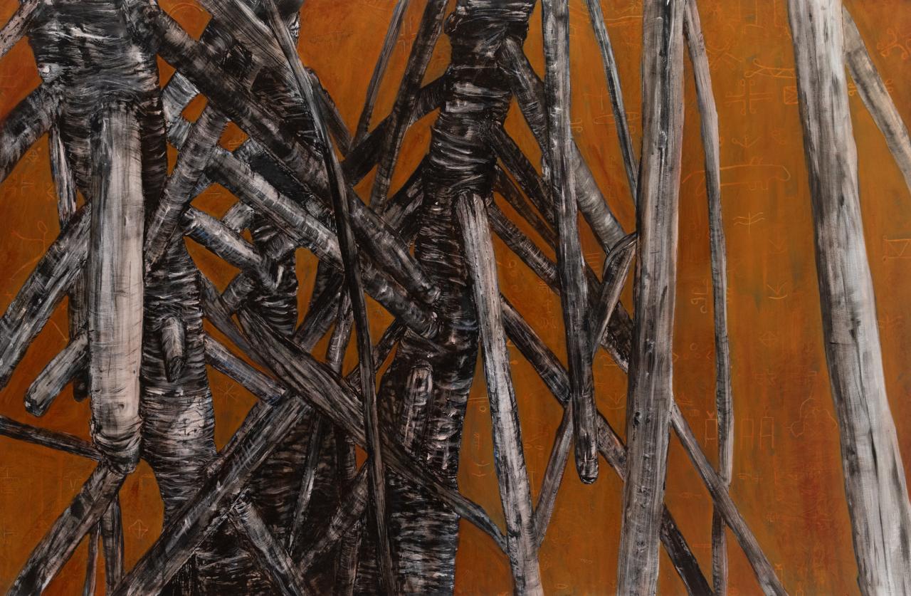 De son écorce suintent des vérités mises à nu, incisées, scarifiées, piquetées, témoins de plaies immémoriales. Au-delà de l’espace-toile, dans les frondaisons échappées rôdent les Vazimba2  : de leurs doigts allongés, posés à l’orée des fissures, ils nourrissent encore l’espoir fou de recueillir la sève primitive, celle qui les fera quitter leurs forêts olympiennes pour revenir parmi les Ntalao3 de ce « Nouveau Monde » partout et par tous, espéré.