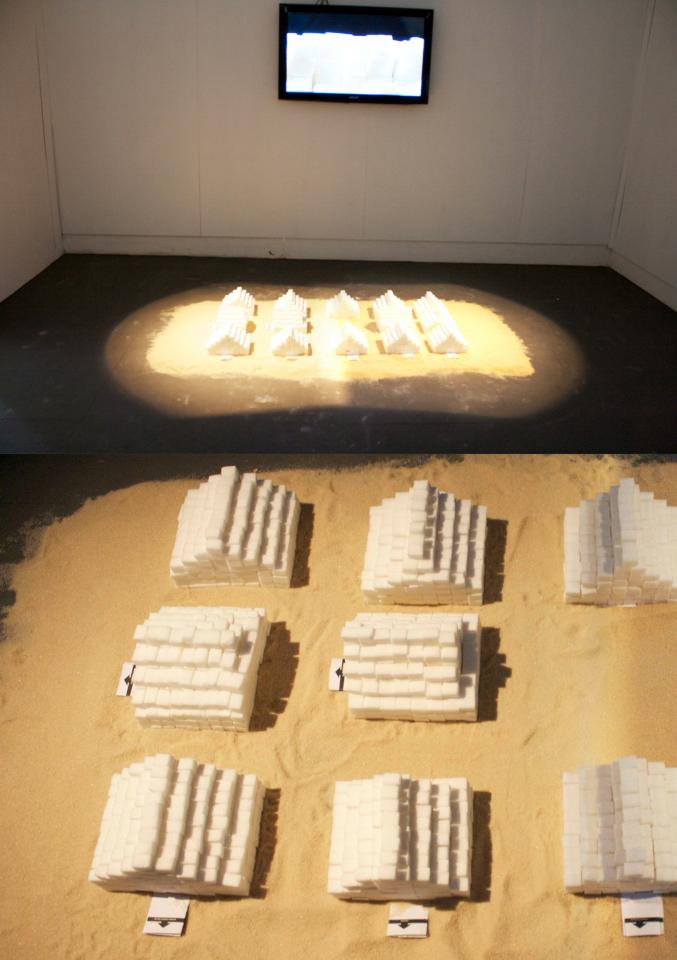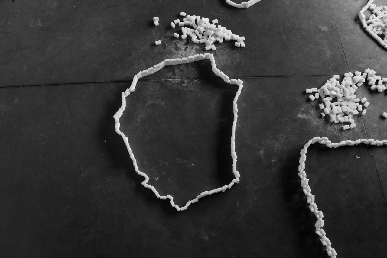 « (…) Matériau récurrent dans sa production artistique de 2009 à 2015, le cube de sucre est une unité de construction qui permet à Leïla Payet de composer de petites architectures éphémères, du simple muret à la ville (Le mur, 2009 et Villesucre, 2010). Il est aussi le symbole de l’économie coloniale sur laquelle se sont bâties l’hégémonie occidentale et la bipolarisation du monde. Les agencements en sucre de Leïla Payet ne sont jamais de véritables architectures à échelle réduite mais plutôt des arrangements sommaires qui renvoient à l’idée d’architecture. L’artiste se concentre sur l’acte de construire et de déconstruire des espaces, plutôt que sur la structure architecturale en elle-même car c’est la notion de déterritorialisation au sens où l’évoque Deleuze, une ligne de fuite vers le hors-champ ou processus éthique de sortie du territoire, qui l’intéresse. Sa pratique, que l’on pourrait qualifier d’art du bricolage, par la simplicité des protocoles d’action ou l’aspect parfois élémentaire des pièces, est en fait la formalisation d’une pensée complexe qui procède par assemblage, collage et confrontation des idées. Un véritable laboratoire de recherche expérimentale où la forme et le concept s’imbriquent et se confondent. »