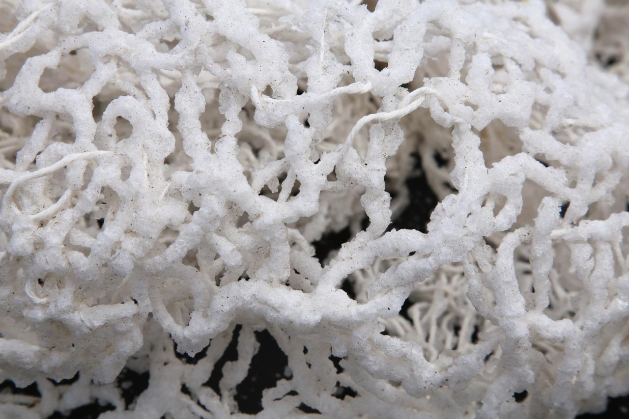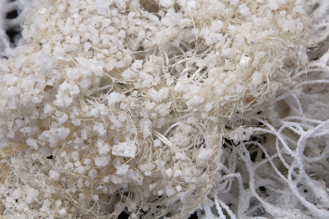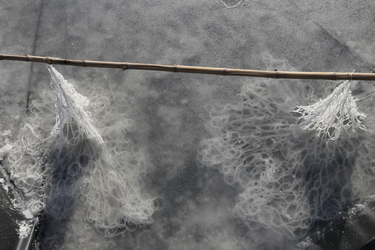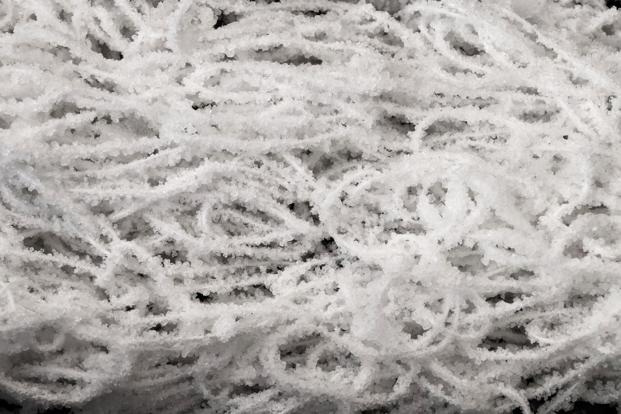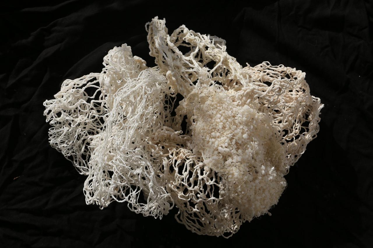Sculpture, sel cristallisé sur fil de coton, dimensions variables.