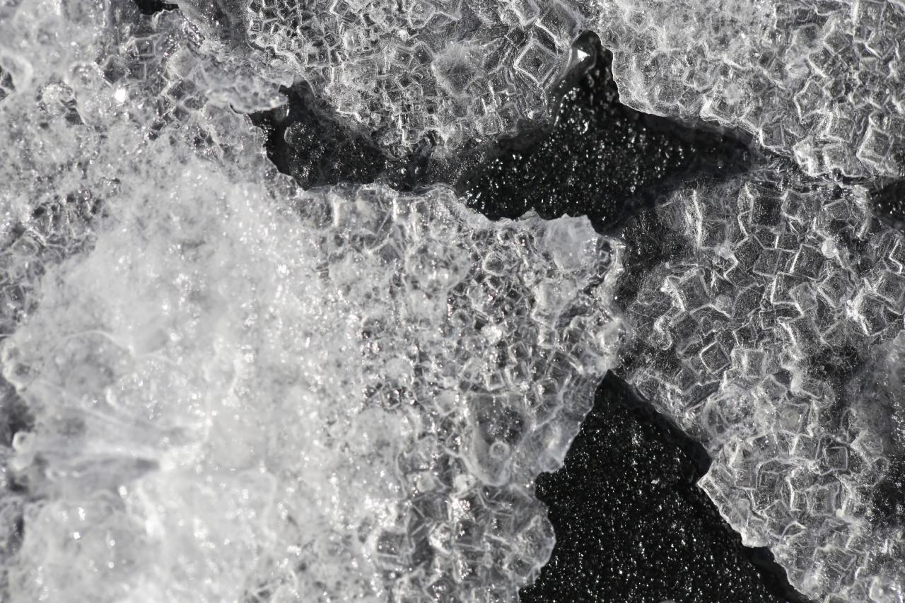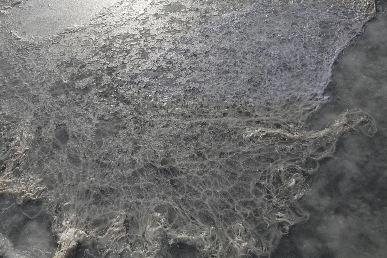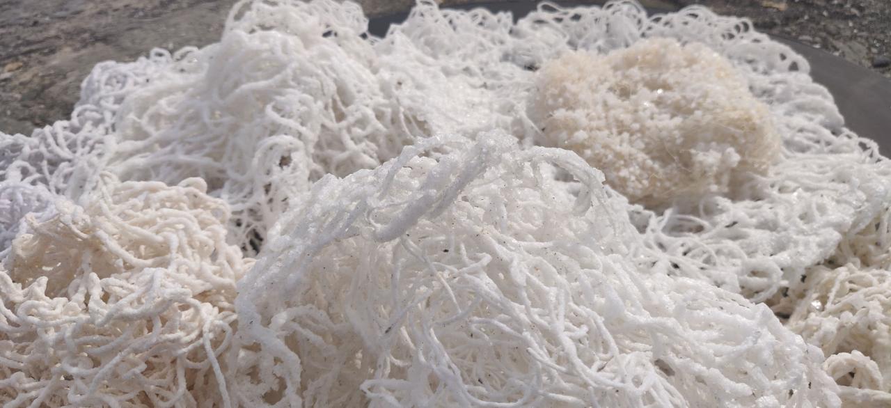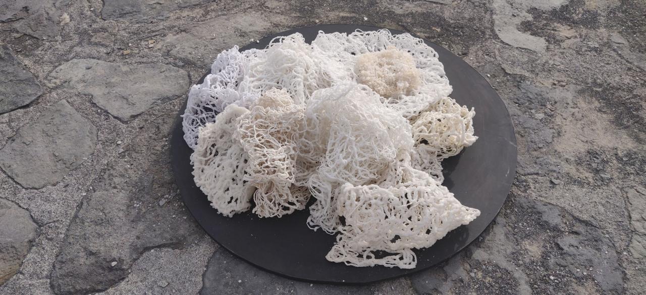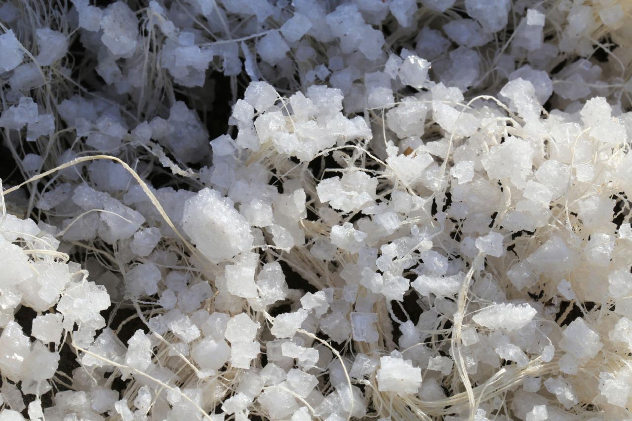 Sculpture, sel cristallisé sur fil de coton, dimensions variables.
