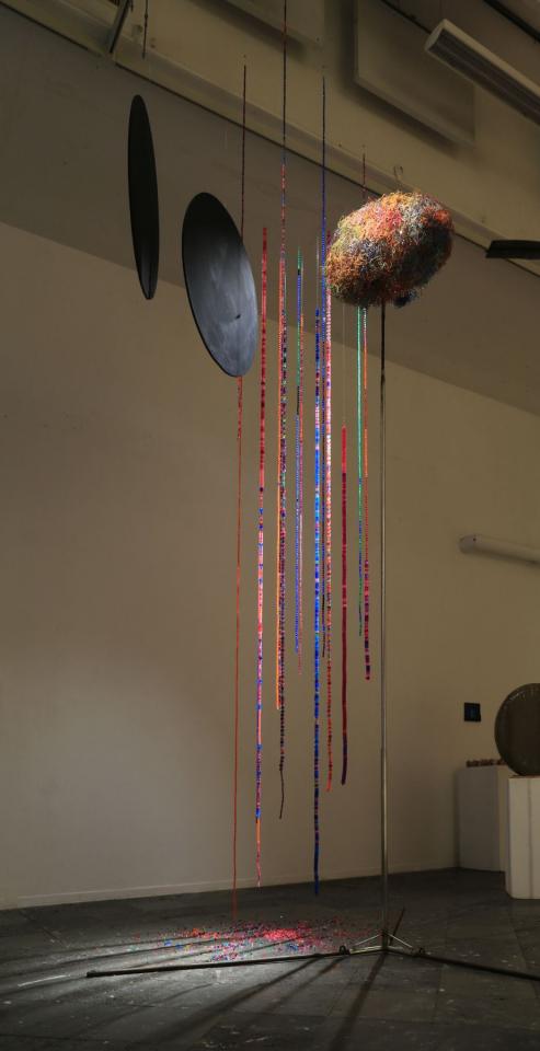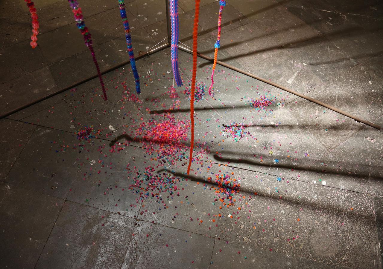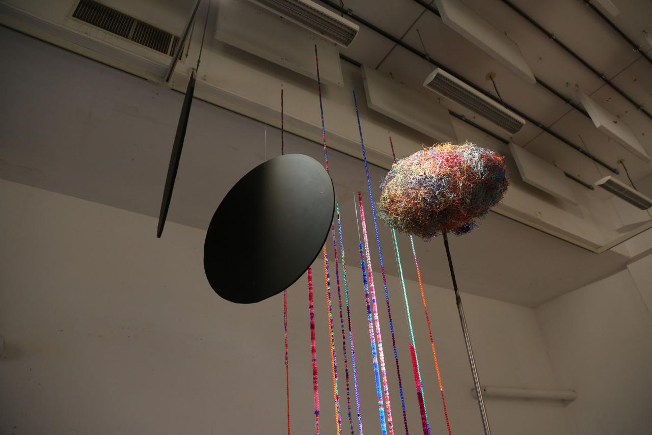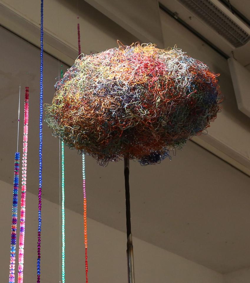 Installation, tiges d’inox et de fer, fil de cuivre et gaines de câbles, perles, bois peint.