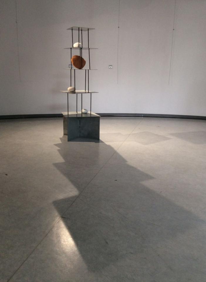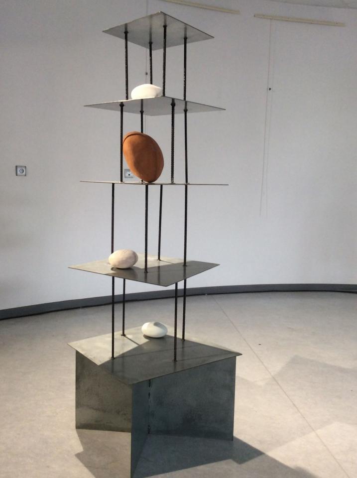 Sculpture installée, métal et céramique, hauteur 180 cm.