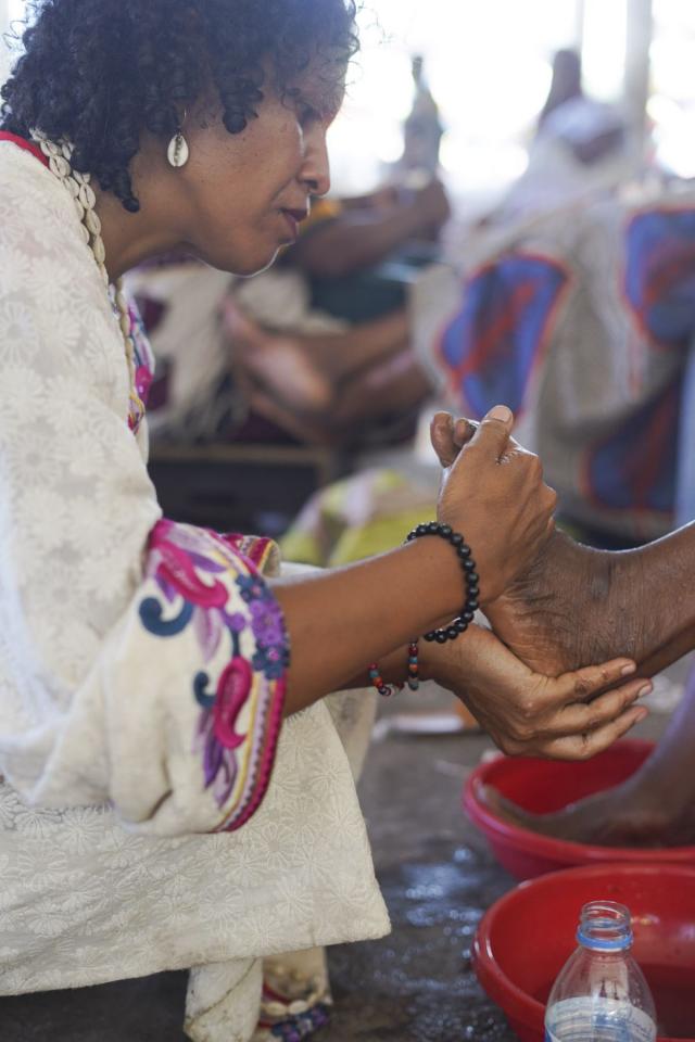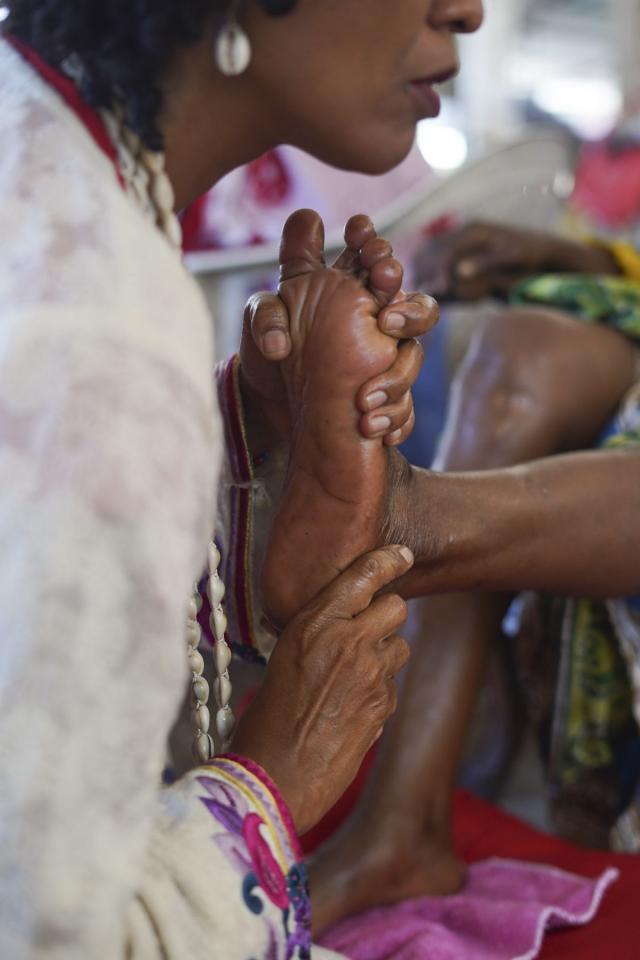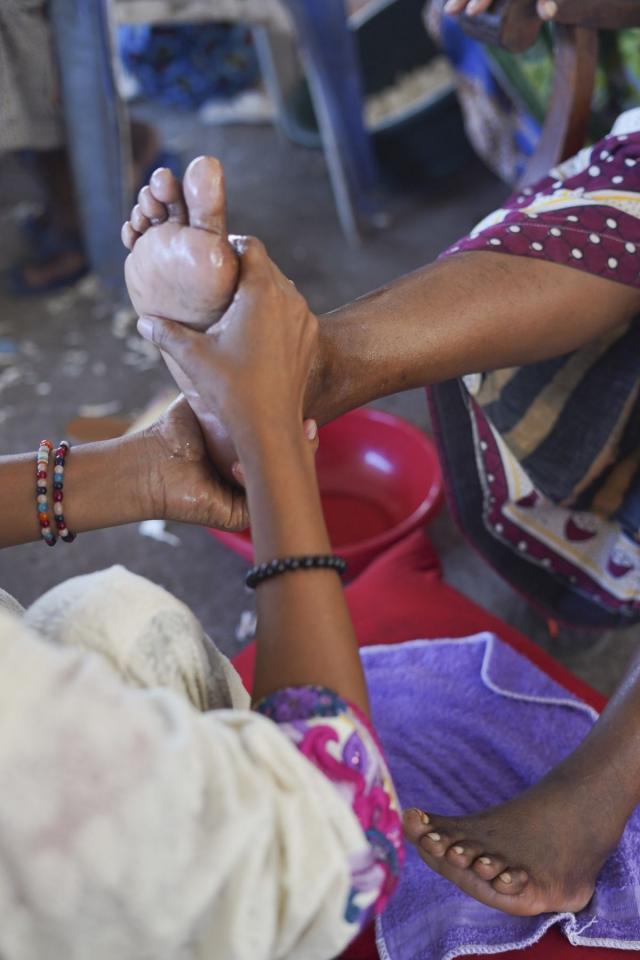 J’ai commencé à lui laver les pieds, respectueusement, avec douceur et tendresse, à l’eau de rose. Puis je les ai essuyés, toujours avec autant d’attention, et j’ai commencé un massage des pieds à l’huile de rose.