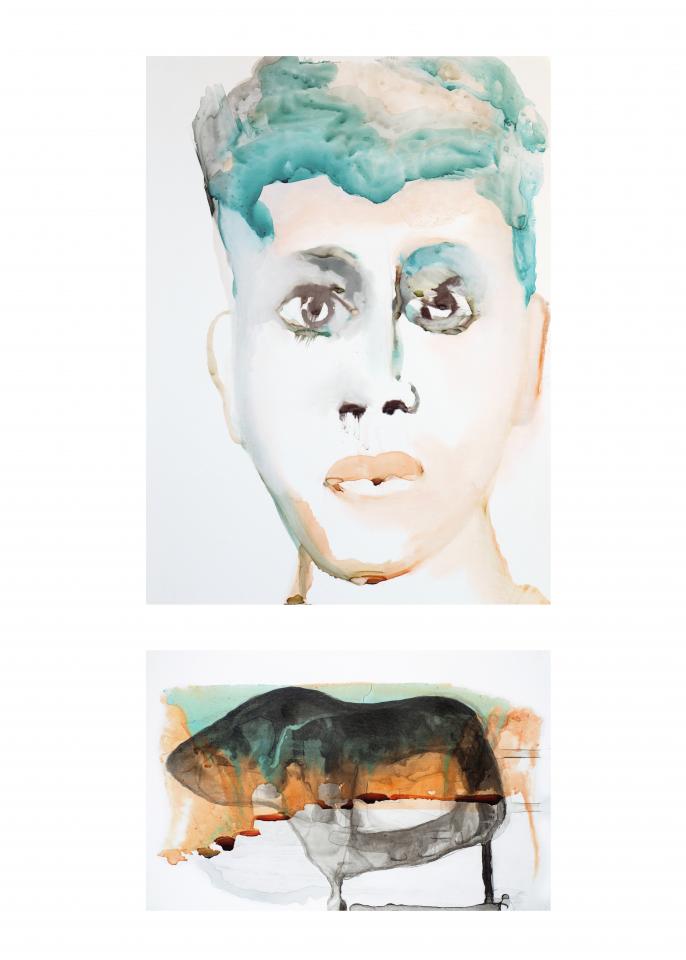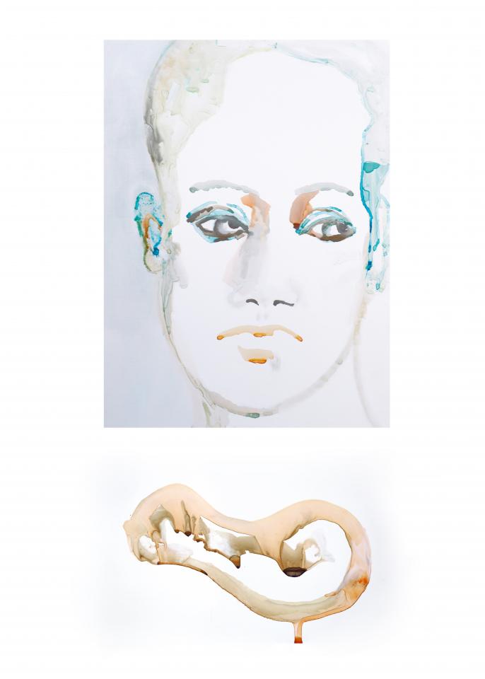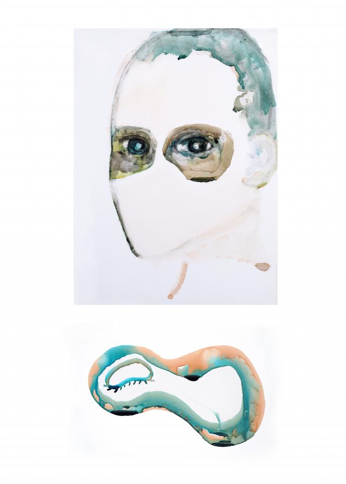 « Ces portraits sont extraits d’une série de diptyques où le visage dialogue avec une forme. Cette étape de recherche ouvre une réflexion sur la sensation éprouvée de se trouver au centre d’un cercle qu’occupe l’horizon îlien. »