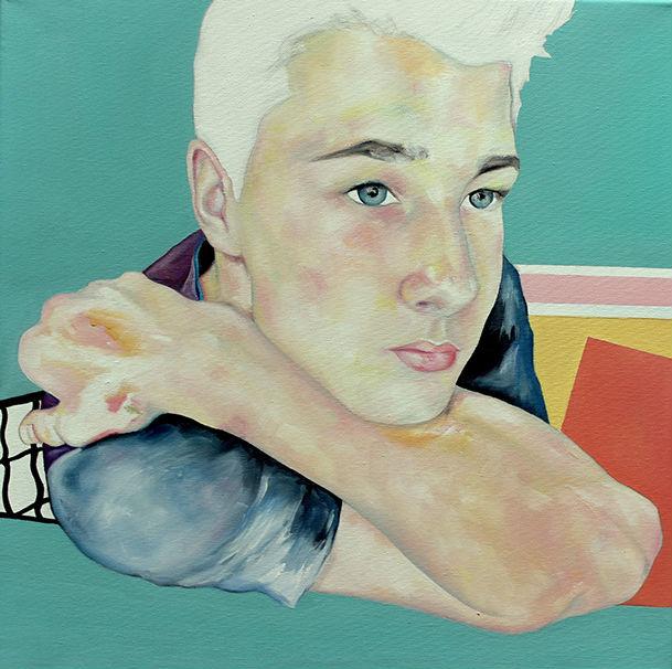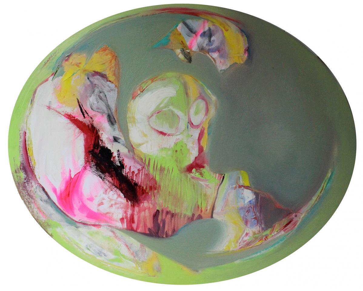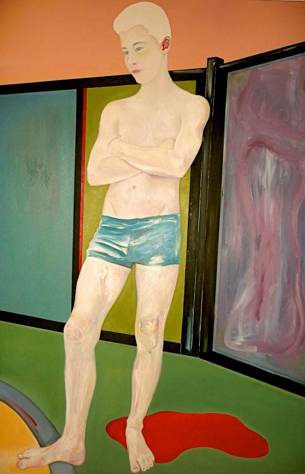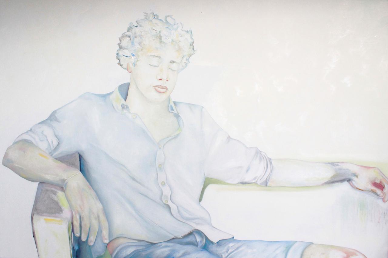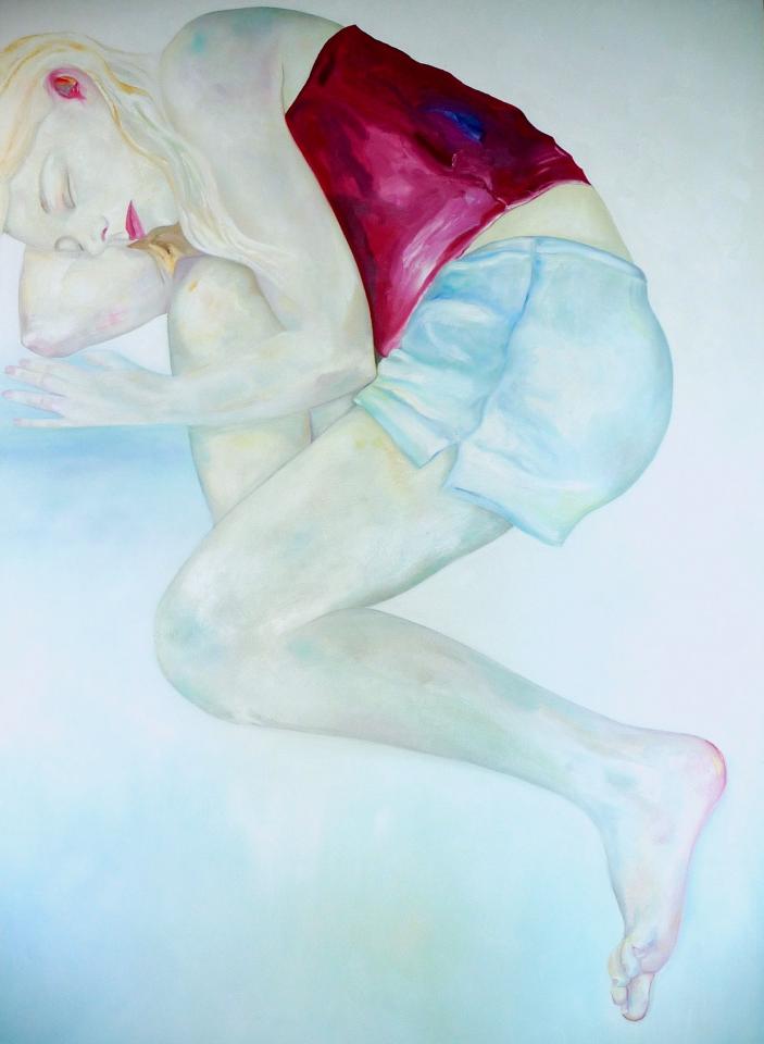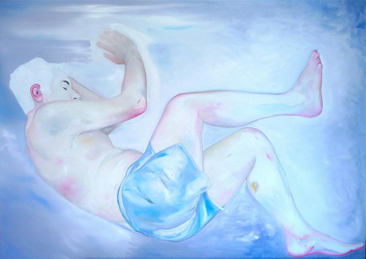 Il s’agirait par la peinture de donner à voir le secret de ces corps, de lisser les peaux toujours plus pour apercevoir les couches de chair, de creuser encore plus profond jusqu’à dévoiler l’anatomie, jusqu’aux tréfonds de l’âme aussi. Mais peine perdue, tout n’est que surface, image lisse, sans profondeur autour, des êtres sans chair malgré leurs formes généreuses parfois, vidés de vie, pauvres marionnettes translucides, sans expression ou fatiguées de lutter. Les figures centrales semblent prises au piège des décors vides aux grands aplats colorés venant rompre et accentuer encore la transparence des corps, jusqu’au blanc sur blanc d’un bel ange endormi. »