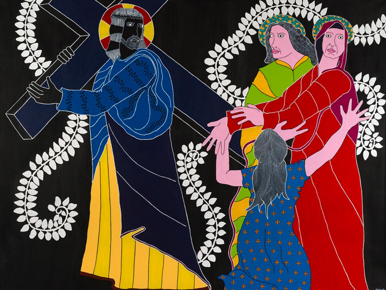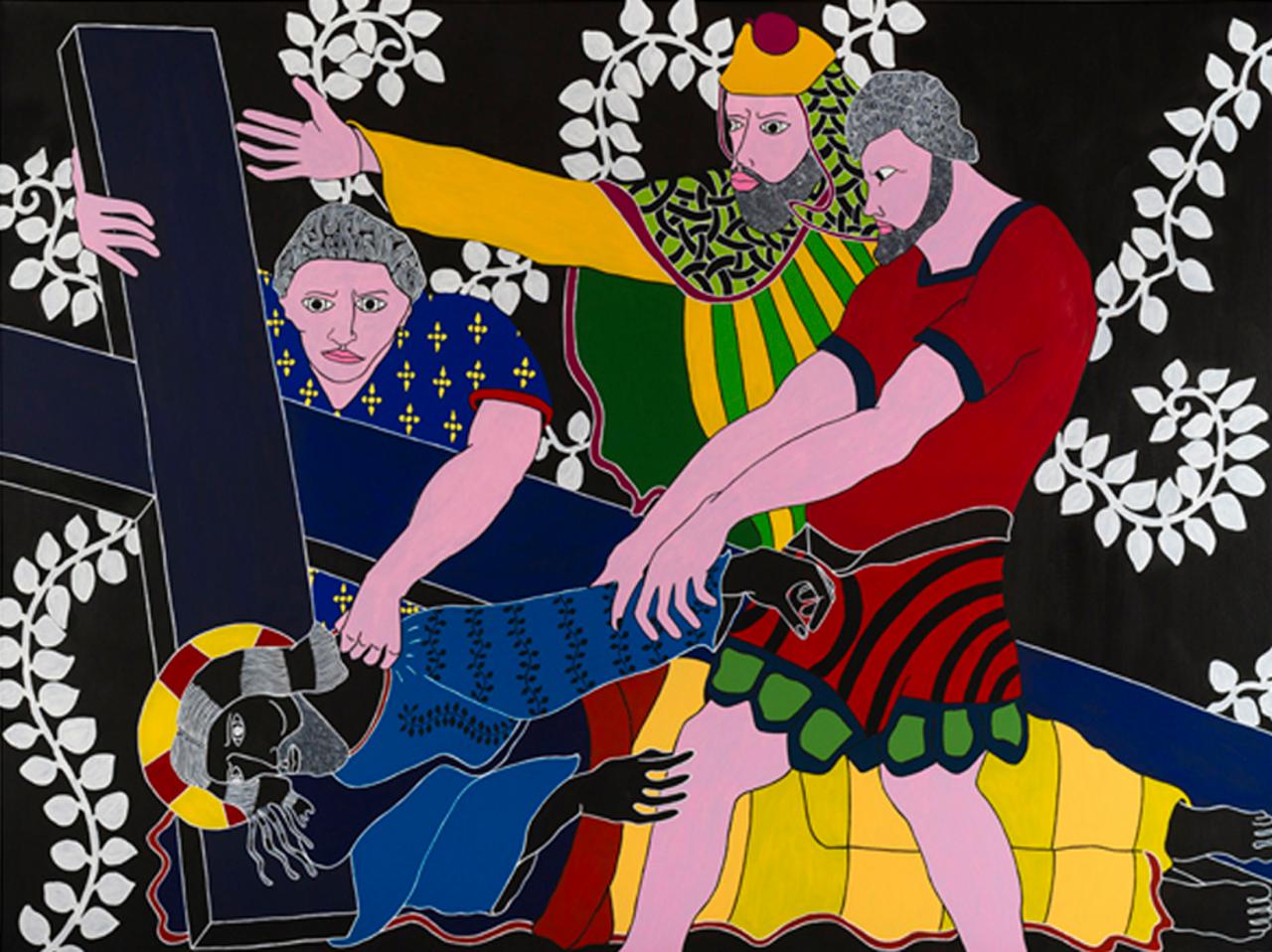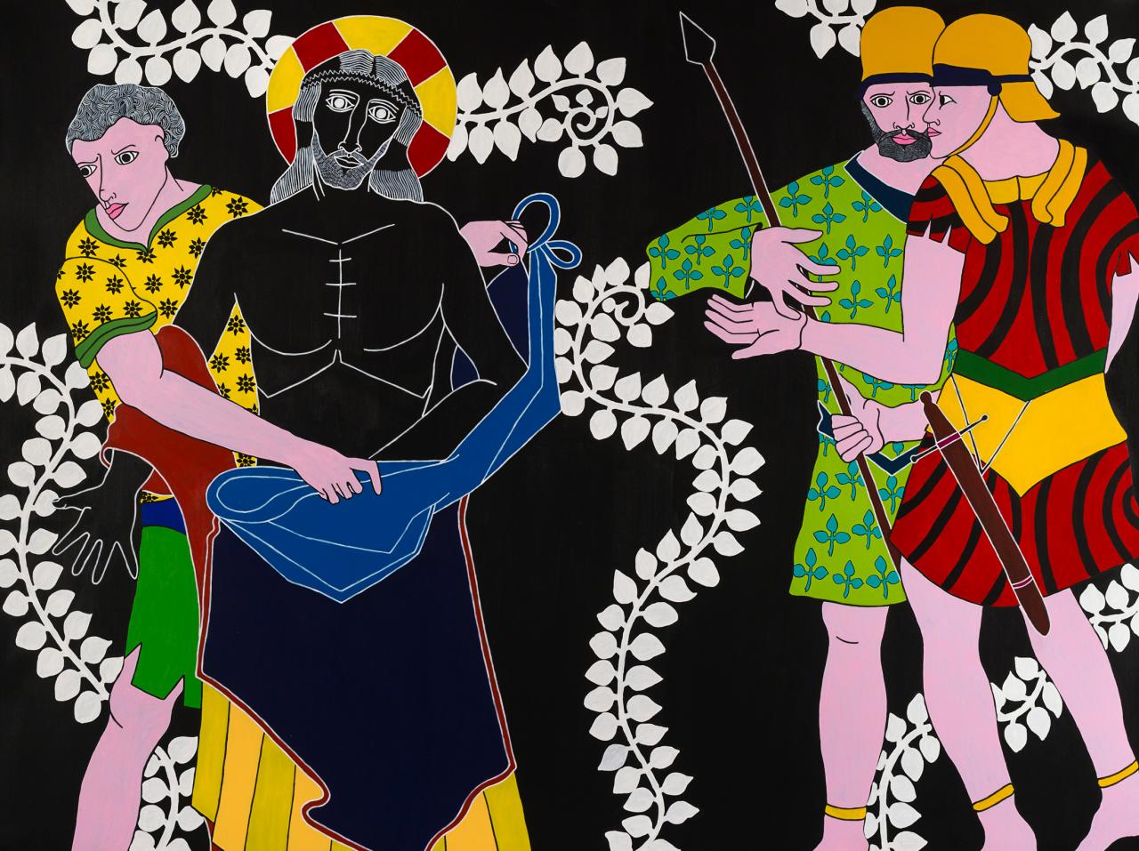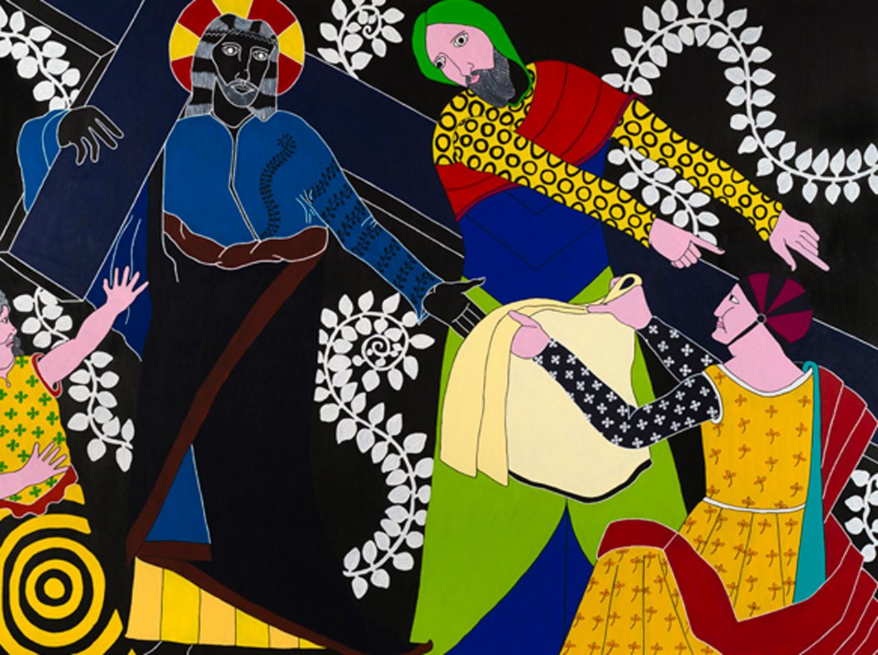 « Quelle mouche pique Stéphane Kenkle pour qu’il décide de peindre un chemin de croix en plein XXIe siècle, sans commande ni illumination pour motif ? Pour qu’il décide de consacrer 15 mois de son temps et de sa vie à la mise en scène des quatorze stations du calvaire de Jésus de Nazareth, seul, en grands formats et grands aplats ? À l’en croire, c’est le souvenir enluminé de gravures ou plus simplement encore de pieuses images divulguées au cours de séances de catéchisme qui l’a guidé depuis l’enfance jusqu’à cette exposition. L’enfance donc pendant laquelle l’image est un langage au moins égal au verbe. Et si ce retour à l’enfance de l’art emmitouflait dans sa mante quelque réminiscence médiévale, naïve et puissamment symbolique ? Et si on s’autorisait à voir dans l’énervement de la liane, le rythme du motif et le choix du bleu transfiguré en rouge à la station X, le retour d’un refoulé moyenâgeux, poétique et direct ? Il me plairait bien à moi, de rêver d’héraldique, de couleurs aux significations doubles, de profils dramatiques, de figures symboliques, de peintures à la fresque en me promenant au milieu des scènes flottantes de ce chemin en croix. Et si je me laissais vraiment aller, voici ce que j’entendrais…