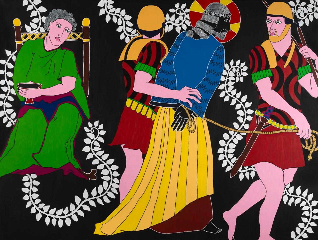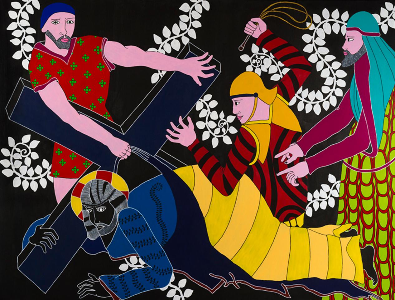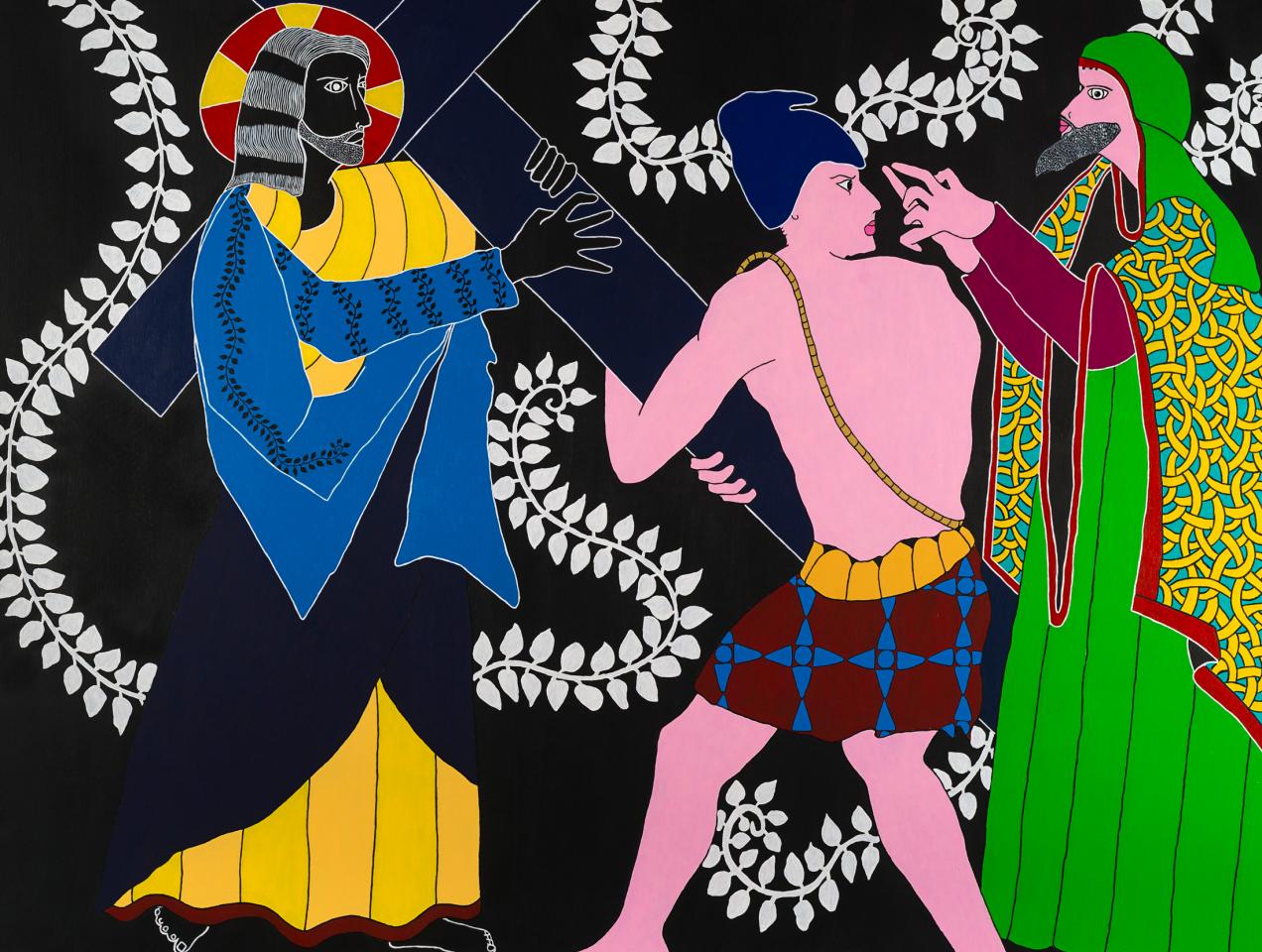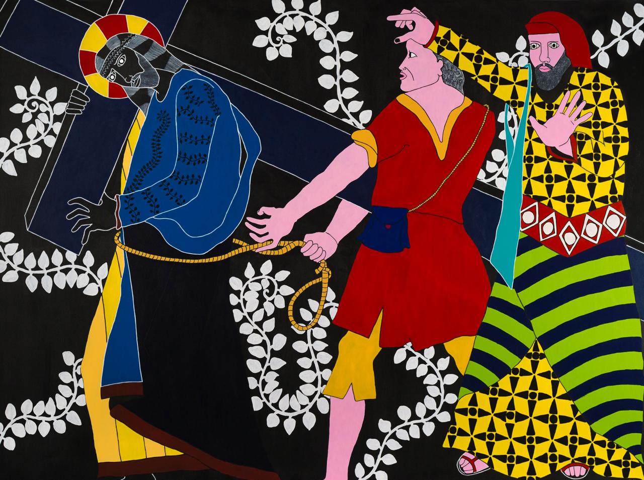 « Quelle mouche pique Stéphane Kenkle pour qu’il décide de peindre un chemin de croix en plein XXIe siècle, sans commande ni illumination pour motif ? Pour qu’il décide de consacrer 15 mois de son temps et de sa vie à la mise en scène des quatorze stations du calvaire de Jésus de Nazareth, seul, en grands formats et grands aplats ? À l’en croire, c’est le souvenir enluminé de gravures ou plus simplement encore de pieuses images divulguées au cours de séances de catéchisme qui l’a guidé depuis l’enfance jusqu’à cette exposition. L’enfance donc pendant laquelle l’image est un langage au moins égal au verbe. Et si ce retour à l’enfance de l’art emmitouflait dans sa mante quelque réminiscence médiévale, naïve et puissamment symbolique ? Et si on s’autorisait à voir dans l’énervement de la liane, le rythme du motif et le choix du bleu transfiguré en rouge à la station X, le retour d’un refoulé moyenâgeux, poétique et direct ? Il me plairait bien à moi, de rêver d’héraldique, de couleurs aux significations doubles, de profils dramatiques, de figures symboliques, de peintures à la fresque en me promenant au milieu des scènes flottantes de ce chemin en croix. Et si je me laissais vraiment aller, voici ce que j’entendrais…