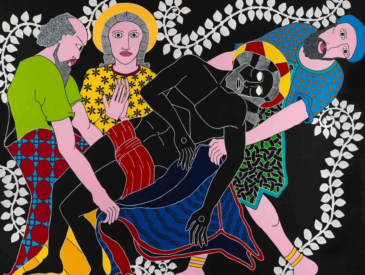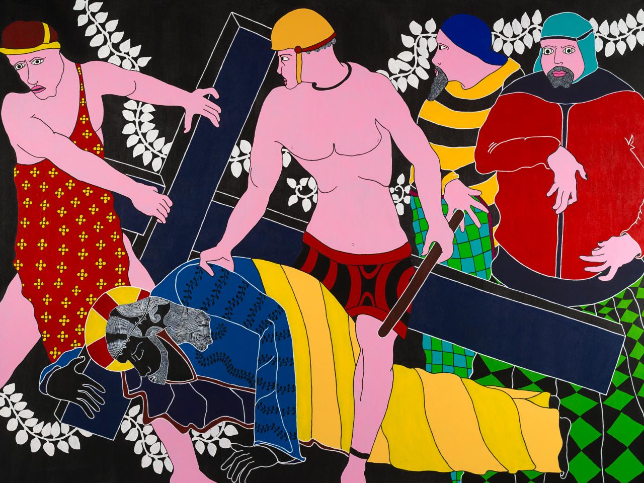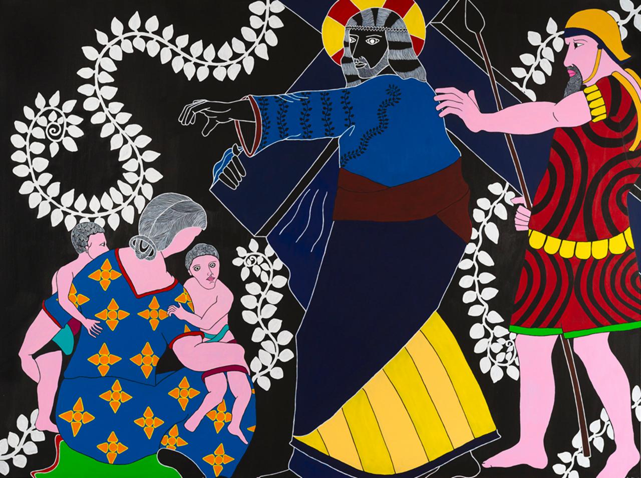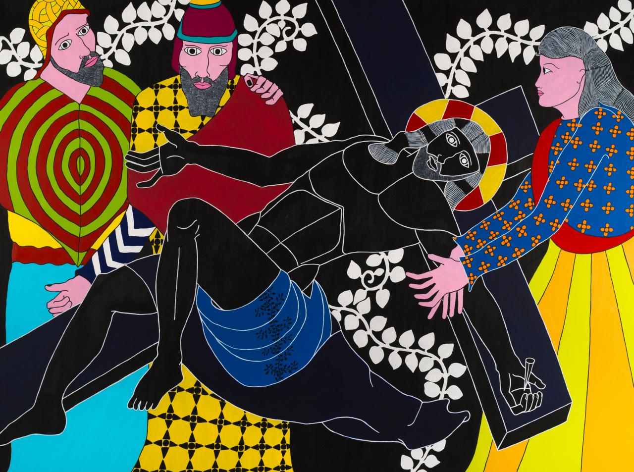 « Quelle mouche pique Stéphane Kenkle pour qu’il décide de peindre un chemin de croix en plein XXIe siècle, sans commande ni illumination pour motif ? Pour qu’il décide de consacrer 15 mois de son temps et de sa vie à la mise en scène des quatorze stations du calvaire de Jésus de Nazareth, seul, en grands formats et grands aplats ? À l’en croire, c’est le souvenir enluminé de gravures ou plus simplement encore de pieuses images divulguées au cours de séances de catéchisme qui l’a guidé depuis l’enfance jusqu’à cette exposition. L’enfance donc pendant laquelle l’image est un langage au moins égal au verbe. Et si ce retour à l’enfance de l’art emmitouflait dans sa mante quelque réminiscence médiévale, naïve et puissamment symbolique ? Et si on s’autorisait à voir dans l’énervement de la liane, le rythme du motif et le choix du bleu transfiguré en rouge à la station X, le retour d’un refoulé moyenâgeux, poétique et direct ? Il me plairait bien à moi, de rêver d’héraldique, de couleurs aux significations doubles, de profils dramatiques, de figures symboliques, de peintures à la fresque en me promenant au milieu des scènes flottantes de ce chemin en croix. Et si je me laissais vraiment aller, voici ce que j’entendrais…