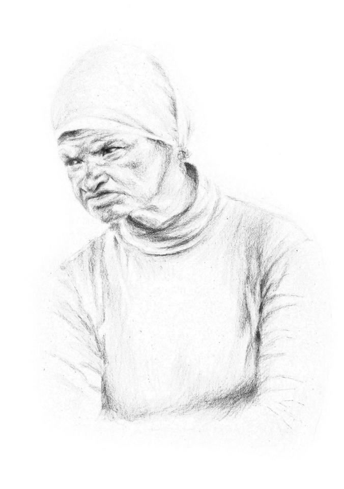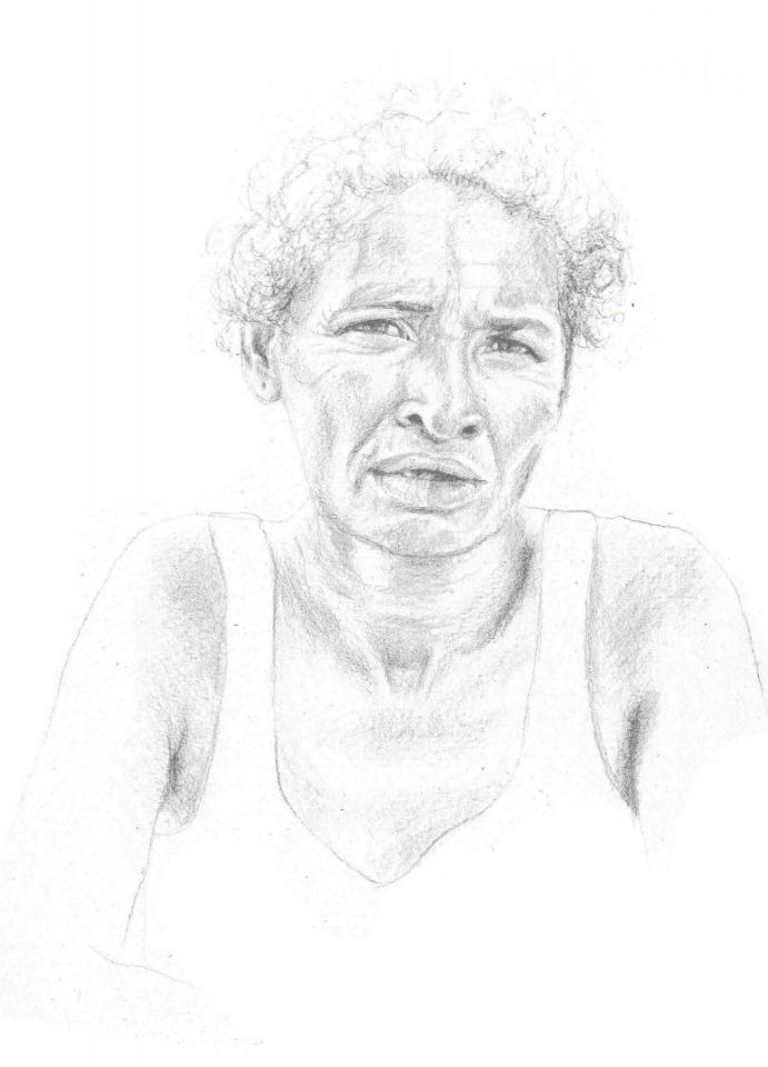 La marginalité de Madame Elyse Colette se situe ailleurs, sans doute la raison du choix d’un fond très différent de celui des autres portraits, un fond très profond, très noir, évoquant le côté sombre de cette femme. Toute la journée, à cap Méchant, elle récite une litanie menaçante, rythmée d’une déambulation à la gestuelle angoissante : un inventaire étrange dans laquelle « diable » et Jésus tiennent une place importante, elle serait animée d’un devoir divin. Sa logorrhée effrayante, sa peau brûlée par le soleil et ses yeux versant des larmes perpétuelles sont magnifiquement rendus en fines couches successives d’acrylique. Stéphanie Hoareau rend compte de son inquiétude, plus loin, le son de cette voix lancinante permet de mesurer cette marginalité énigmatique.