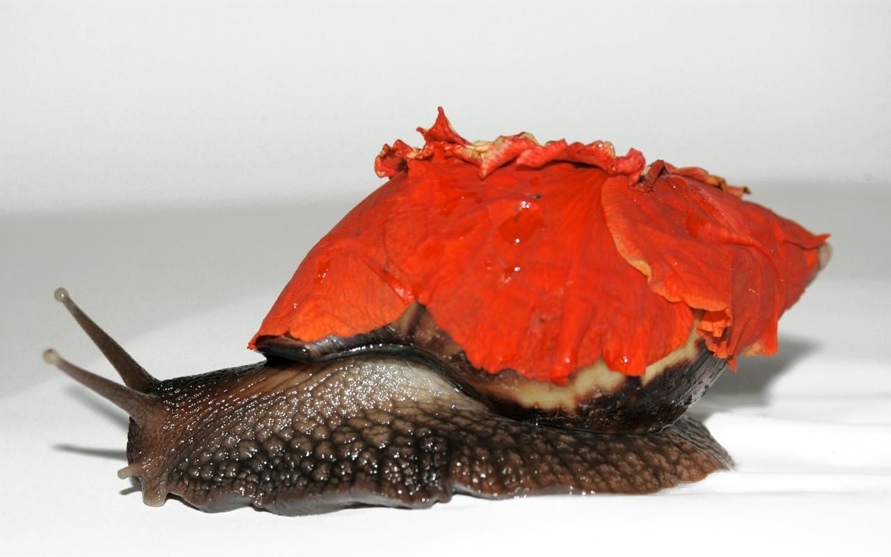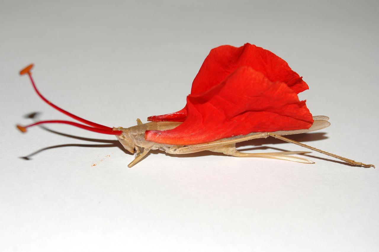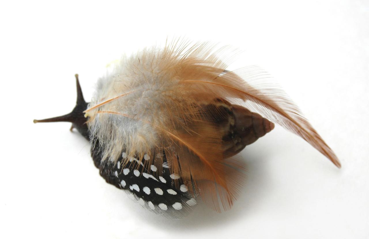 Série de photographies numériques, assemblages d’insectes ou gastéropodes avec des éléments végétaux : pétales de fleurs, plume, lianes.