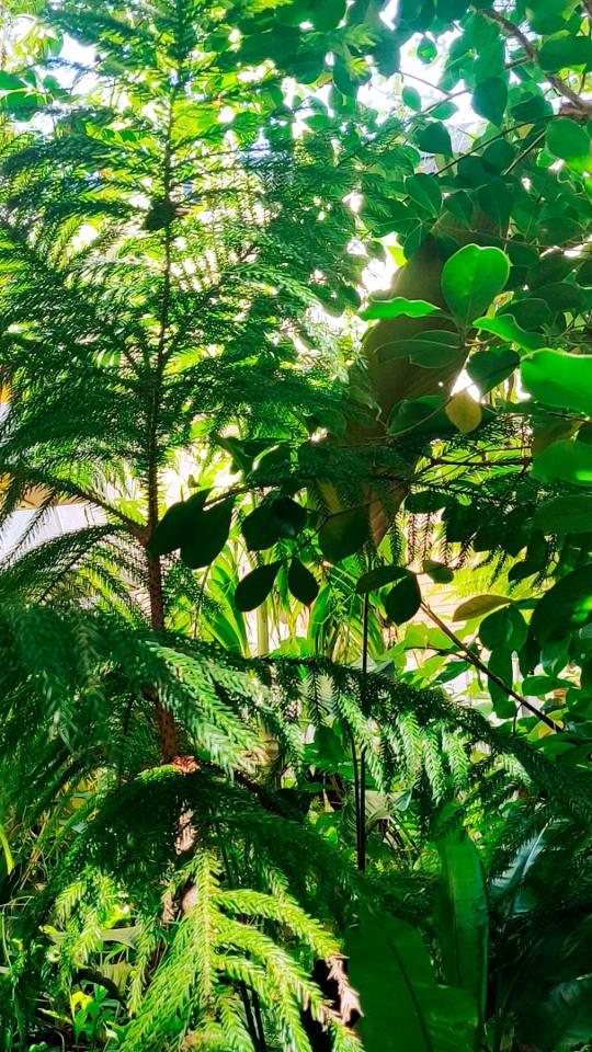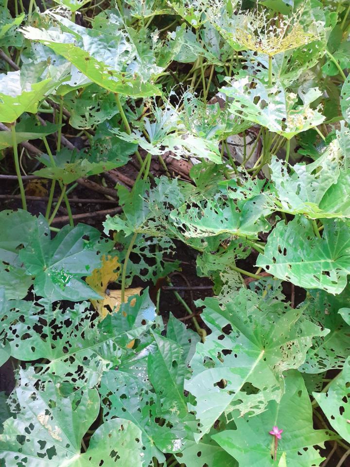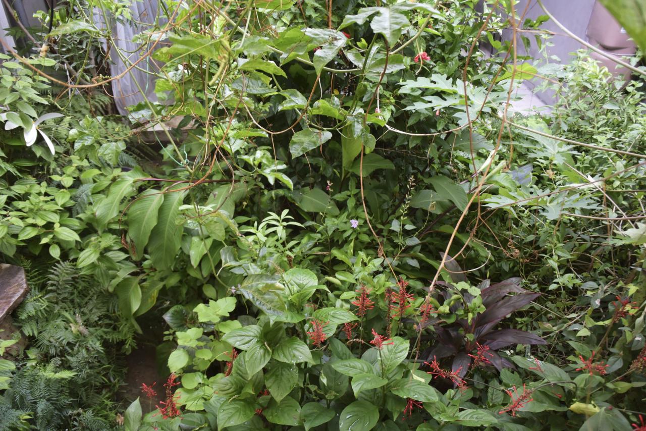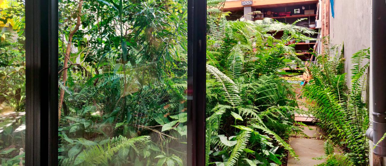 Jardin intégré à l’atelier : installation vivante et espace d’expérimentation, plantes endémiques et exotiques, feuilles mortes, branches, surface 20 m², Saint-André, La Réunion.