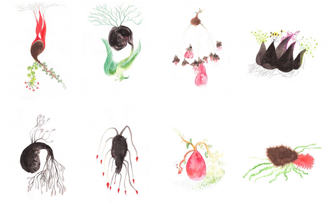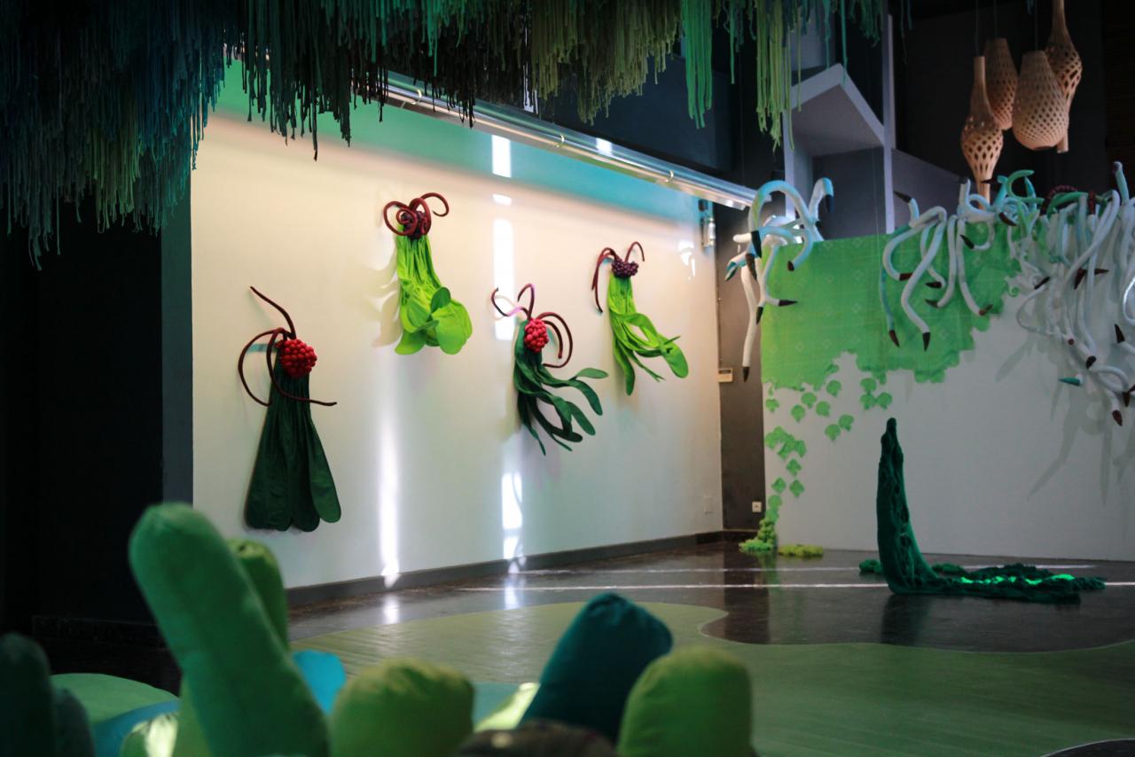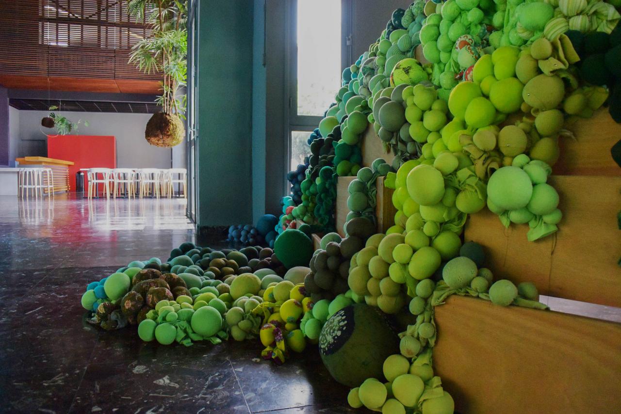 Les gestes vont s’amplifier dans le temps. Les sculptures qui tenaient au départ dans une main vont peu à peu se confronter à l’espace. Dans une stratégie de contamination organique, Tatiana Patchama transpose le monde végétal au moyen de matériaux textiles. À partir de graines collectées dans son jardin, elle réalise une série de dessins de formes cachées à l’intérieur des graines imaginaires (Totototal Off). Les dessins sont ensuite transposés en volumes mous et doux. L’artiste s’intéresse à la graine, ce tout petit élément végétal qui se déplace avec le vent, l’eau, les insectes ou les oiseaux. La graine devient une matrice qui va insuffler une dynamique à l’ensemble de son œuvre fondée sur une observation fine de la nature, de son fonctionnement, de ses formes, de ses cohabitations, de ses besoins. À partir de là, Tatiana Patchama va construire des paysages textiles explorant ce qu’elle nomme « la dimension malicieuse du Vivant. »1 Elle s’inspire plus spécifiquement des adventices (en créole : les zoumines), les herbes folles plus communément appelées les « mauvaises herbes ». Malicieuses, têtues et résistantes, les adventices plantes poussent « là où on ne s’y attend jamais ». Si habituellement les humain·e·s s’obstinent à les domestiquer ou à les éradiquer, l’artiste nous invite à les laisser faire et à accompagner leur pousse. Du sol jusque dans les airs, les paysages textiles habitent l’espace d’exposition.