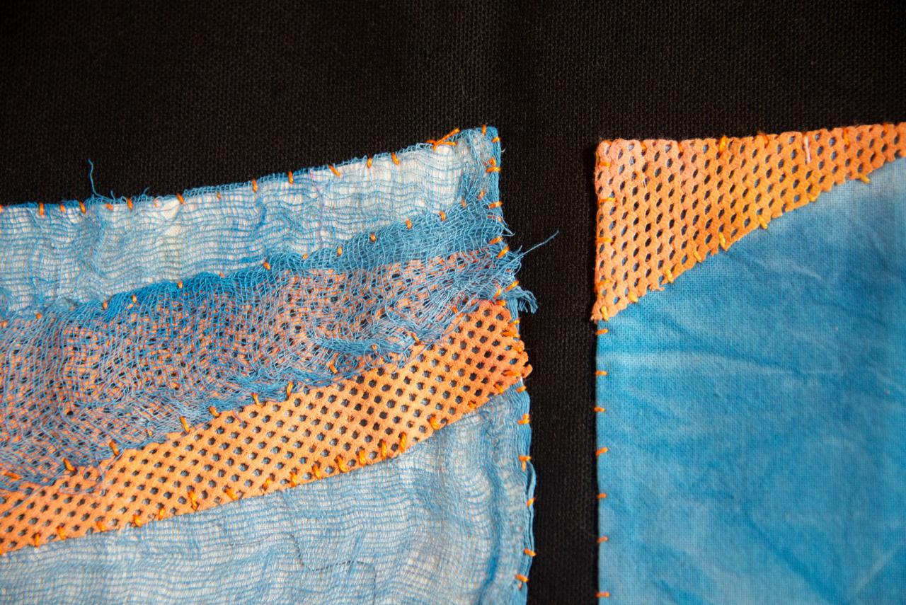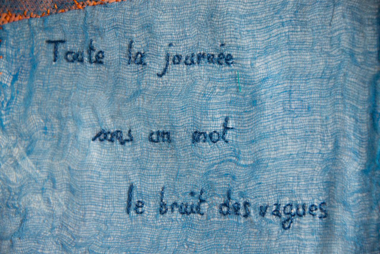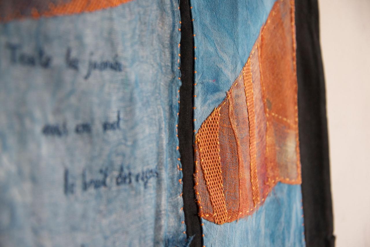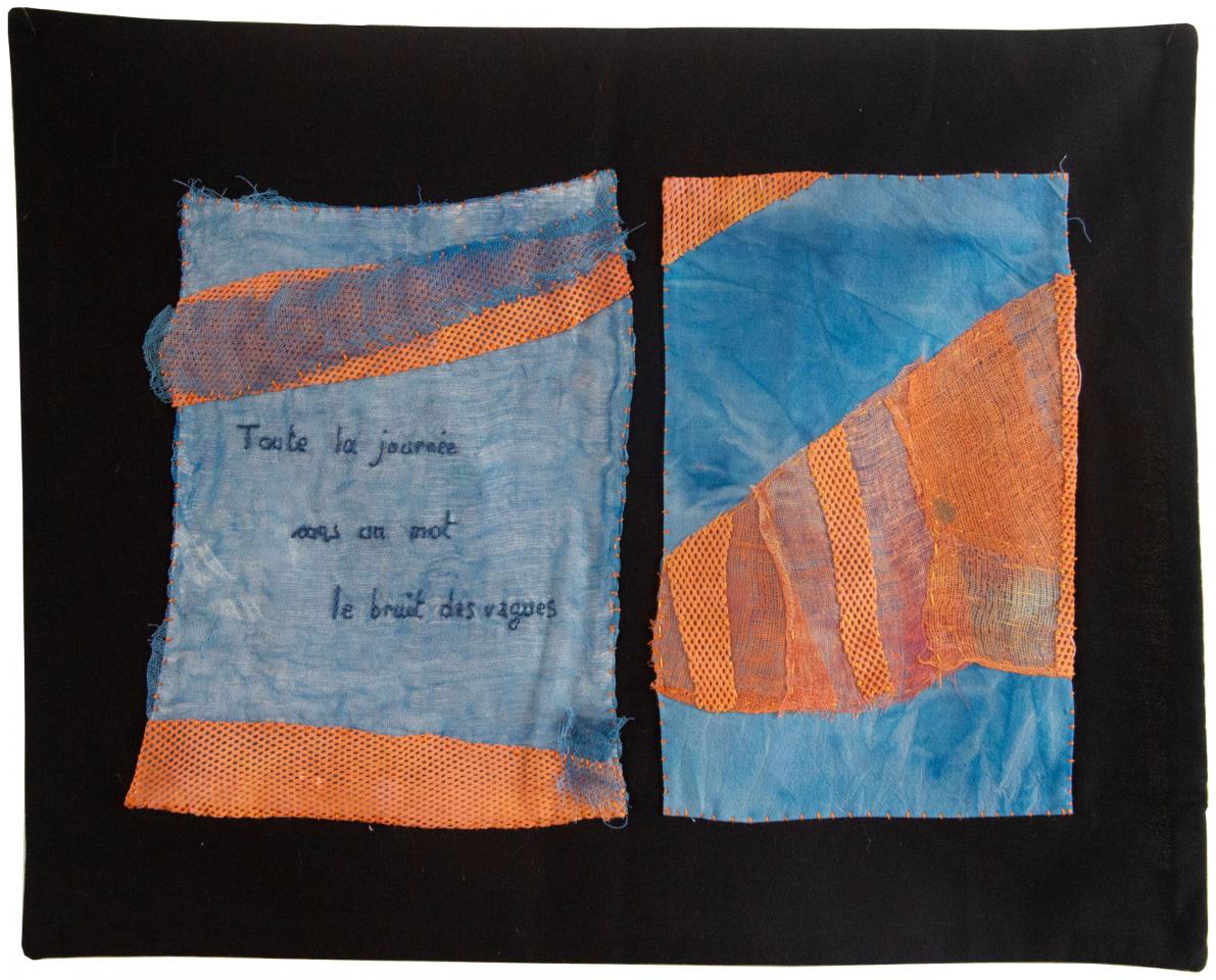 Appliqué de tissus et voiles peints et rebrodés, textes brodés, 42 x 53 cm.