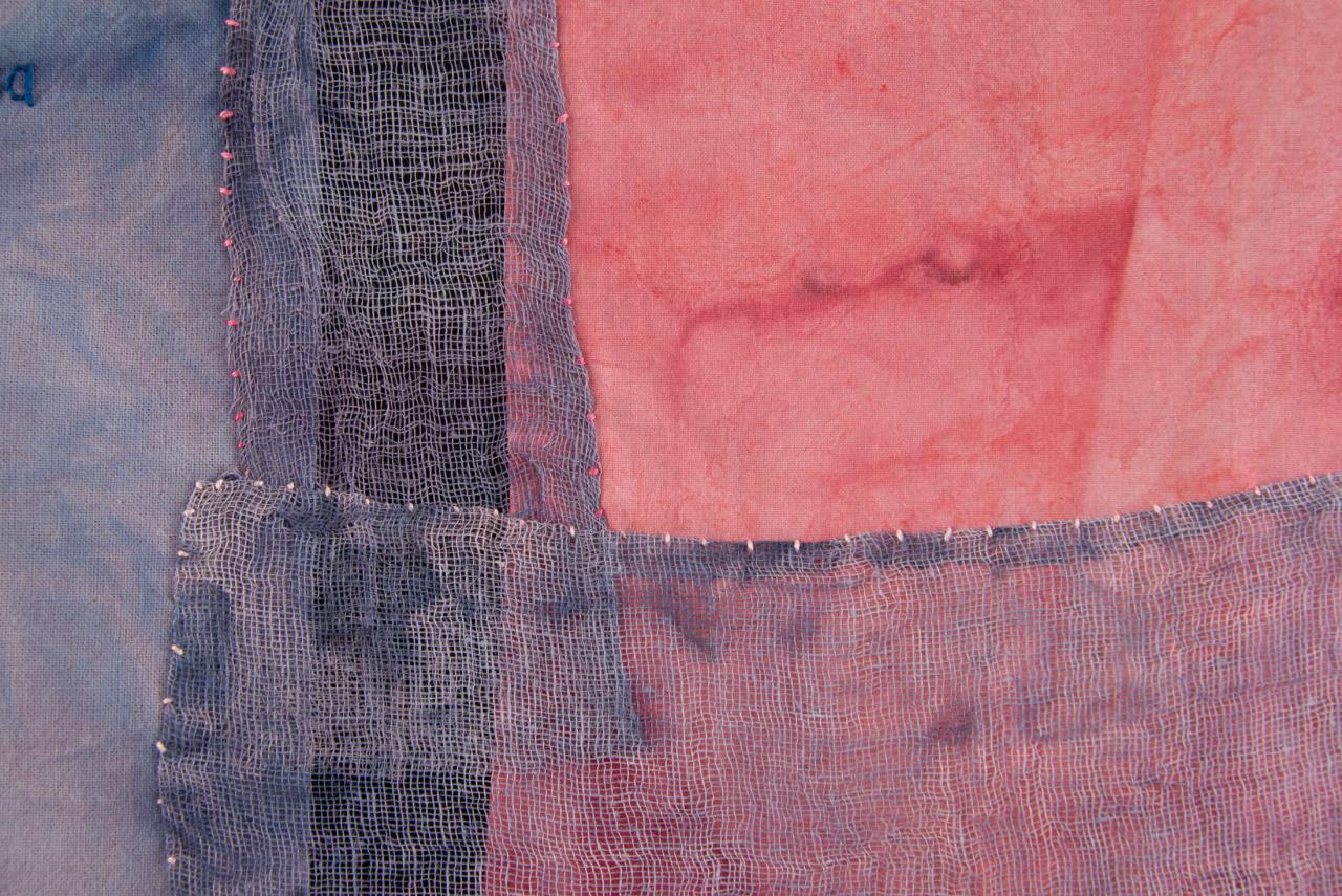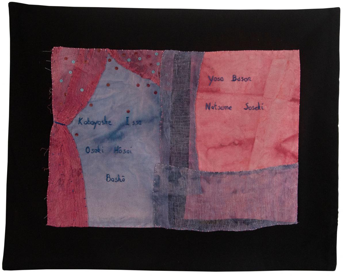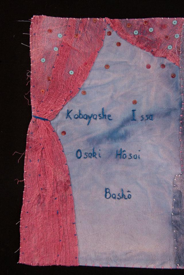 Haïkus Sans titre, 2007Série HaïkusAppliqué de tissus et voiles peints et rebrodés, textes brodés, 42 x 53 cm.Haïkus de :Kobayashi IssaOzaki HōsaiBashōYosa BusonNatsume Soseki