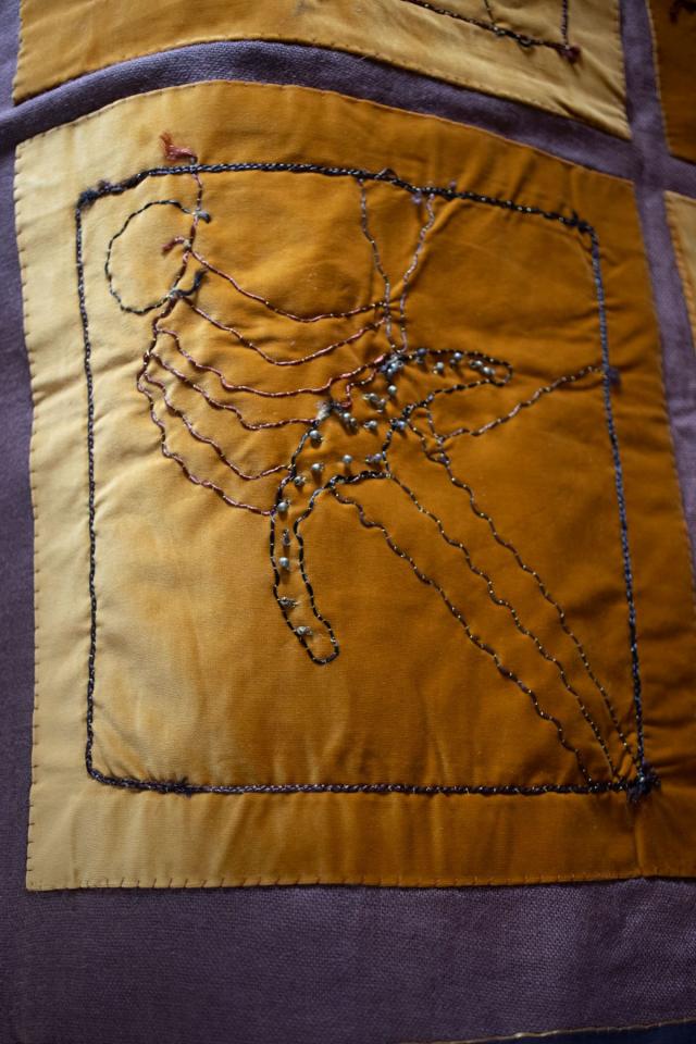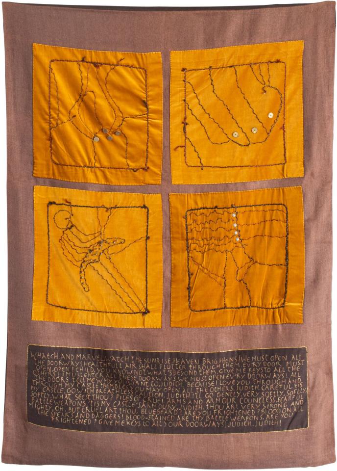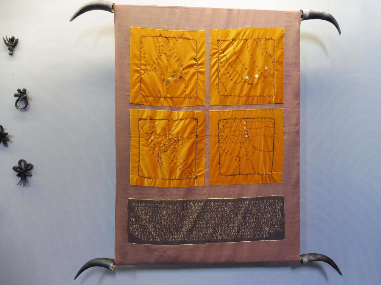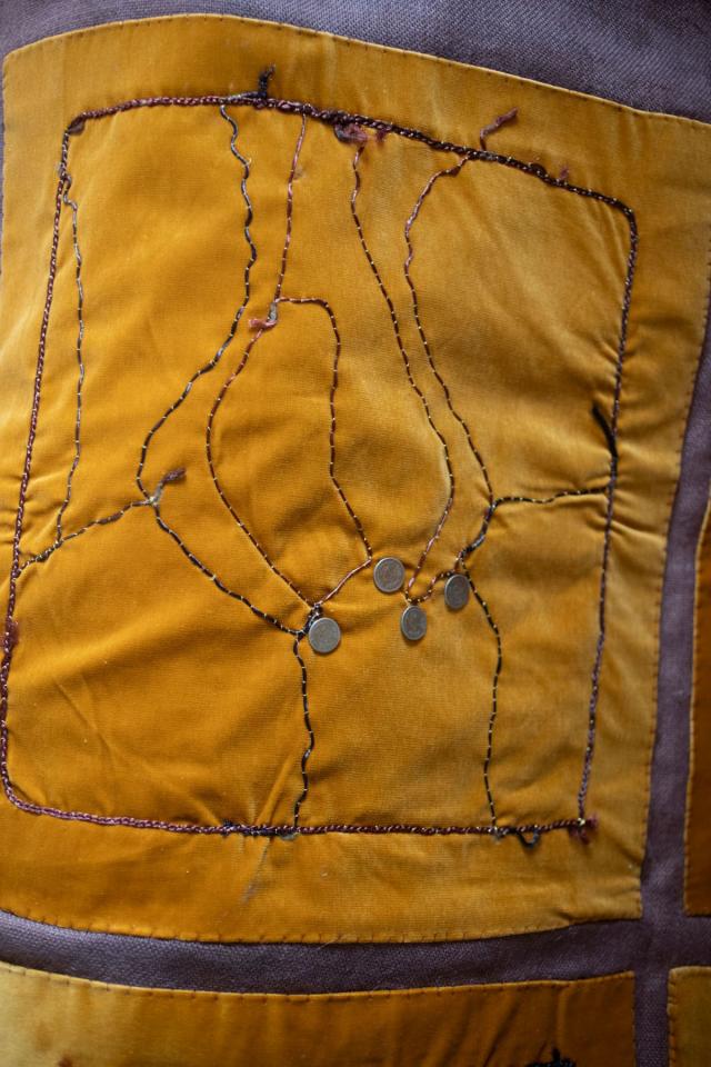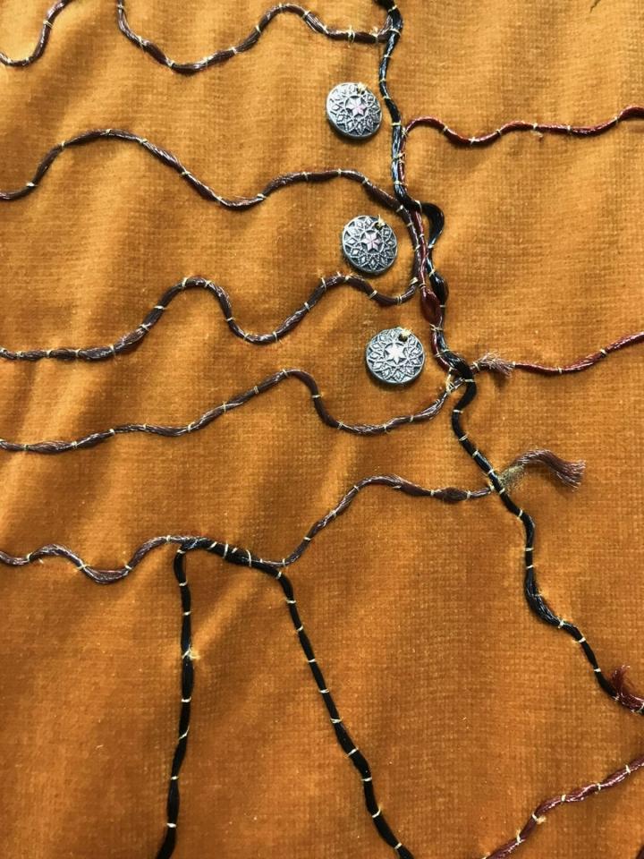 Cheveux tressés appliqués sur fond de velours, boutons d’argent, petits objets en argent, acrylique dorée, 175 x 126 cm.