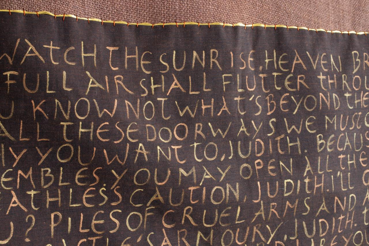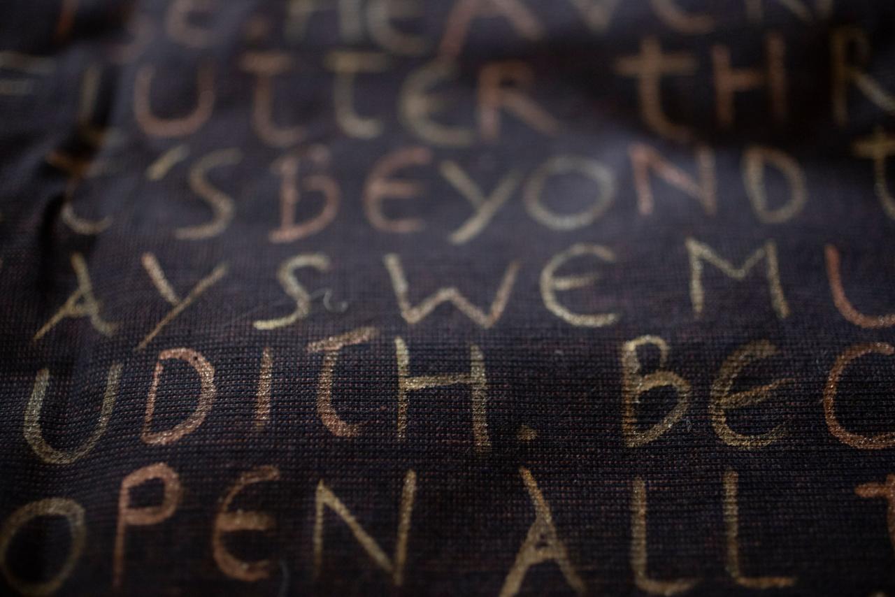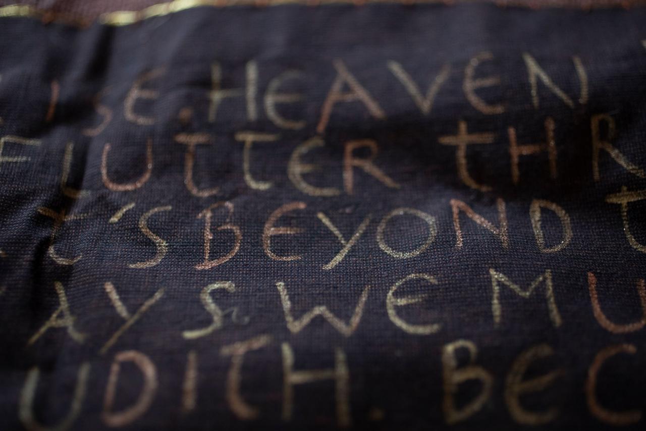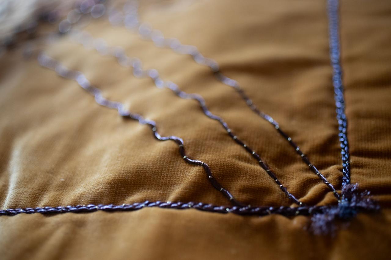 Cheveux tressés appliqués sur fond de velours, boutons d’argent, petits objets en argent, acrylique dorée, 175 x 126 cm.