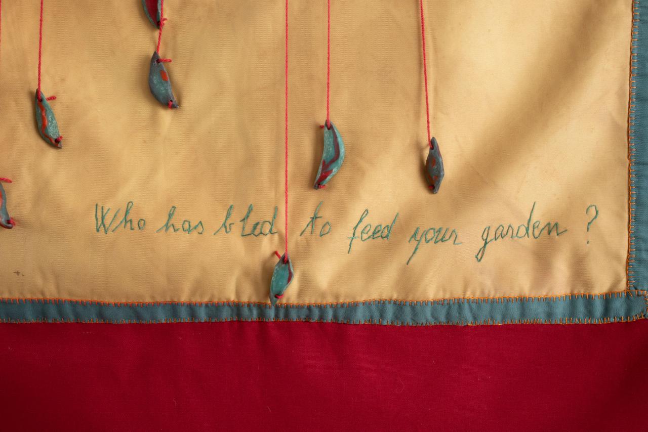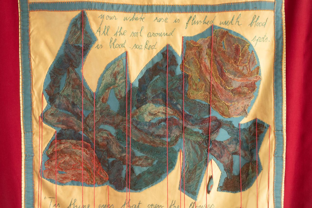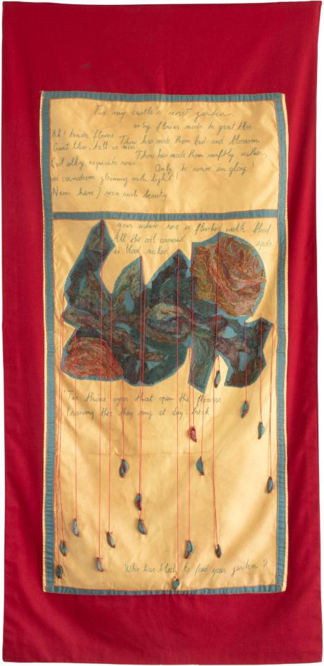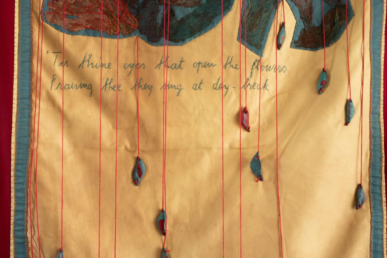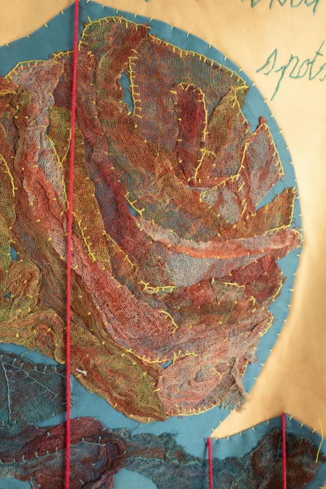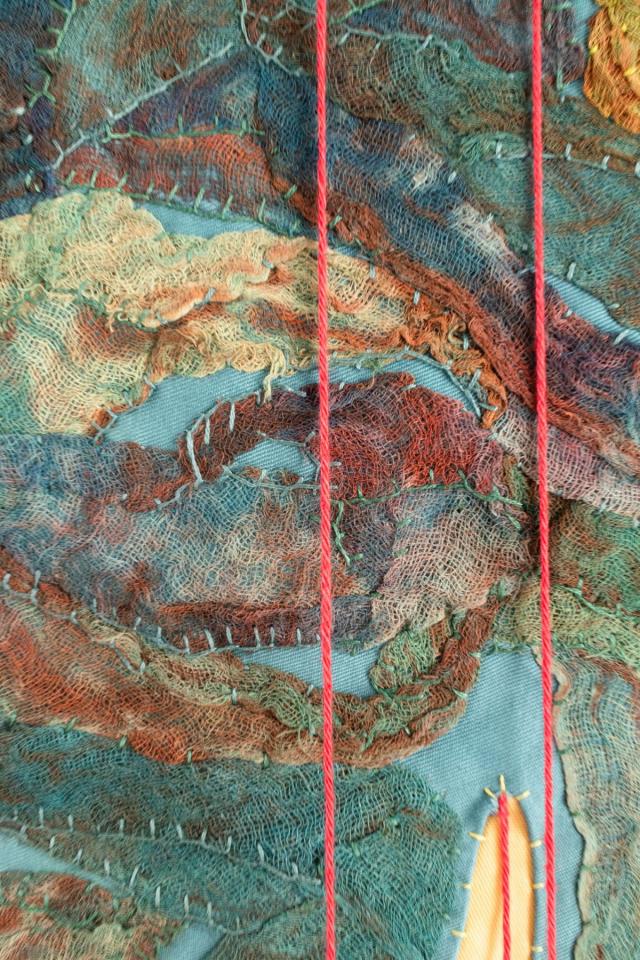 Gaze teinte appliquée, fil, perles, acrylique, 195 x 94 cm.