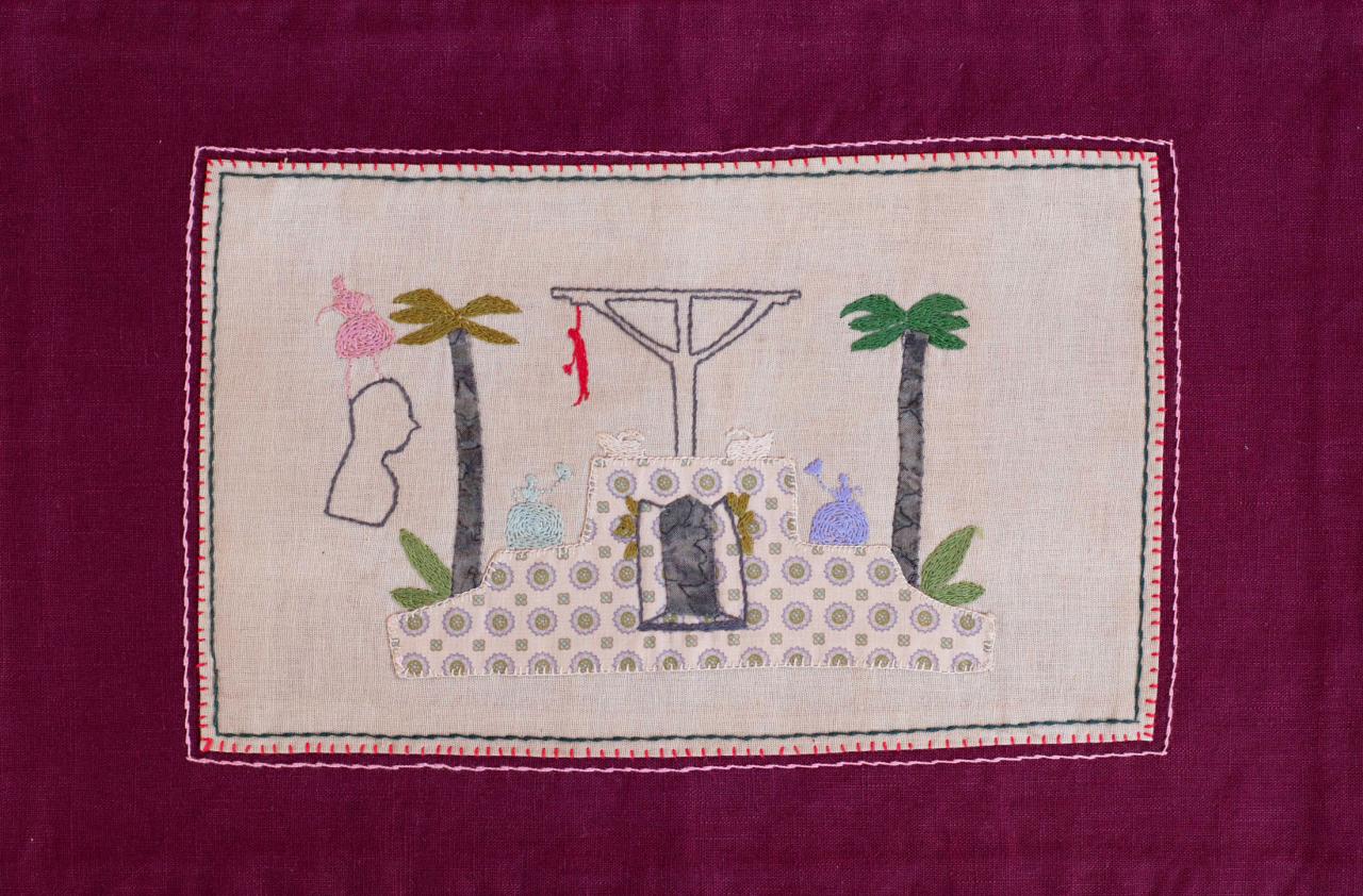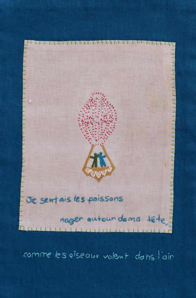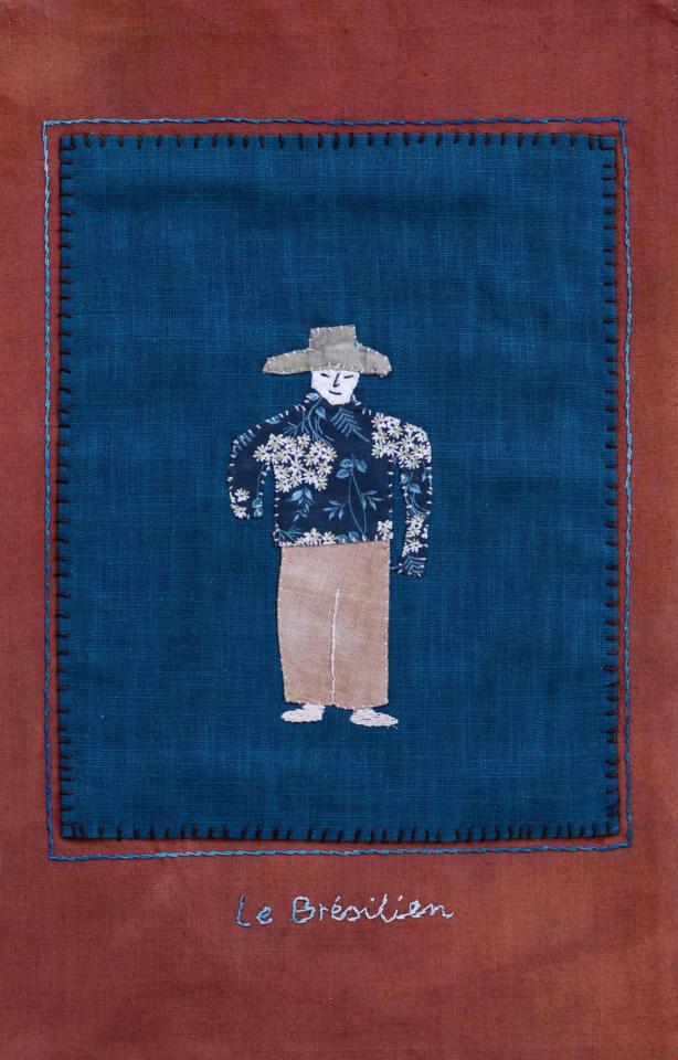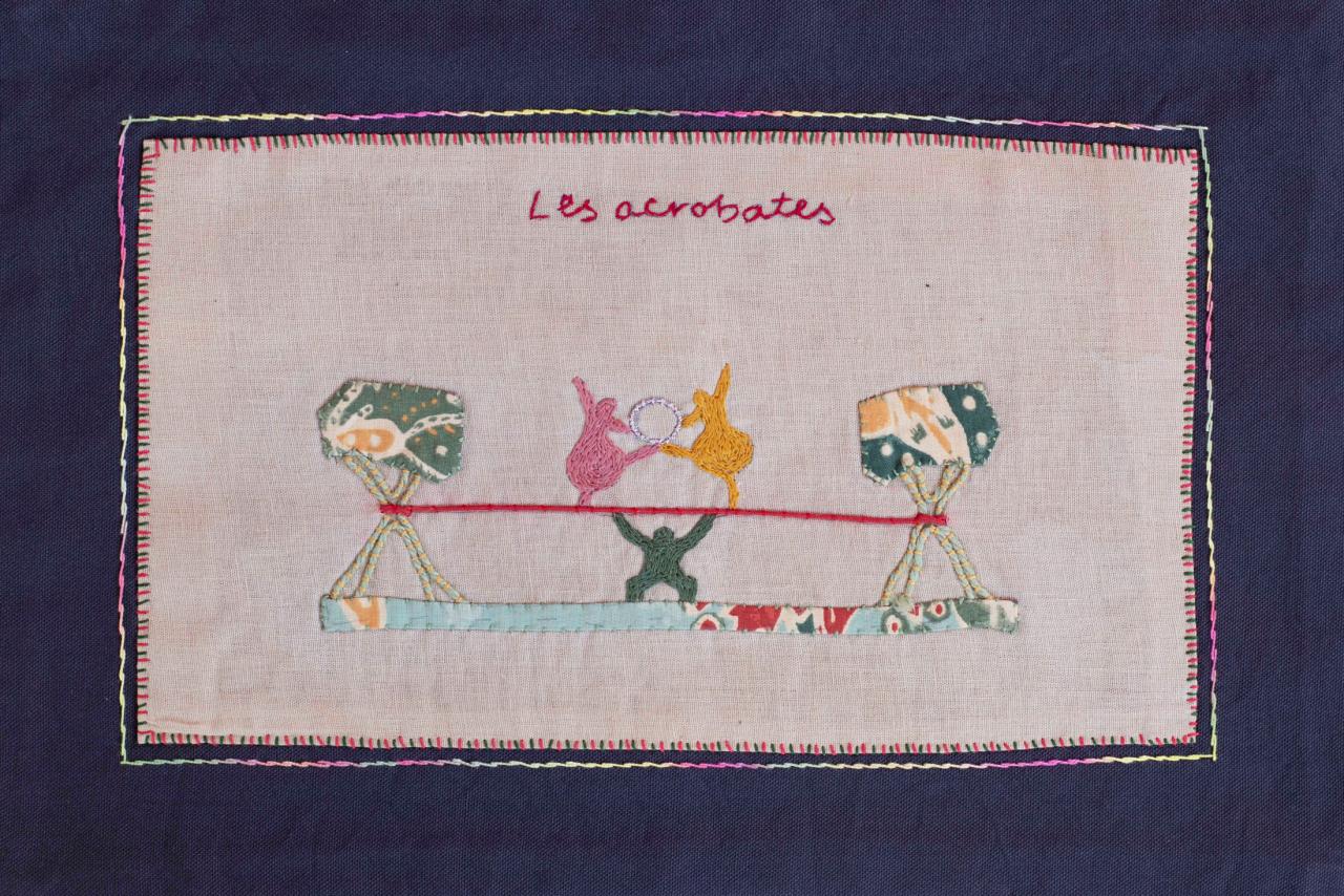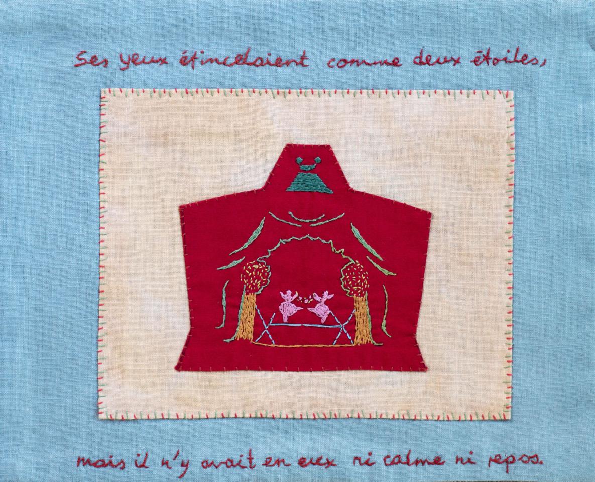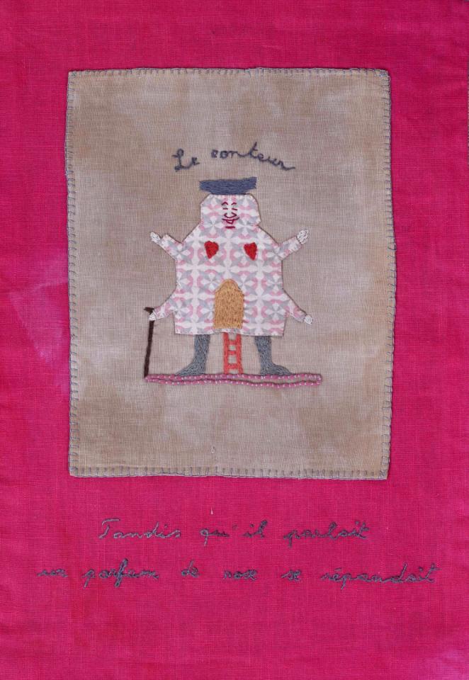La principale série est un ensemble d’une vingtaine de broderies aux formats différents et de tailles modestes. Elles ont été réalisées récemment. En vis-à-vis, un pan vertical, alignement de scènes simples, colorées, en formes découpées dans des tissus et cousues sur un fond de tissus autres aux teintes travaillées par ses soins. Ce pan est comme des pages extraites d’un livre, il date des années quatre-vingt-dix. Et ce choix de deux temps de son œuvre est un des points forts de ce qui nous est montré. Il fait le sens d’une œuvre.