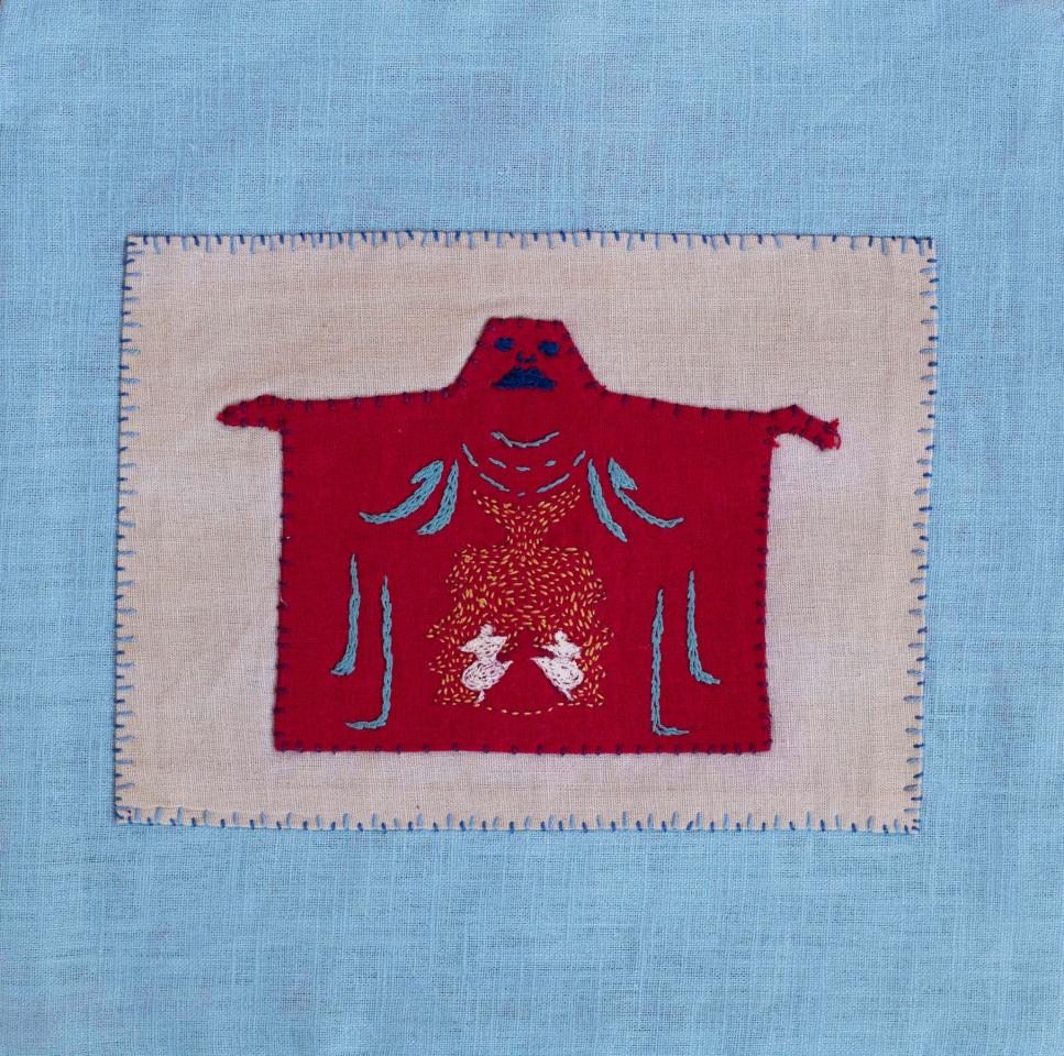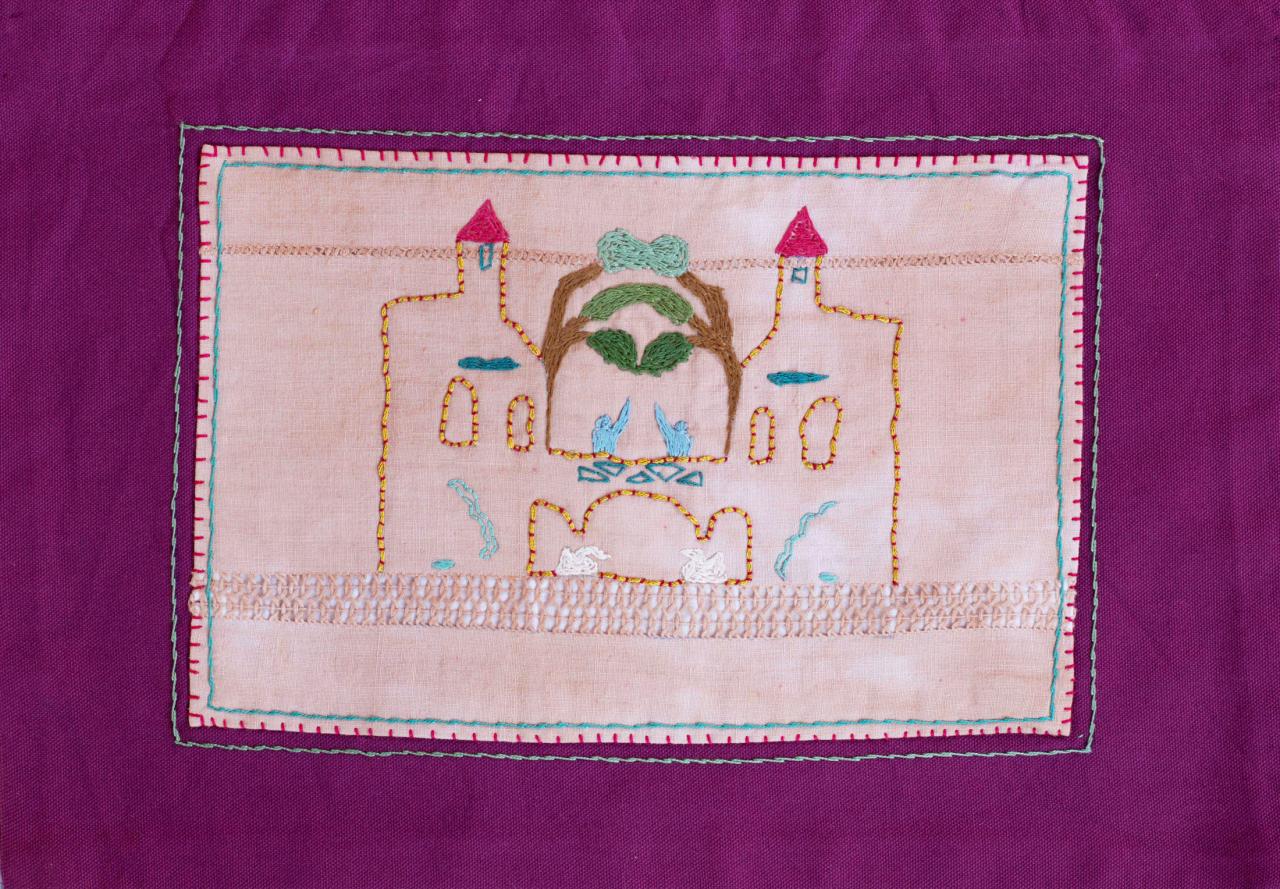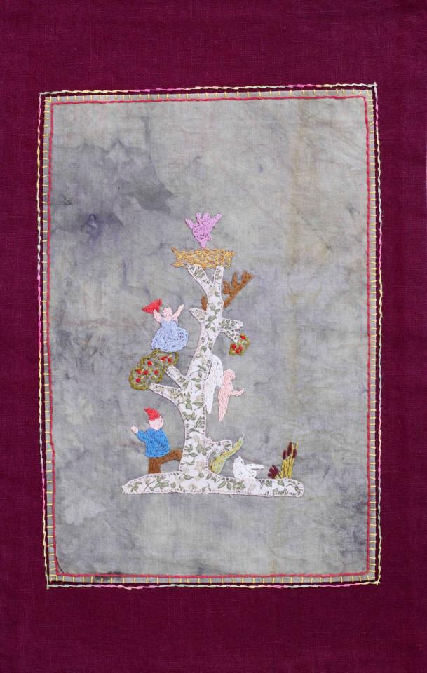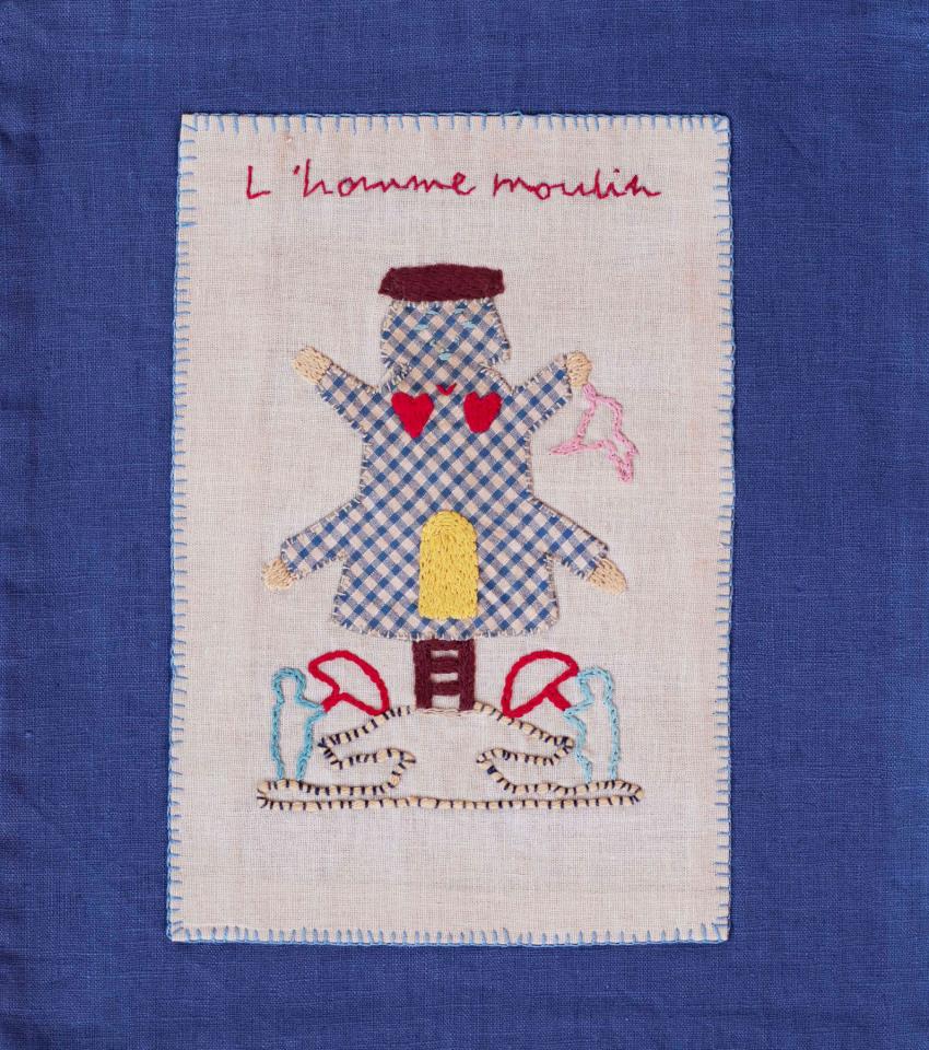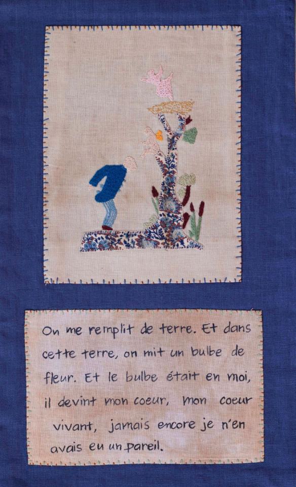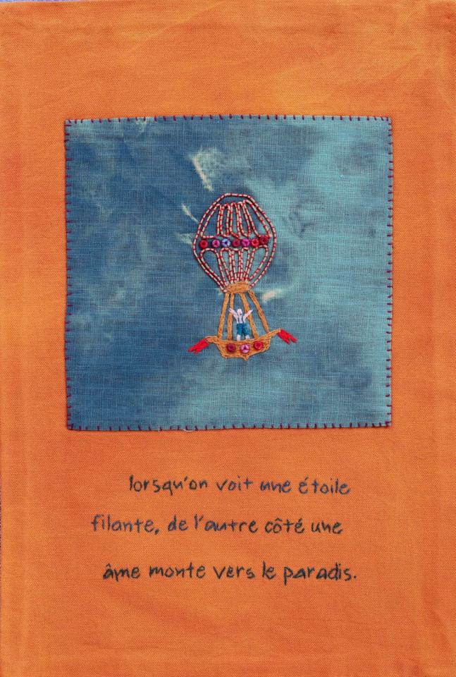 La principale série est un ensemble d’une vingtaine de broderies aux formats différents et de tailles modestes. Elles ont été réalisées récemment. En vis-à-vis, un pan vertical, alignement de scènes simples, colorées, en formes découpées dans des tissus et cousues sur un fond de tissus autres aux teintes travaillées par ses soins. Ce pan est comme des pages extraites d’un livre, il date des années quatre-vingt-dix. Et ce choix de deux temps de son œuvre est un des points forts de ce qui nous est montré. Il fait le sens d’une œuvre.
