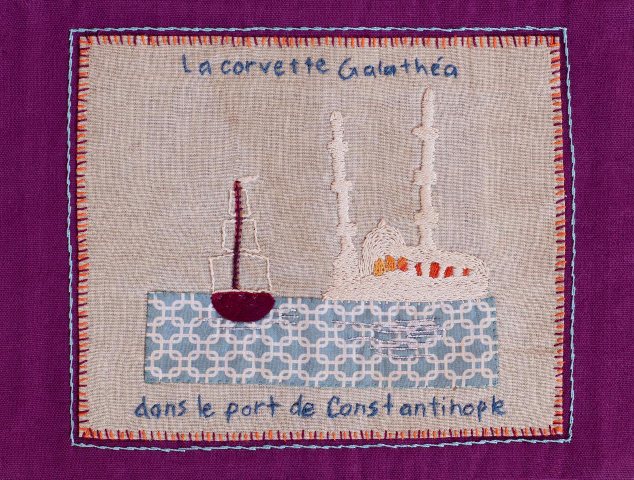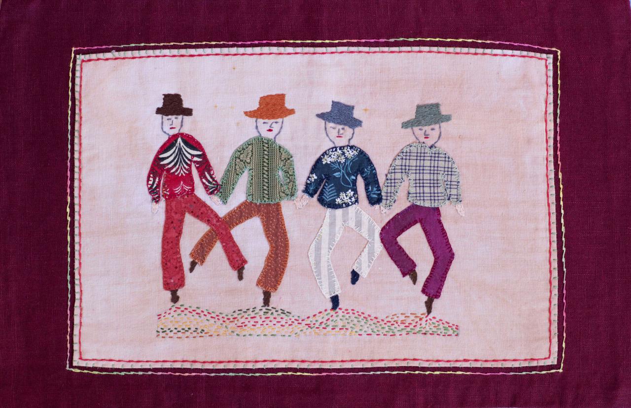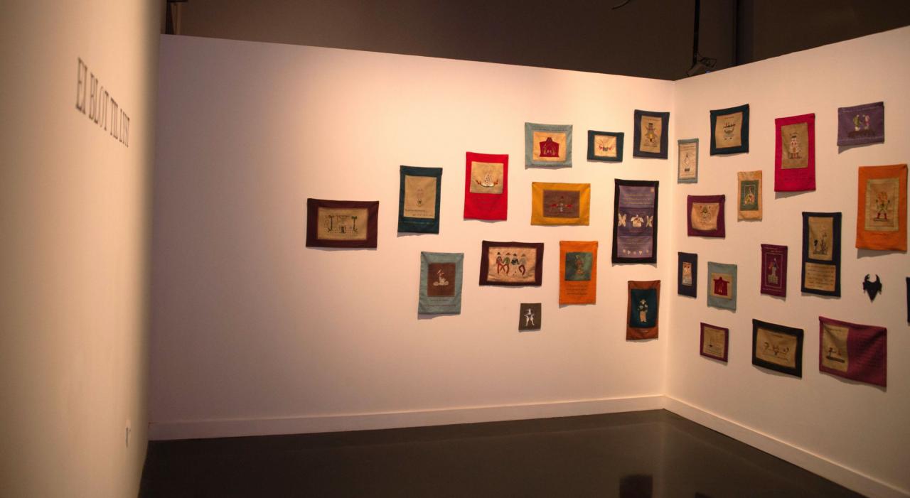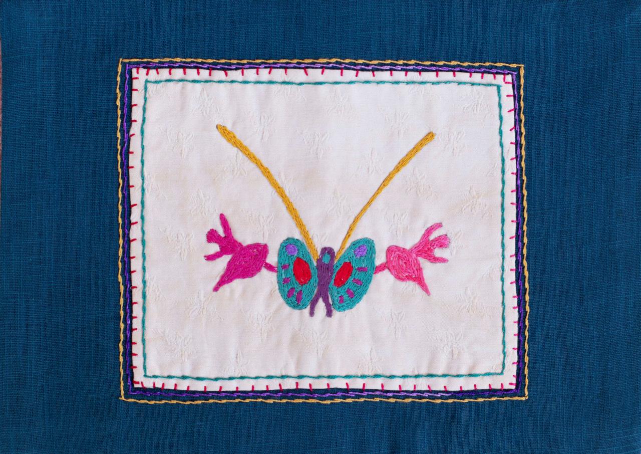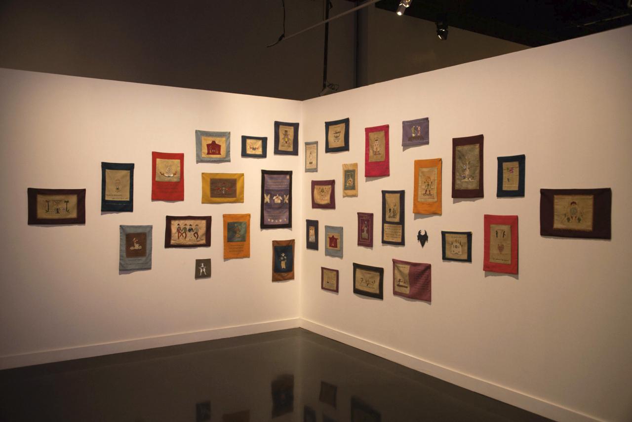 La principale série est un ensemble d’une vingtaine de broderies aux formats différents et de tailles modestes. Elles ont été réalisées récemment. En vis-à-vis, un pan vertical, alignement de scènes simples, colorées, en formes découpées dans des tissus et cousues sur un fond de tissus autres aux teintes travaillées par ses soins. Ce pan est comme des pages extraites d’un livre, il date des années quatre-vingt-dix. Et ce choix de deux temps de son œuvre est un des points forts de ce qui nous est montré. Il fait le sens d’une œuvre.