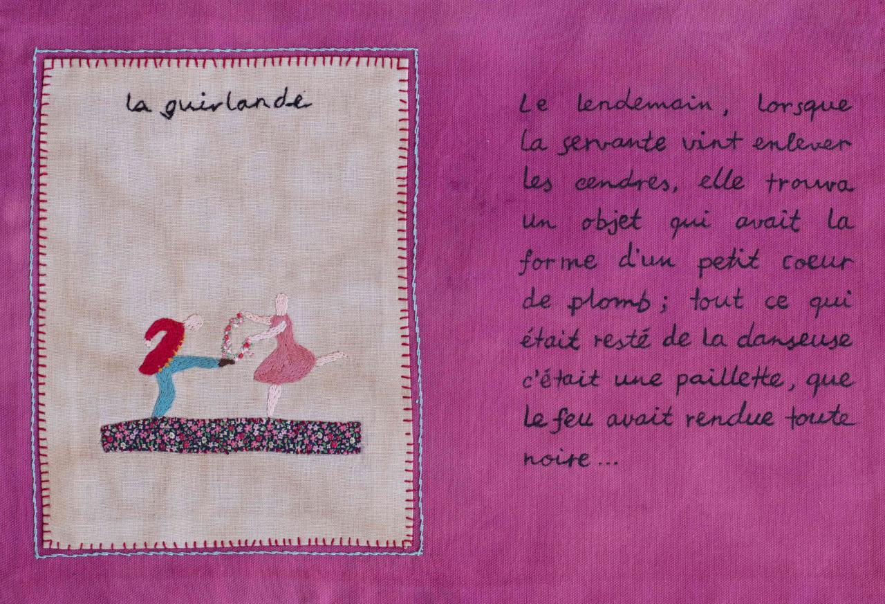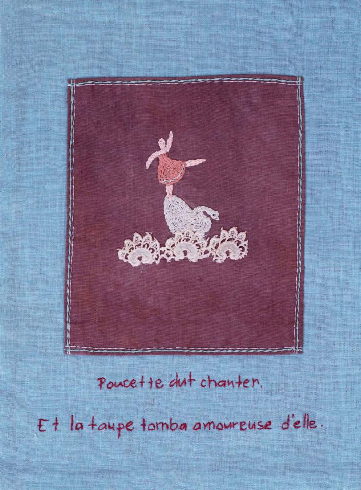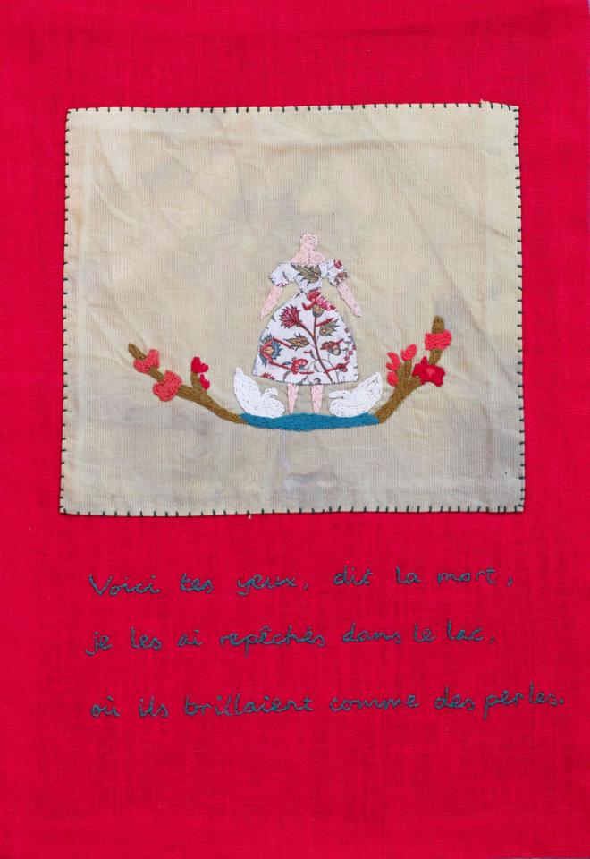 « Les œuvres textiles de Térésa Small s’inspirent des contes, de l’opéra et de la poésie pour convoquer l’imaginaire de l’enfance, dans ses dimensions à la fois merveilleuses et tragiques. Parmi les figures qui accompagnent l’artiste dans ses rêveries quotidiennes, se trouvent les écrivain·es Hans Christian Andersen et Colette ainsi que le compositeur Maurice Ravel, à qui les deux œuvres présentées ici rendent hommage. Papirklip est la toute dernière création de l’artiste. Cet ensemble de broderies sur tissus teints en un subtil camaïeu réinterprète les papiers découpés d’Andersen (dont il tire son titre), en les accompagnant de citations philosophiques qui témoignent des affinités culturelles qu’entretient celle qui grandit au Danemark, avec le célèbre auteur originaire du même pays.