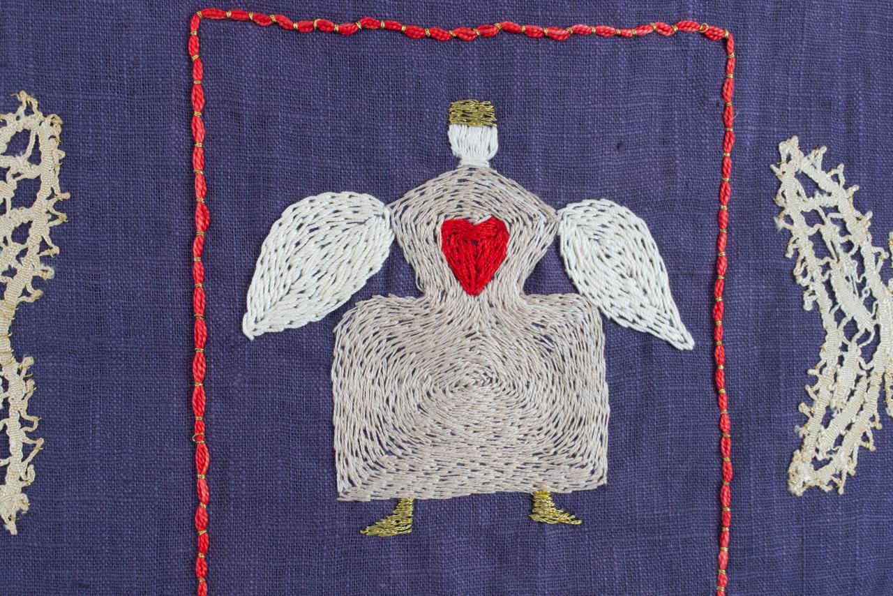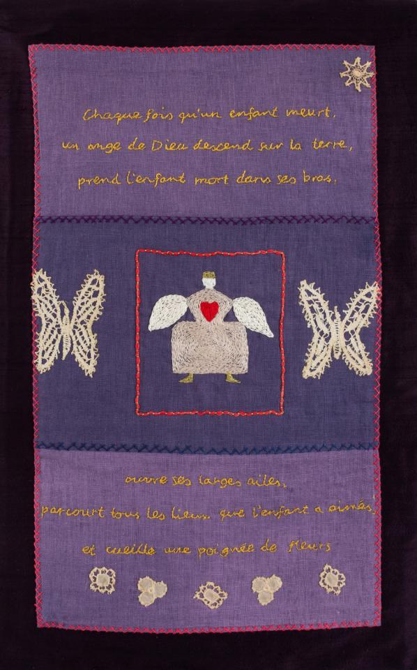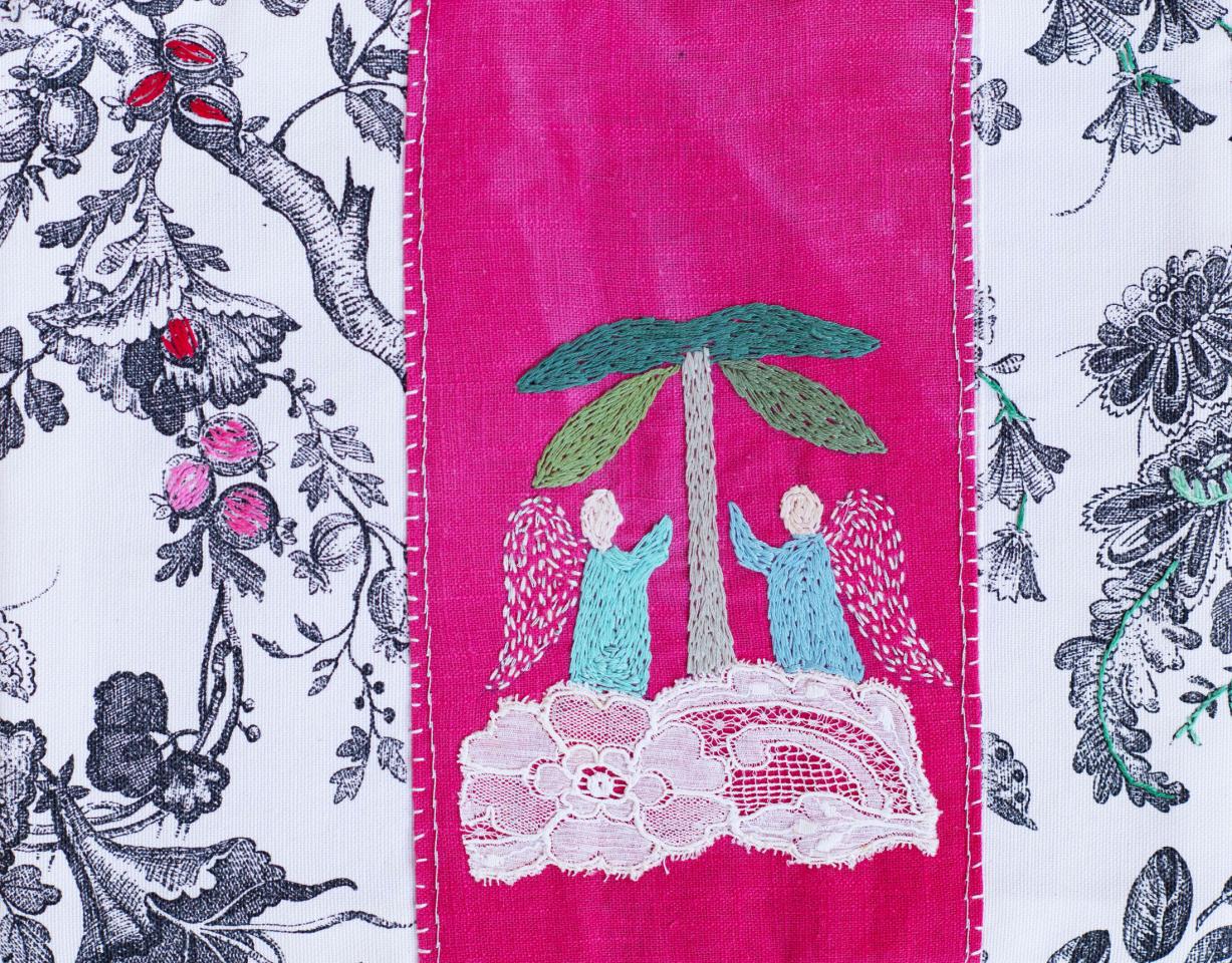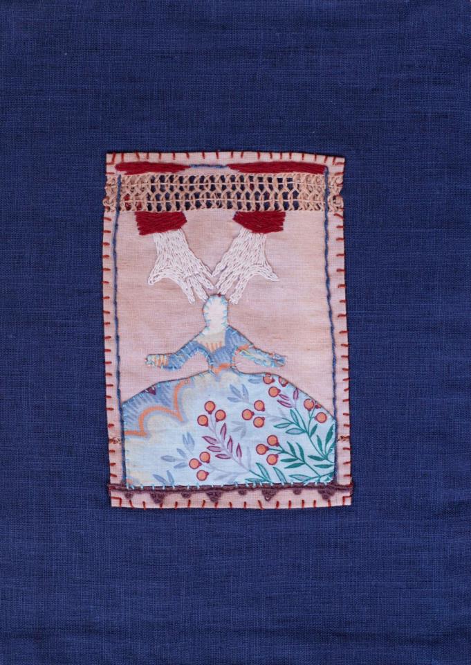 Broderie, appliqués de fil d’or, de ficelle, de dentelle et/ou de tissus (lin, coton, coton ajouré, soie), texte peint sur lin et coton,