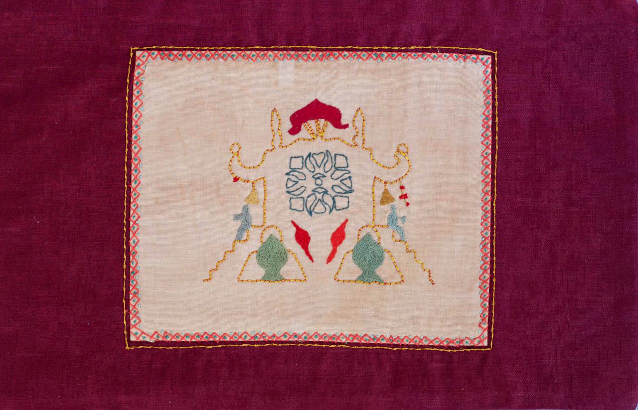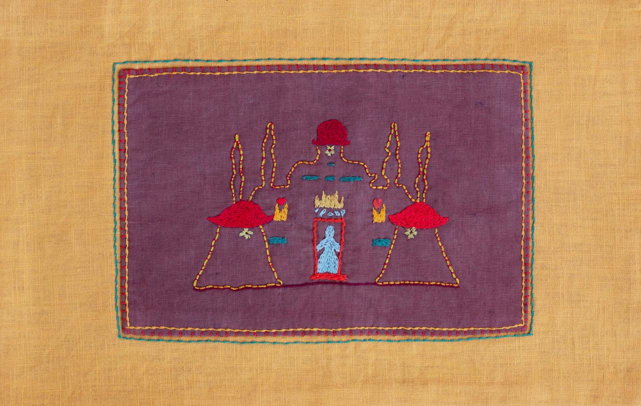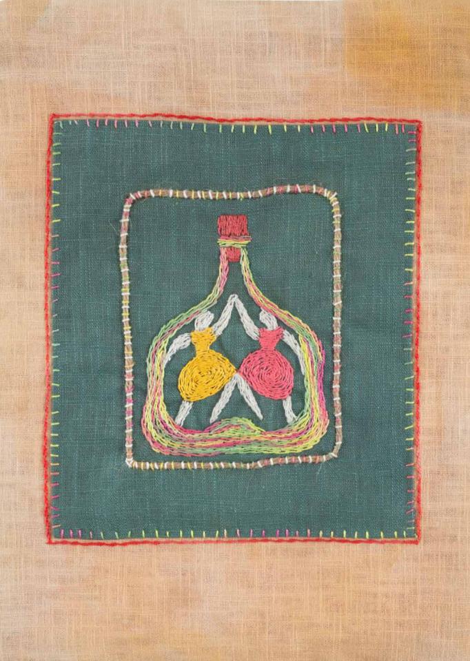 Broderie, appliqués de fil d’or, de ficelle, de dentelle et/ou de tissus (lin, coton, coton ajouré, soie), texte peint sur lin et coton,
