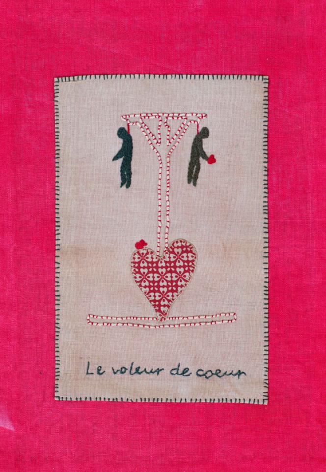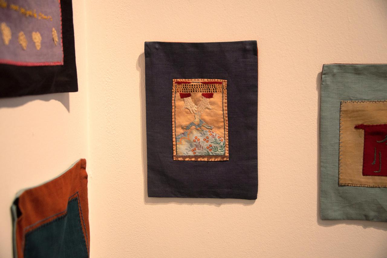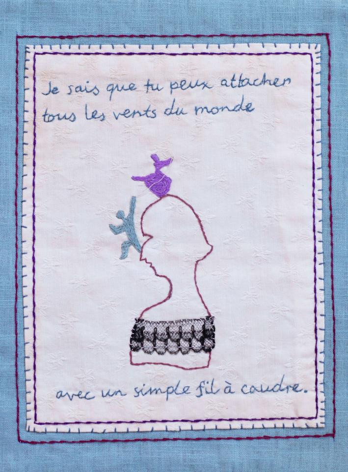 L’ensemble a été un moment d’émerveillement pour moi. Du plaisir à être face à ces œuvres d’une simplicité apparente. Plaisir procuré par quoi ? D’abord la cohérence des œuvres choisies et leur agencement. Ici, l’accrochage très discret techniquement se veut une promenade. Pas de lecture obligatoire pour le visiteur. Pas de certitude sur l’ordre proposé si ce n’est l’envie d’une proximité entre les broderies pour que ça se parle et nous invite à tisser des liens. Un sentiment de richesse s’en dégage. L’impression de n’avoir pas tout vu est là, une fois sorti de la salle.