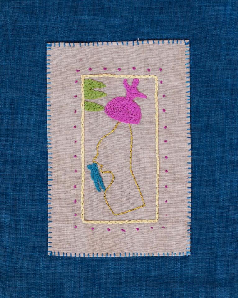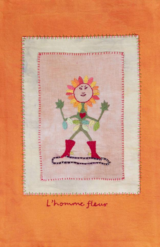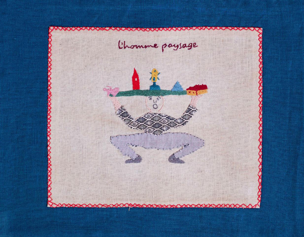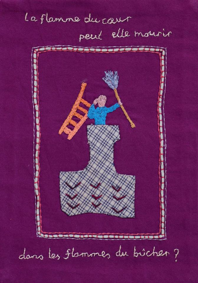 Plaisir devant chaque broderie où la minutie du geste manuel n’est ni démonstrative, ni flamboyante. Elle est le fruit d’un travail qui n’a pas la volonté de faire force mais se situe du côté de la séduction, de l’artisanat intemporel, du mouvant des matières, de la présence de chaque teinte. Des maladresses de dessins ne sont pas effacées, des assemblages de couleurs ne sont pas systématiques, et les choix produisent ici une agréable diversité vivace. Rien n’est cadenassé, rigide chez Térésa. Broderie d’une phrase ou pas, figure abstraite ou pas, scène encadrée ou pas, carré ou rectangle, paysage ou portrait. Une petite pièce en terre cuite s’invite avec bonheur.