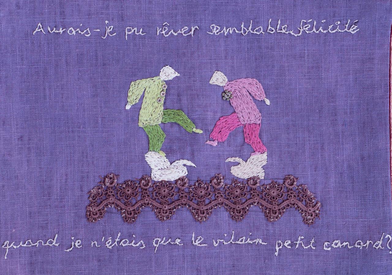 L’artiste n’a pas à se convaincre ou à nous convaincre d’une position ferme à tenir, elle crée au profit du moment, de son intuition, de sa vie de tous les jours, de son émotion, de son histoire personnelle. Je l’imagine en Pénélope, amoureuse d’un homme venu d’un autre temps (Andersen), d’un autre lieu, parti en voyage, et qu’elle évoque patiemment. Il y a une rencontre, et il y a une tendresse, et des tissages. Ça se tisse. C’est avec une certaine maturité, un « dégagement » que se partagent ses dernières créations.