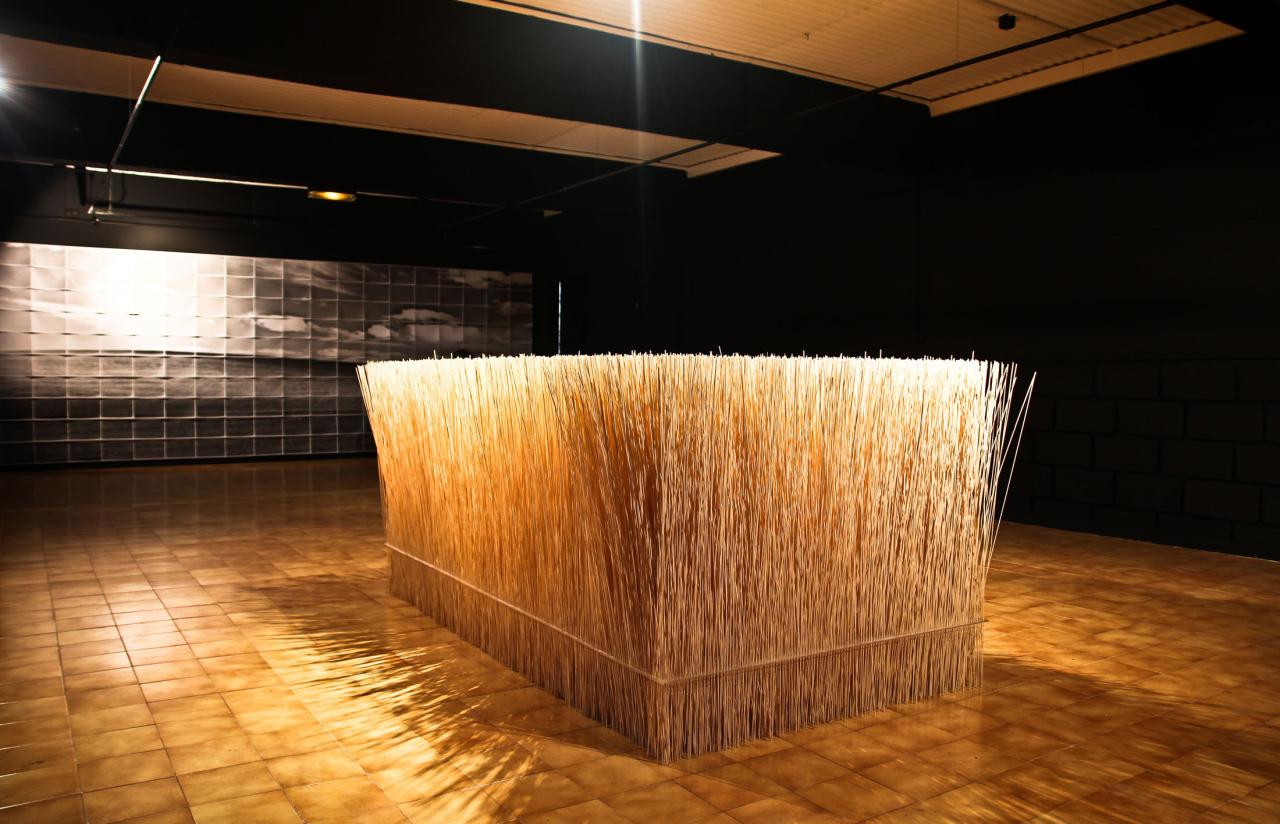 Sculpture, plexiglas, 25 000 tiges, 120 x 220 cm.