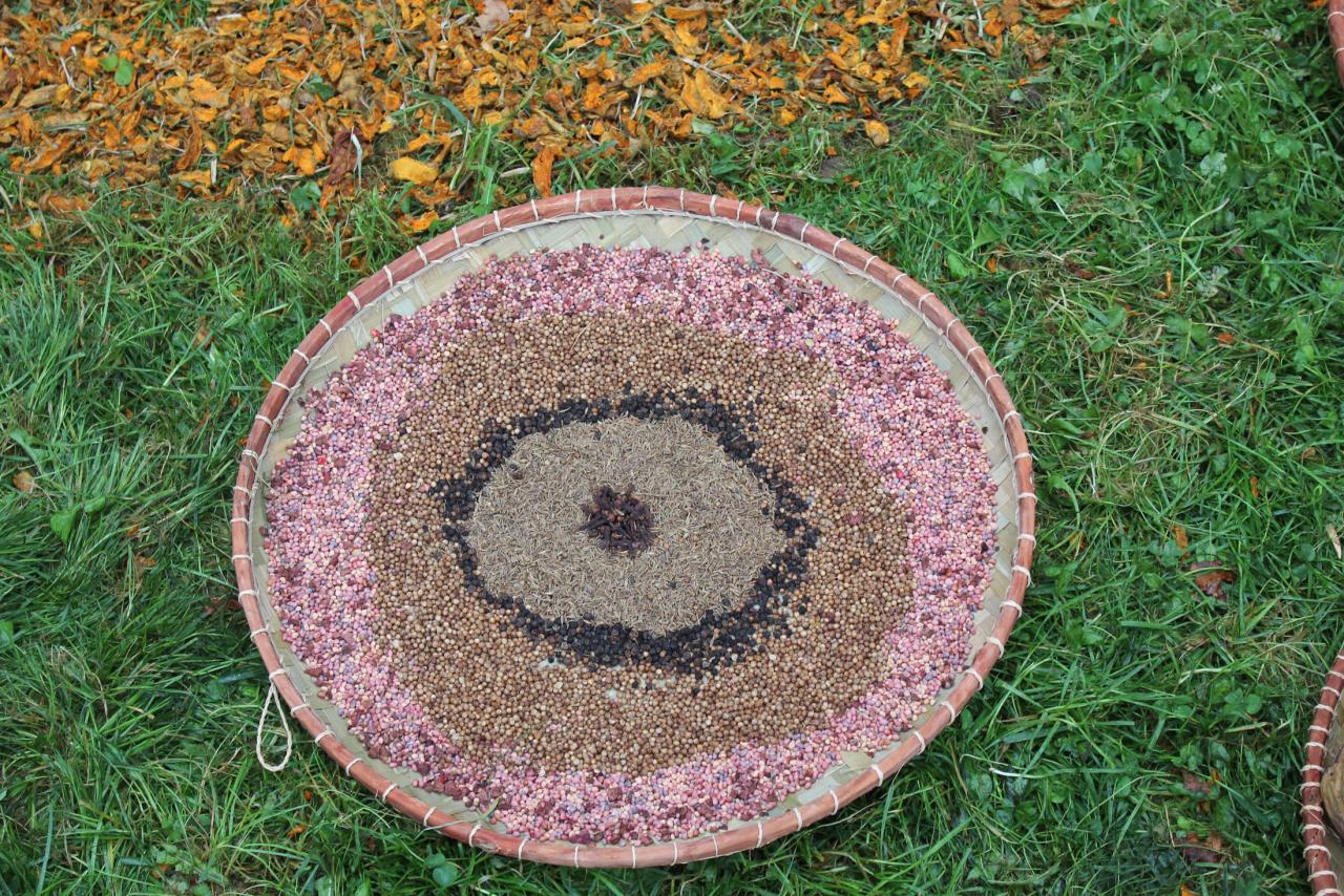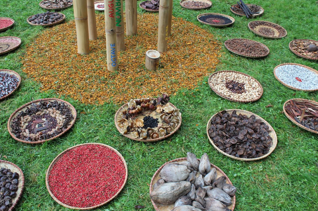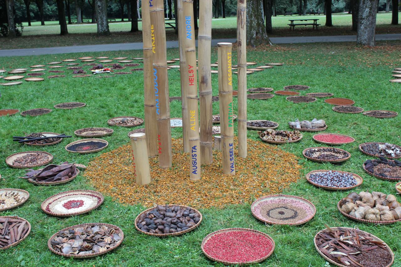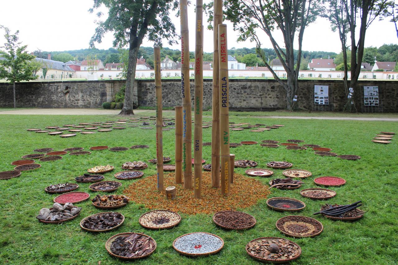 Au centre de l’installation, un disque empli de curcuma. Épice commune à la cuisine péi et dont l’usage comme pigment évoque la spiritualité, l’expression de la conscience humaine qui émerge et tend à s’élever… comme les 9 bambous qui constituent le centre de l’œuvre - ou plutôt les centres. Chacun d’entre eux porte une généalogie dont les racines sont autant de continents et de cultures. Afrique, Inde, Chine, Madagascar, Comores, Bretagne, Espagne, Réunion.