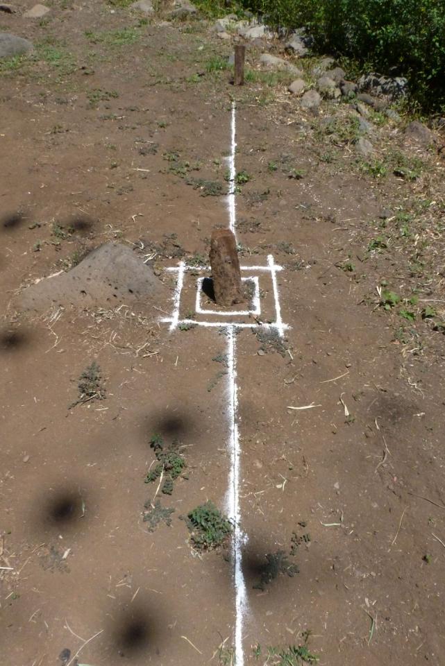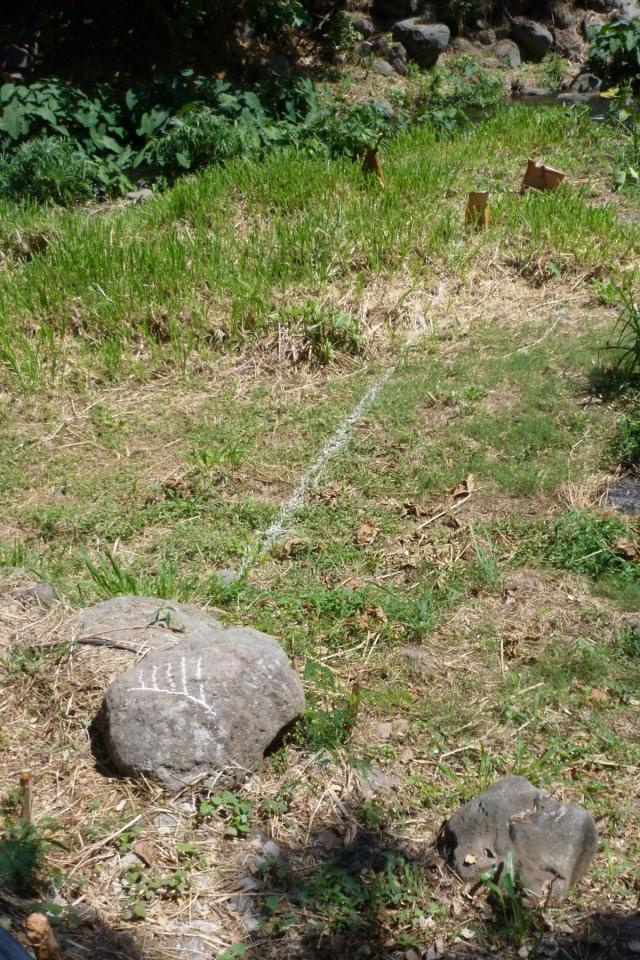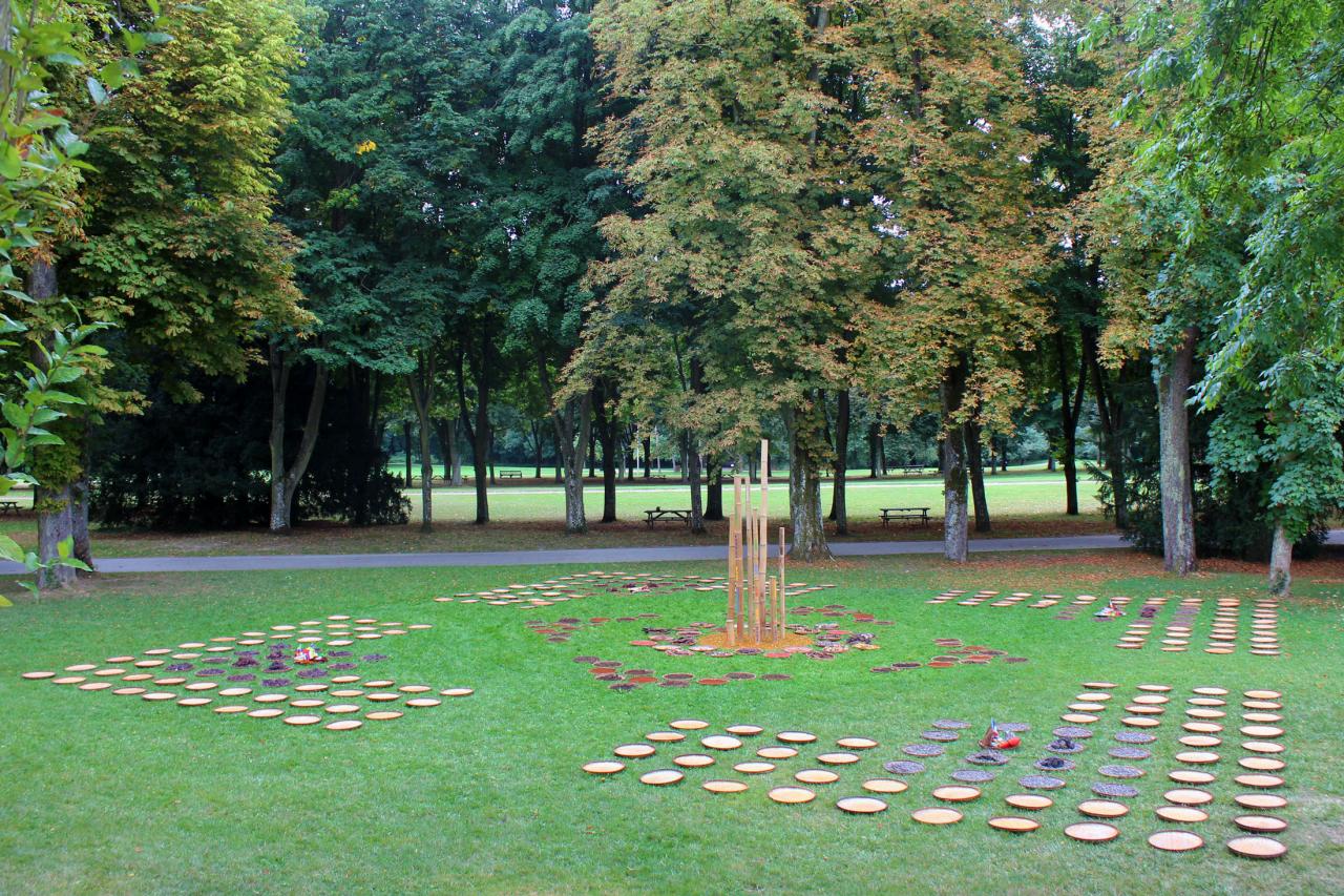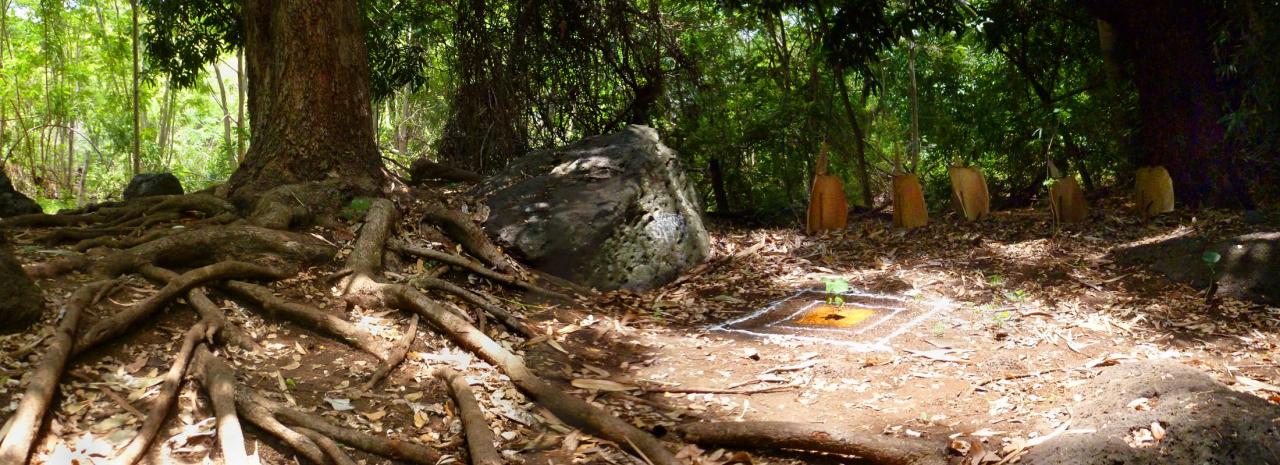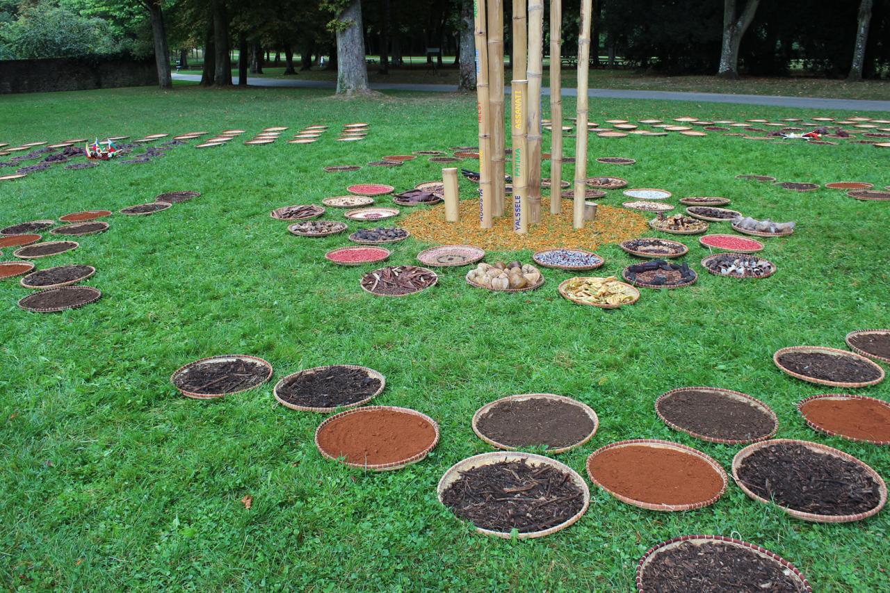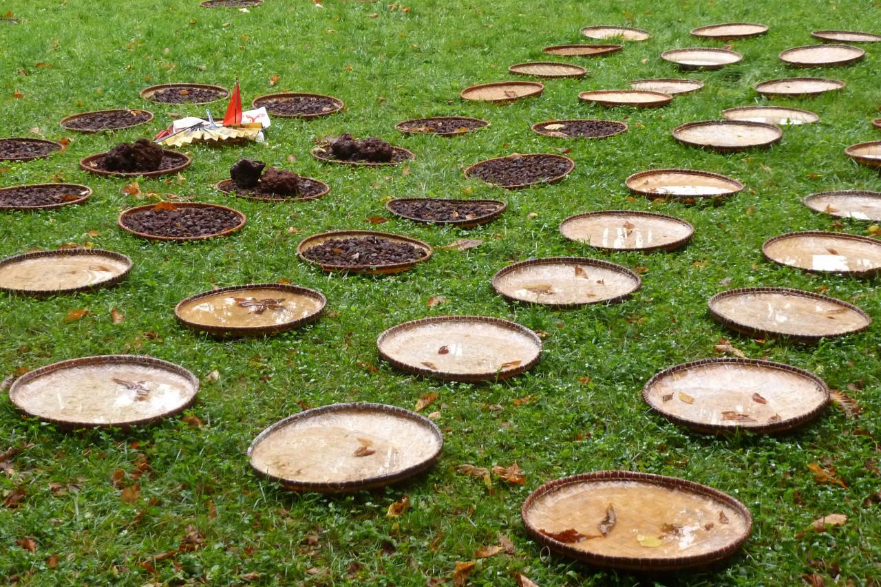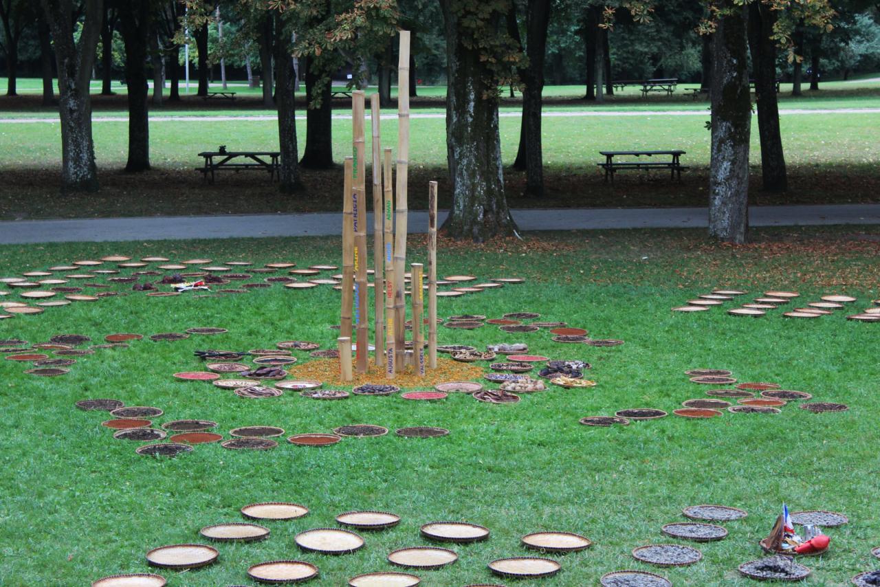 Installation in situ de 350 vannes : eau, roches volcaniques, terres, humus, graines, curcuma et 9 bambous, prénoms gravés, technique mixte, 19 x 19 x 4,50 m.