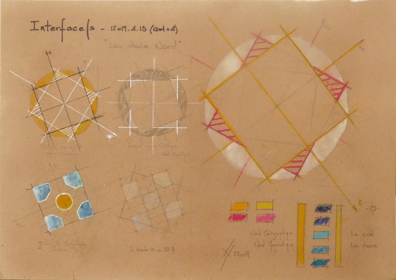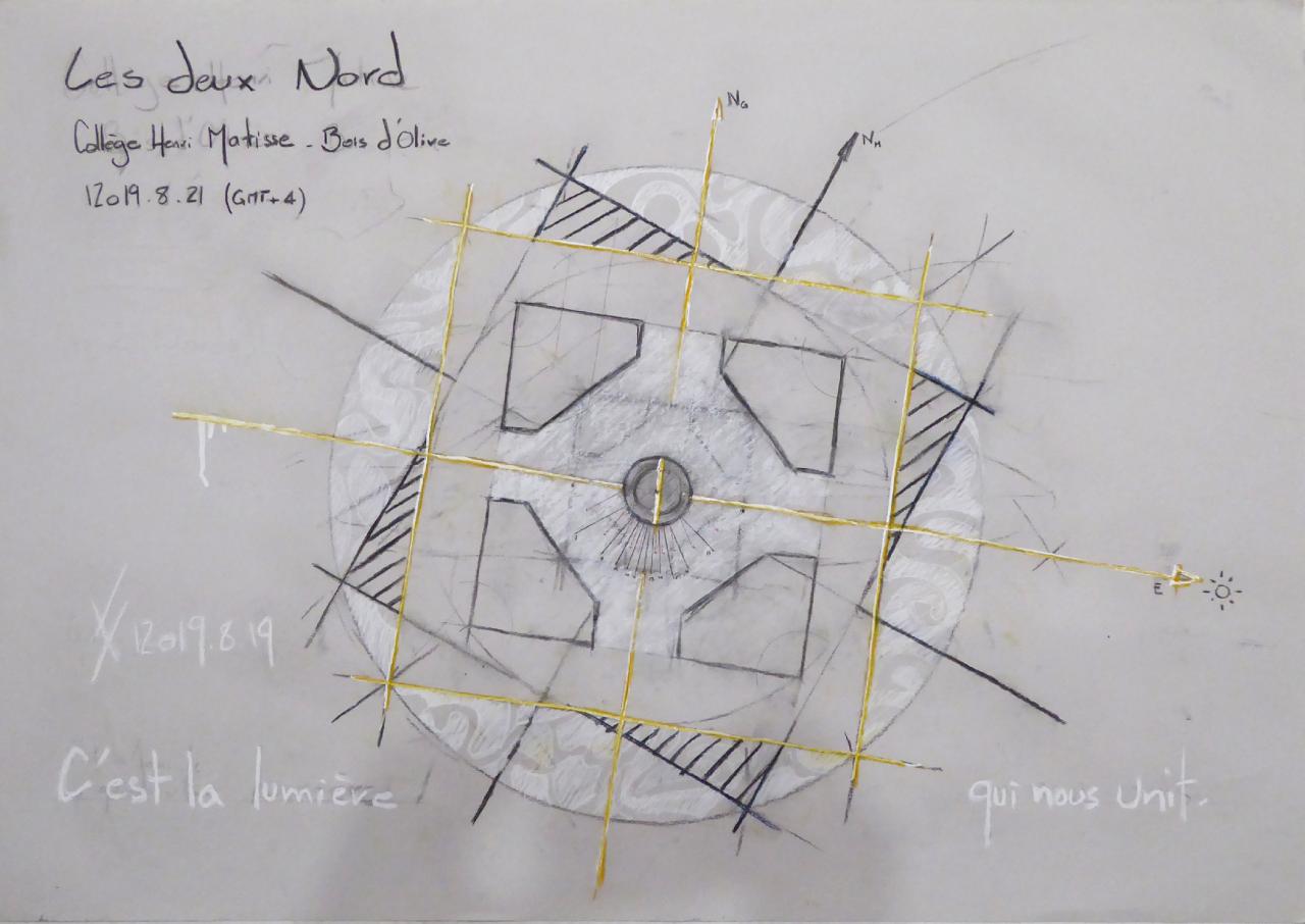 Du carré extérieur, on passe à un espace intermédiaire déambulatoire qui, au-delà de son aspect pratique (le visiteur pénètre dans l’œuvre), évoque aussi la migration continuelle des homo-sapiens depuis des millénaires.