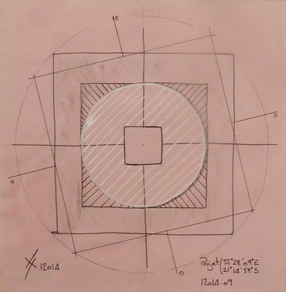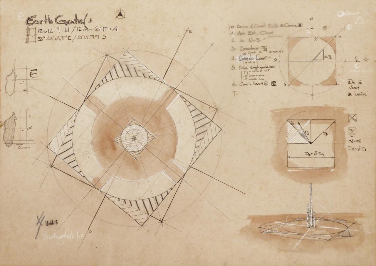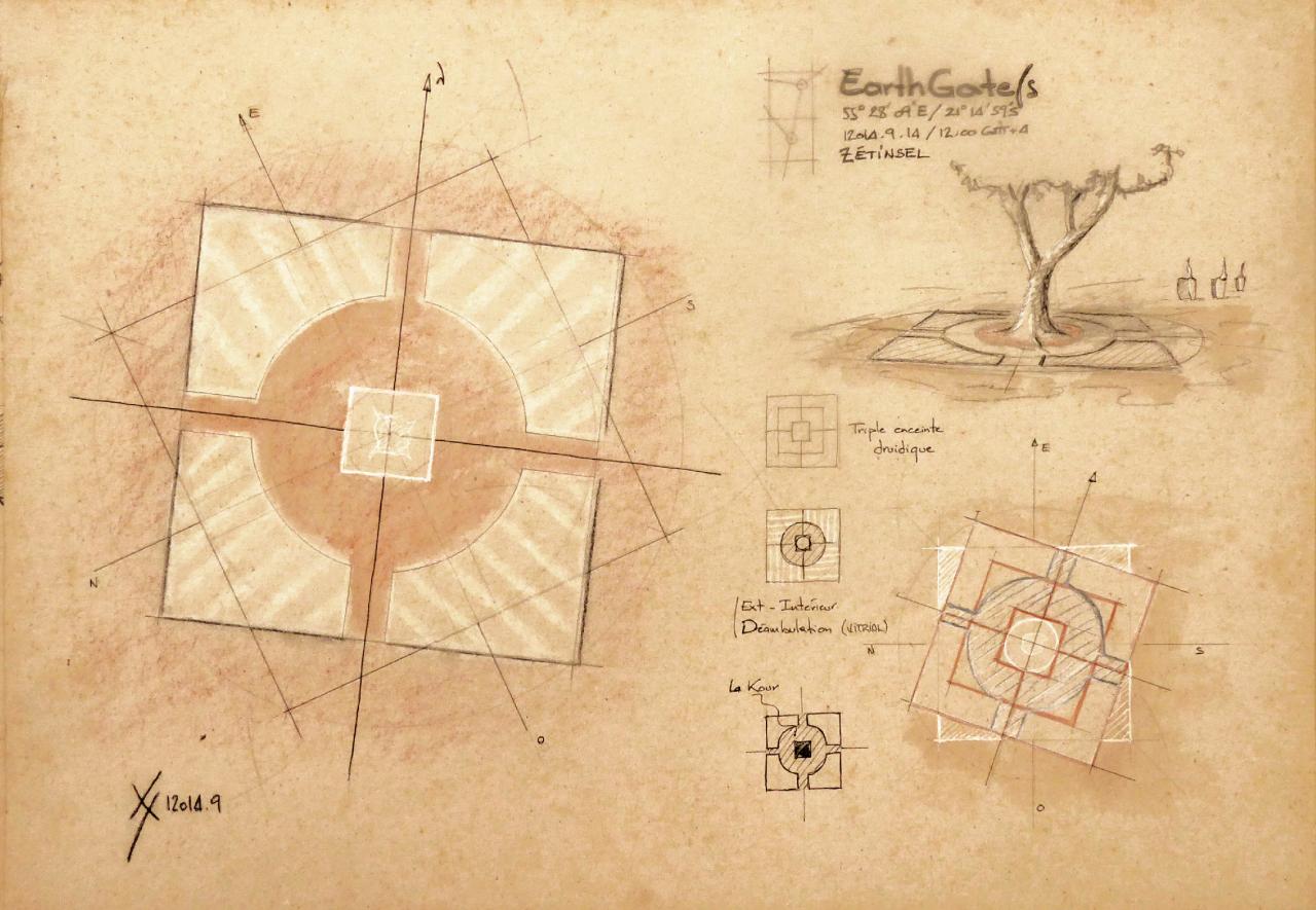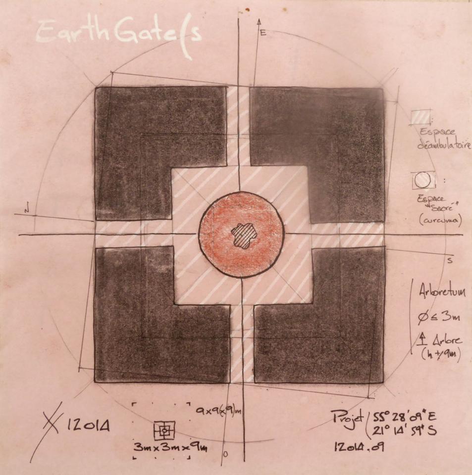 À l’intérieur du socle défini par le carré extérieur se développe le support, le substrat de la biodiversité : les terres, humus et compost forment ainsi le carré intérieur, matrice de la biodiversité végétale et animale. Ce carré s’ouvre sur un second espace déambulatoire dont les entrées font face aux 4 directions et continents qu’ils symbolisent.