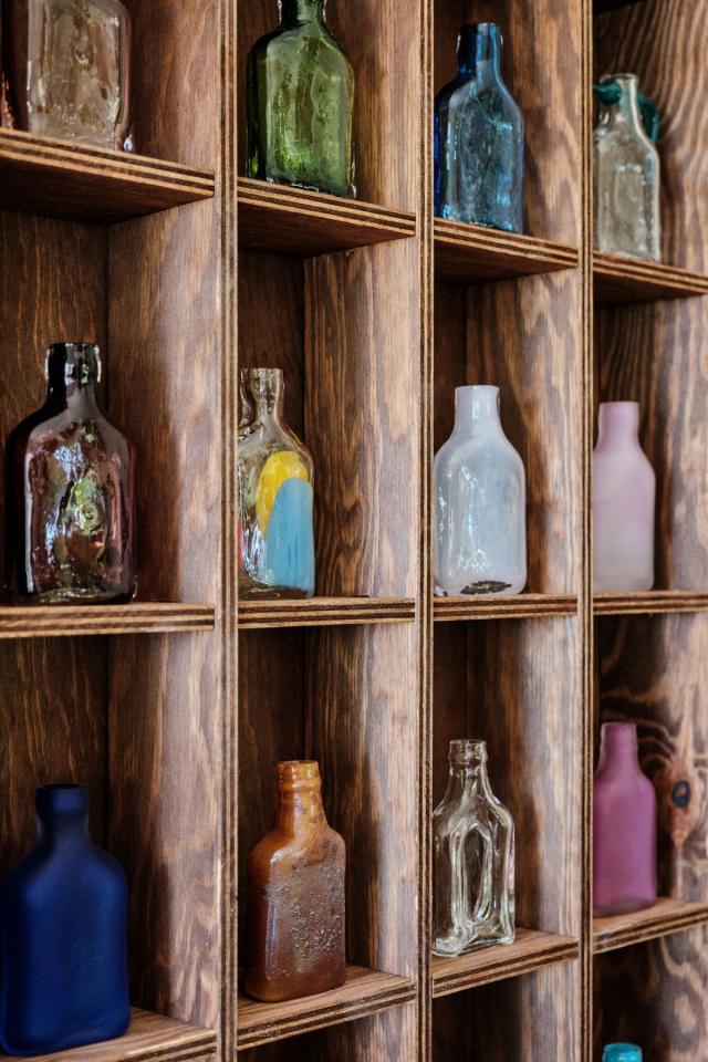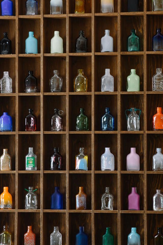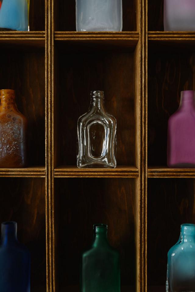 Série de 98 flasques en verre soufflé et moulé, 14 x 8 x 3 cm.