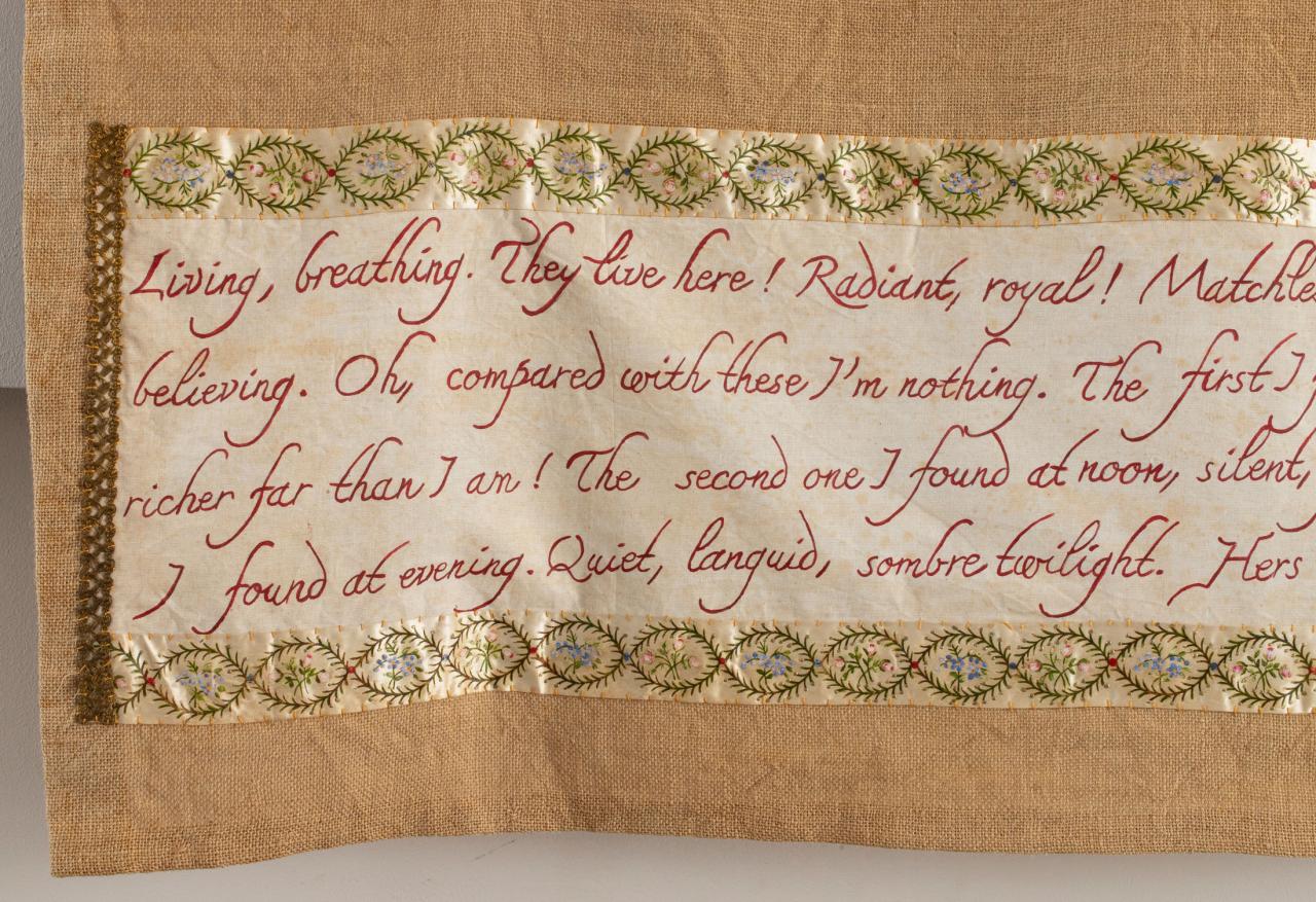Dans la troisième pièce, on quitte le récit sans perdre l’écriture. Des compositions colorées, abstraites sont composées d’assemblages de tissus anciens, de bribes d’un trousseau familial danois, boutons de nacre et broderies fragiles, de tissus aux trames presque translucides montés à l’envers et dont les déchirures dessinent des paysages démontés, de phrases tristes, rudes, mais sans nostalgie : « Si seul que je fais bouger mon ombre pour voir », ou encore :« Puisqu’il le faut, entraînons-nous à mourir à l’ombre des fleurs. » Le texte est central chez Térésa Small, comme si le travail du théâtre était encore là, depuis la perspective de la costumière, habilleuse des corps qui incarnent un récit, avec des paroles qui ne sont pas les leurs. Térésa Small elle aussi semble habitée, traversée, comme habillée d’autres voix, d’autres auteur·ices qui l’accompagnent.