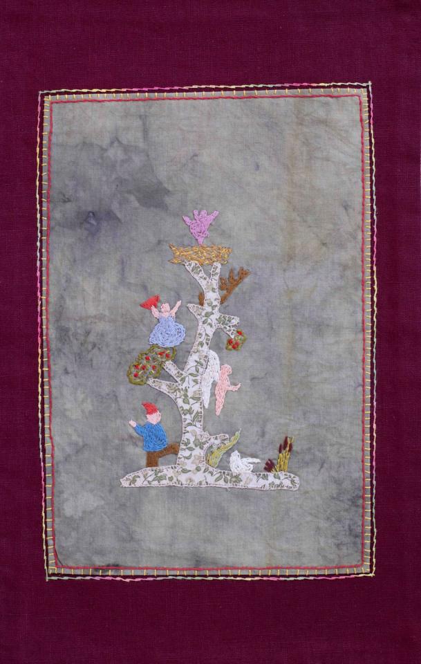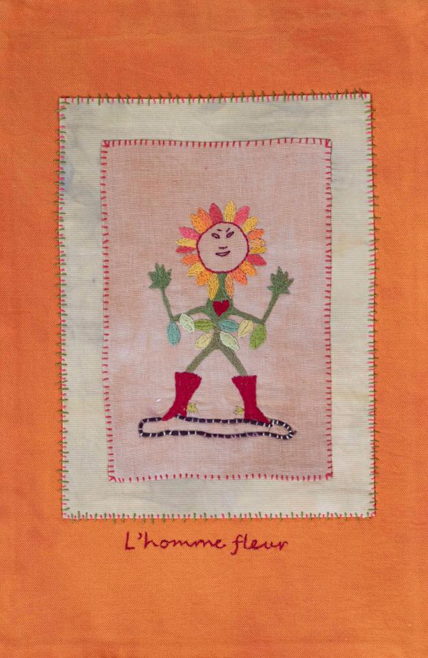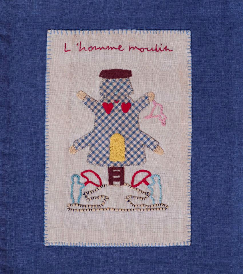 Ici, Térésa Small travaille à un vaste ensemble de plus petites toiles intitulées Papirklip, « papiers découpés » en danois. Elle s’inspire de cette activité d’Andersen, moins identifiée et pourtant si joyeuse, si quotidienne, et prolonge la modestie de cette technique avec les moyens de la couture. Sur chaque toile, elle brode une phrase, un personnage, une architecture – l’« Homme-Fleur », l’« Homme-Moulin », l’« Arbre aux Figurines3